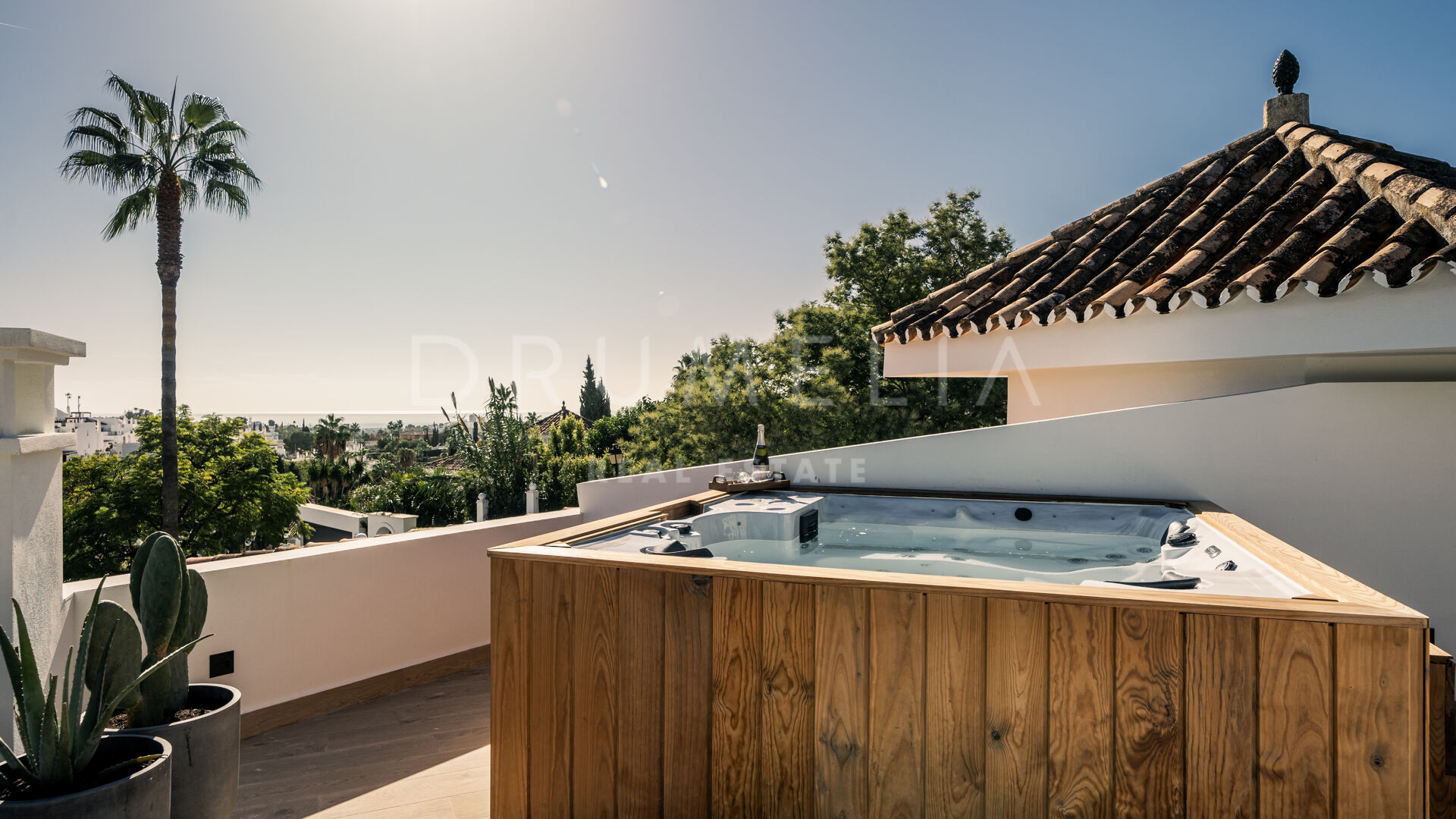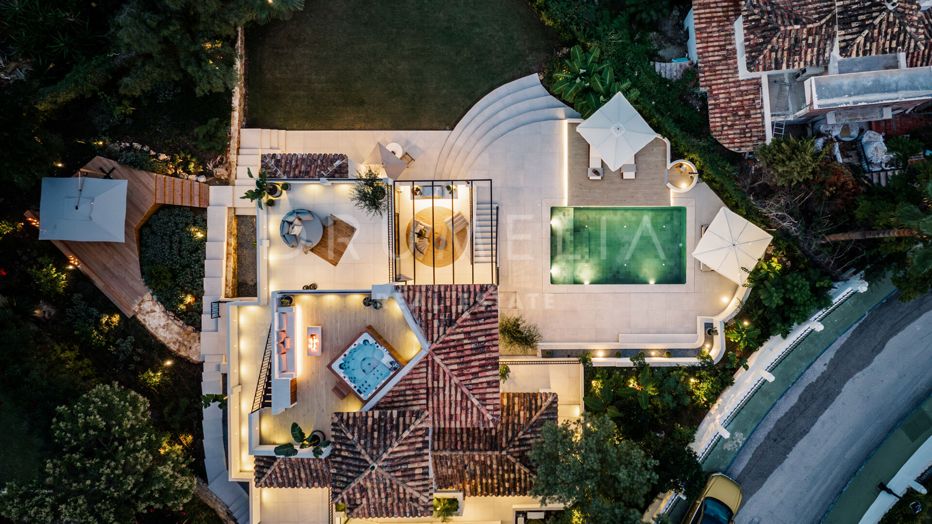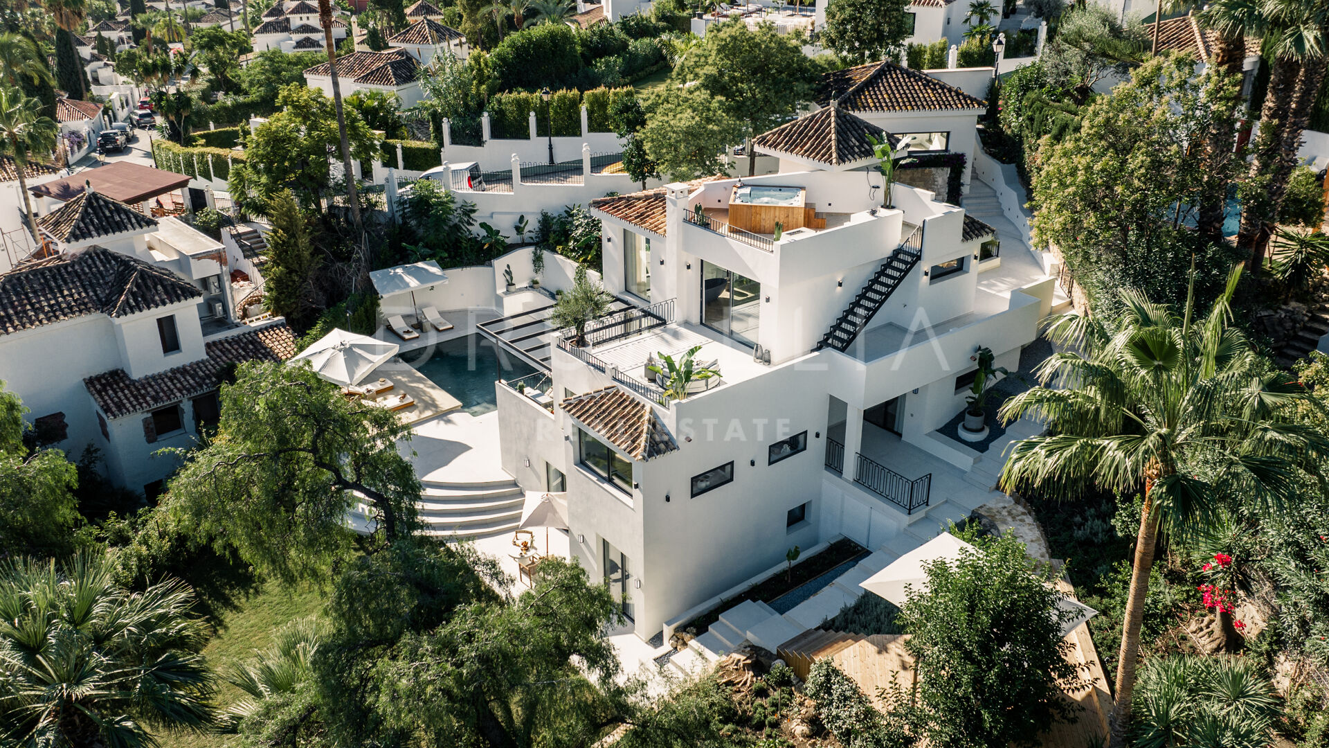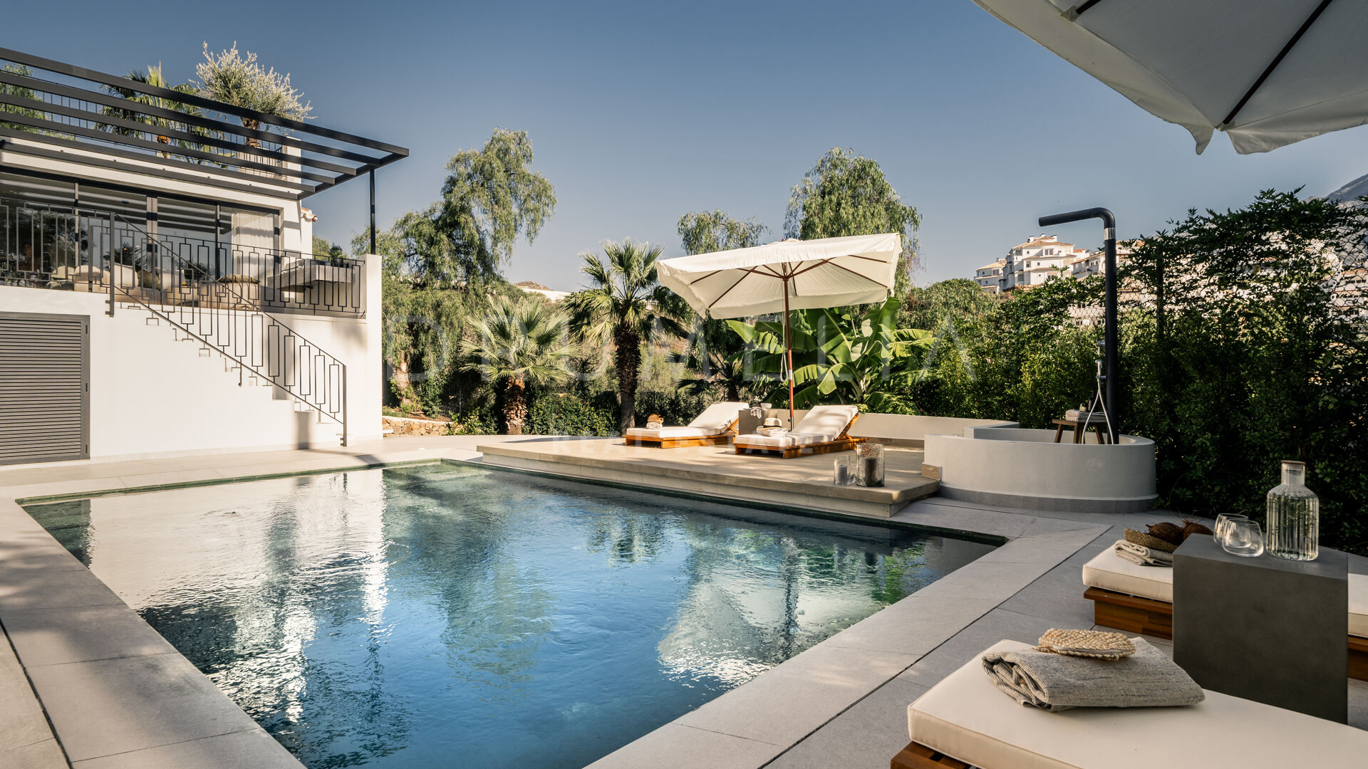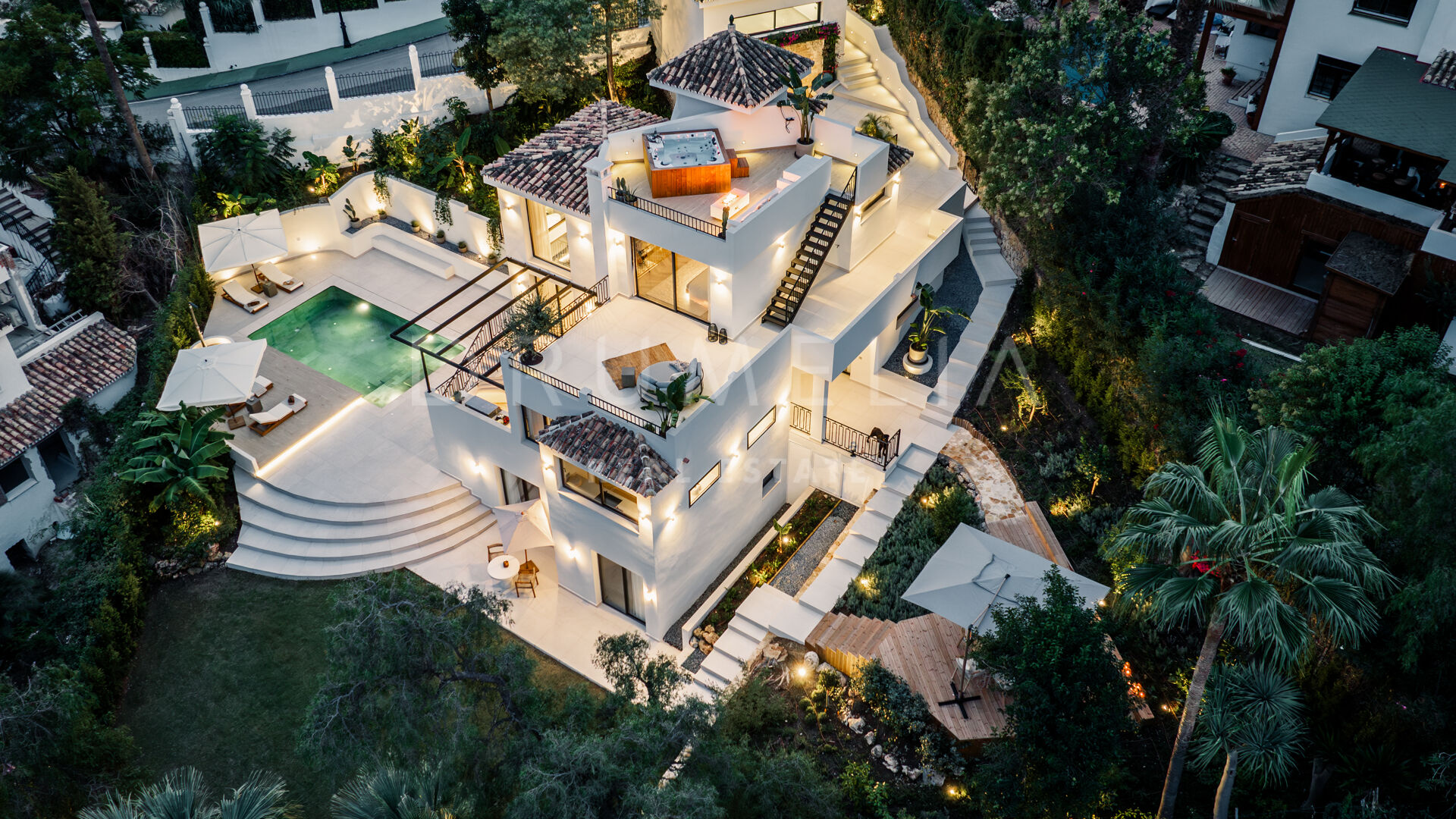 Des portes vitrées donnent accès aux jardins paysagers, aux terrasses, aux sièges, aux bains de soleil et aux salles à manger en plein air. Les espaces ouverts de la maison invitent au style de vie méditerranéen mondialement connu. L’imposante piscine vous permettra de vous rafraîchir ou d’organiser une superbe fête. Imaginez une soirée romantique au coin du feu – et pas seulement dans le confortable salon de télévision de la villa, mais sous les étoiles. Un bio-foyer atmosphérique vous attend dans le solarium sur le toit. Vous pourrez y siroter des martinis ou du champagne dans le jacuzzi tout en admirant la vue magnifique sur la montagne légendaire de La Concha. La nature luxuriante environnante vous offrira une intimité bienvenue. Après le coucher du soleil, un système d’éclairage LED innovant et très fonctionnel transforme l’extérieur de la maison en une œuvre d’art, ajoutant une touche magique de conte de fées.