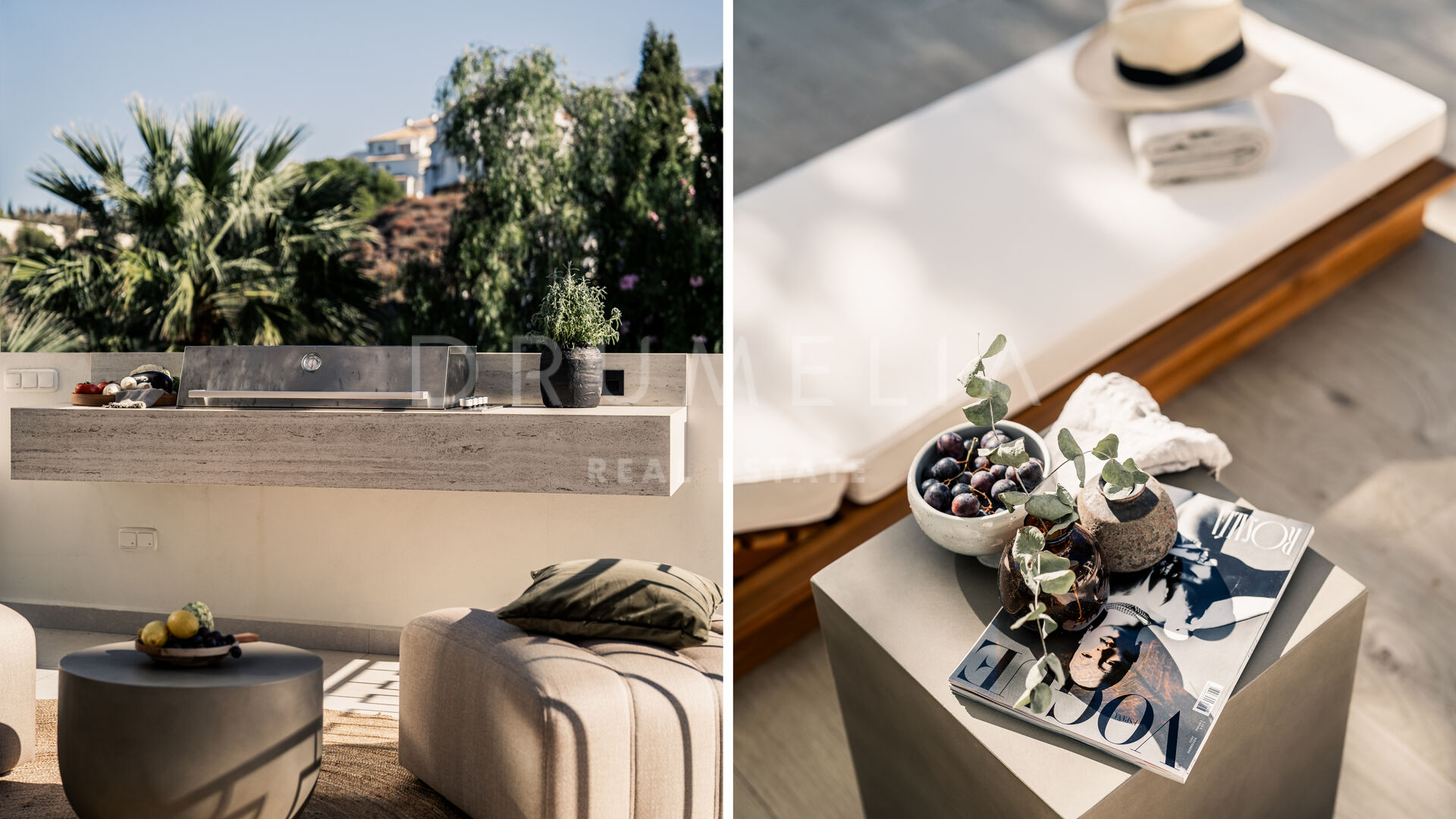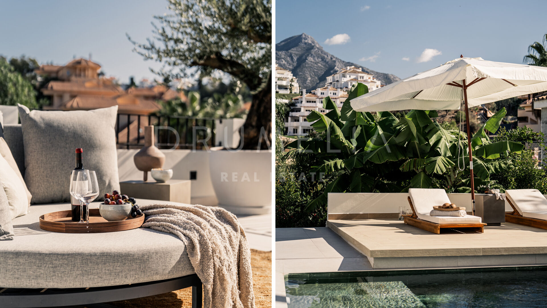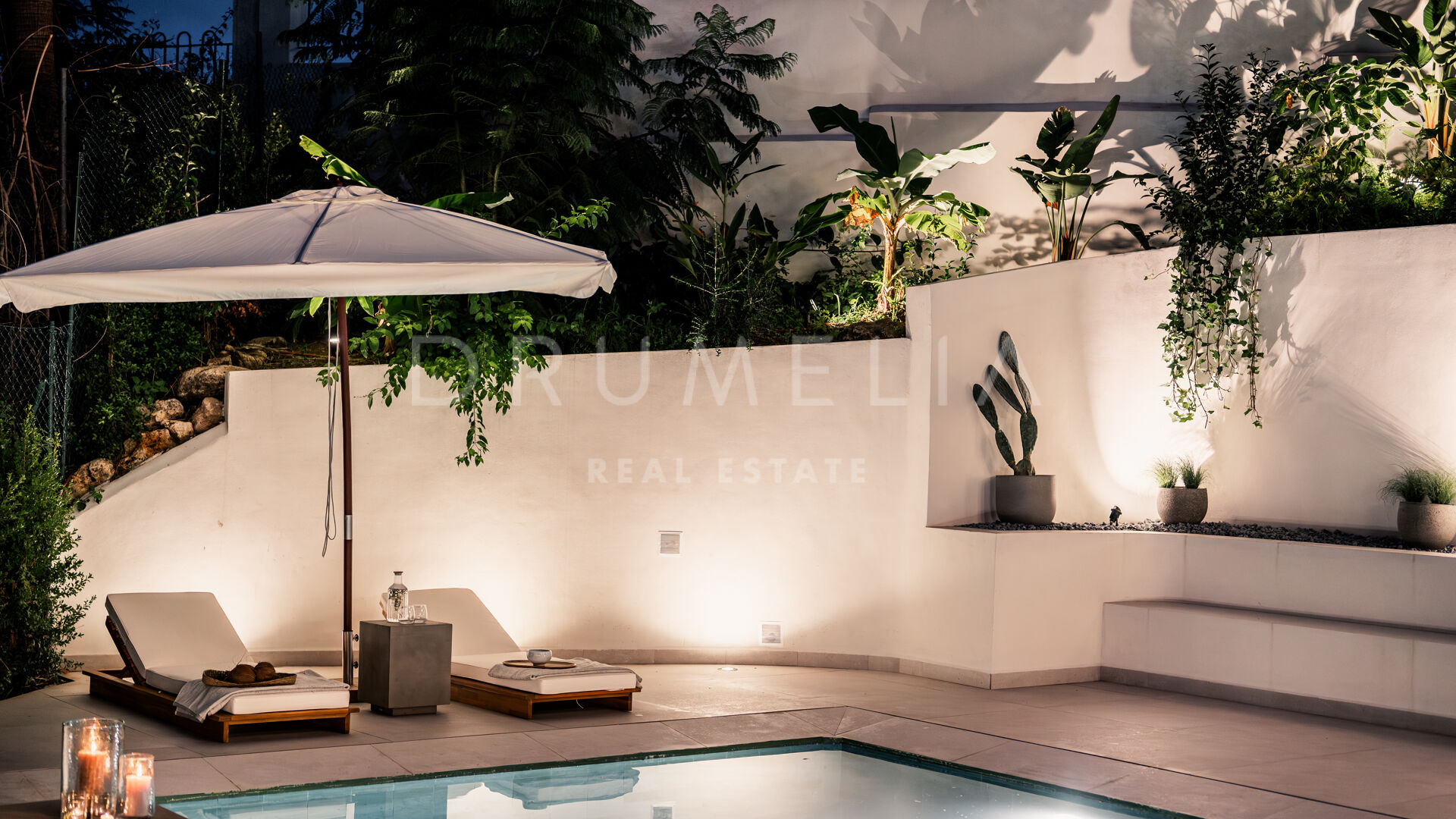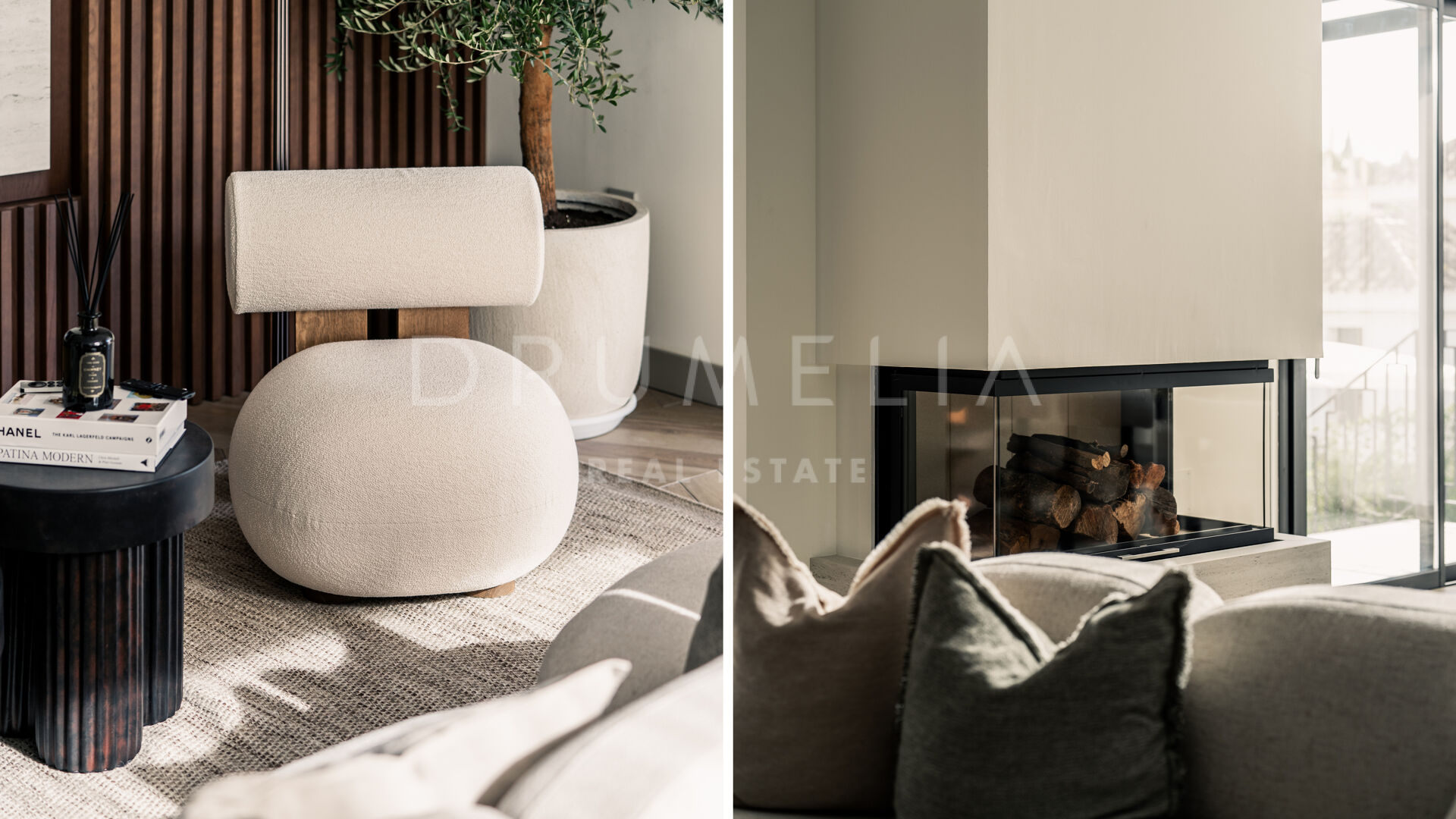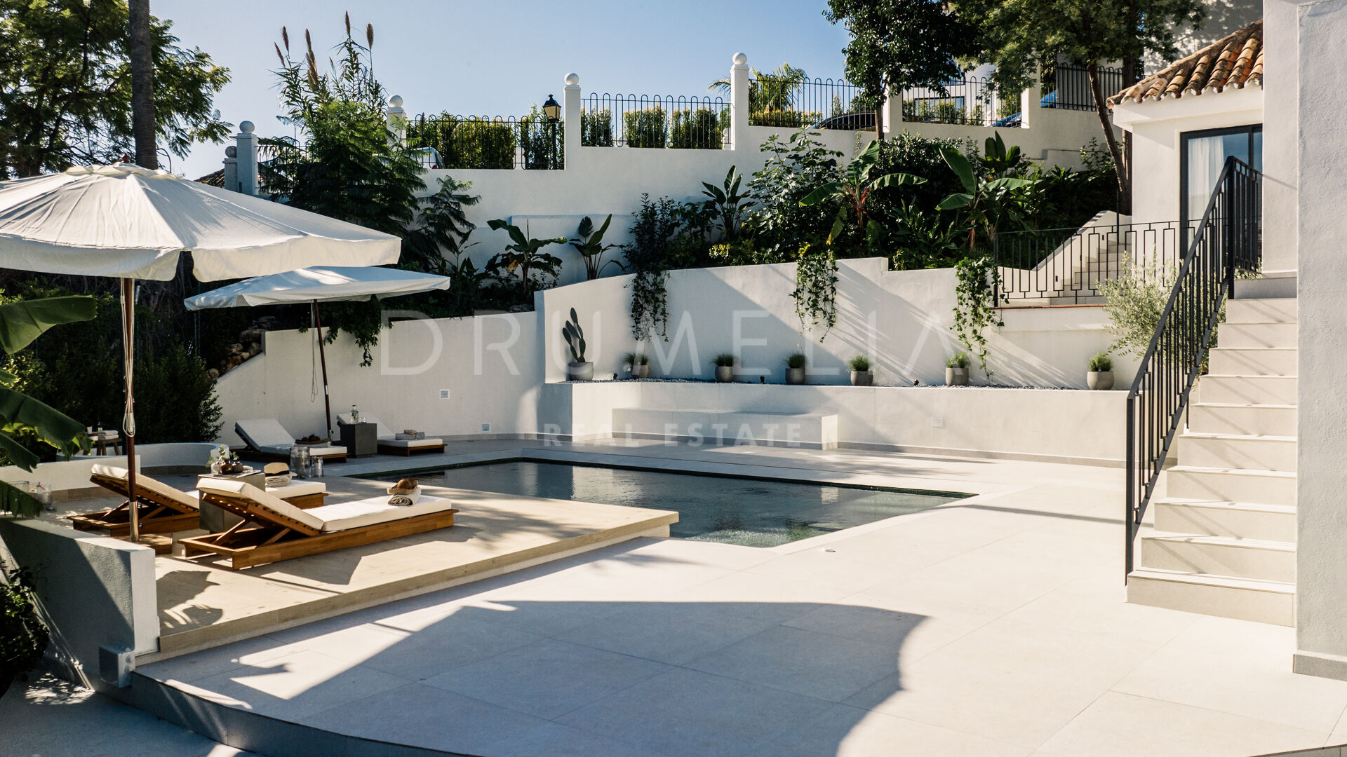 Des portes vitrées donnent accès aux jardins paysagers, aux terrasses, aux sièges, aux bains de soleil et aux salles à manger en plein air. Les espaces ouverts de la maison invitent au style de vie méditerranéen mondialement connu. L’imposante piscine vous permettra de vous rafraîchir ou d’organiser une superbe fête. Imaginez une soirée romantique au coin du feu – et pas seulement dans le confortable salon de télévision de la villa, mais sous les étoiles. Un bio-foyer atmosphérique vous attend dans le solarium sur le toit. Vous pourrez y siroter des martinis ou du champagne dans le jacuzzi tout en admirant la vue magnifique sur la montagne légendaire de La Concha. La nature luxuriante environnante vous offrira une intimité bienvenue. Après le coucher du soleil, un système d’éclairage LED innovant et très fonctionnel transforme l’extérieur de la maison en une œuvre d’art, ajoutant une touche magique de conte de fées.