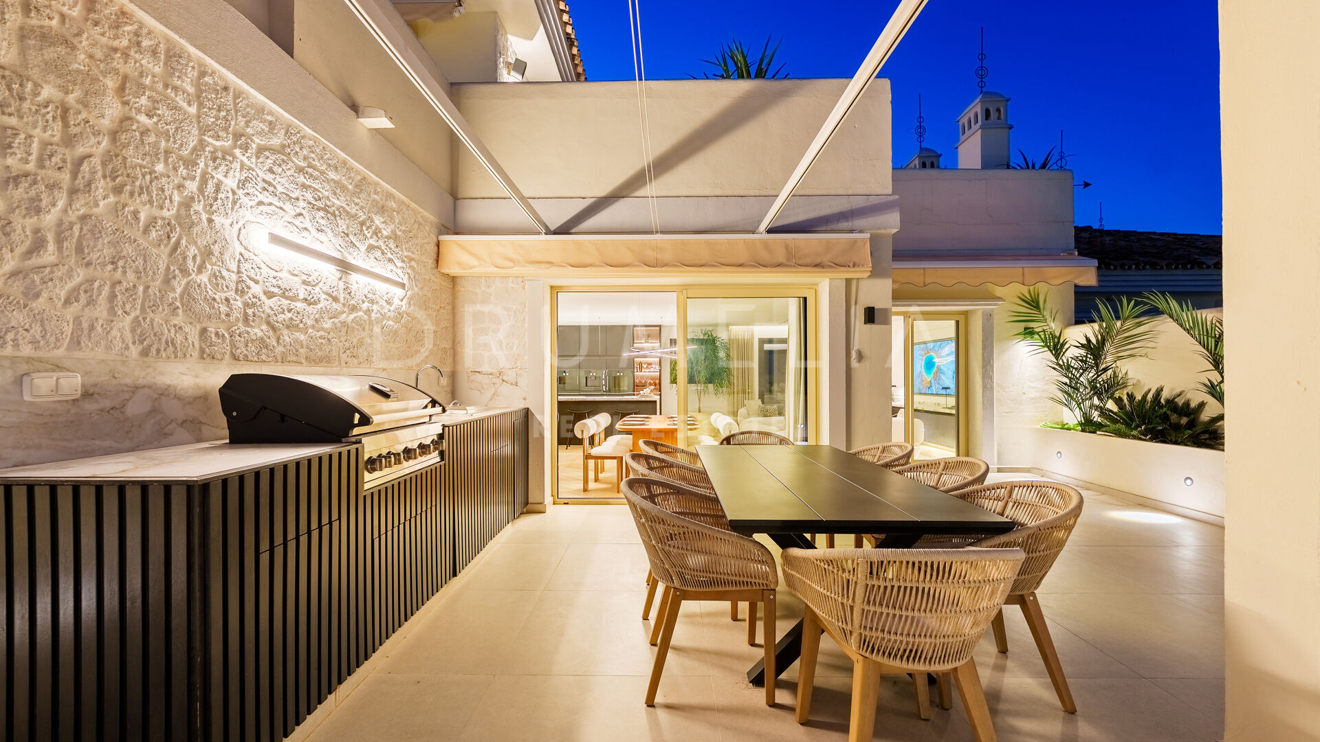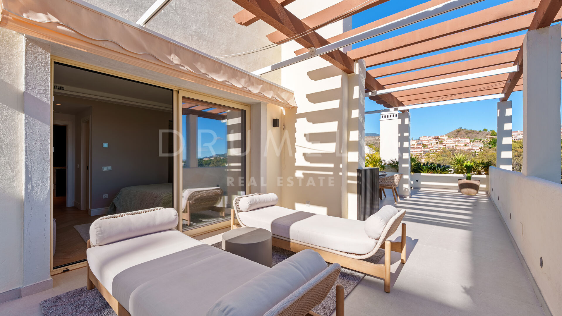 Ce penthouse duplex exceptionnel, commercialisé en exclusivité, est situé dans le prestigieux complexe Palacetes de los Belvederes à Nueva Andalucía, Marbella. La propriété a été récemment rénovée et combine harmonieusement un design contemporain avec une esthétique scandinave raffinée, créant une atmosphère à la fois sophistiquée et accueillante. Avec une surface construite de 183 m² et de vastes terrasses totalisant 181 m², la propriété offre une expérience résidentielle où les espaces intérieurs et extérieurs se fondent naturellement.