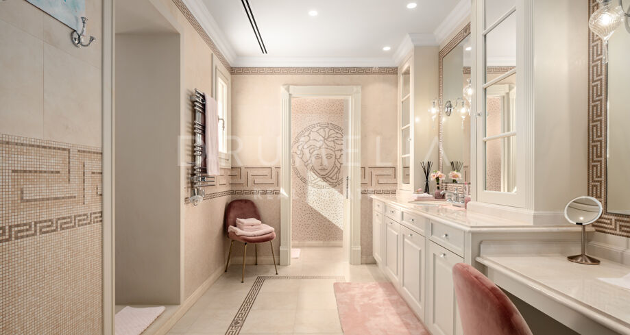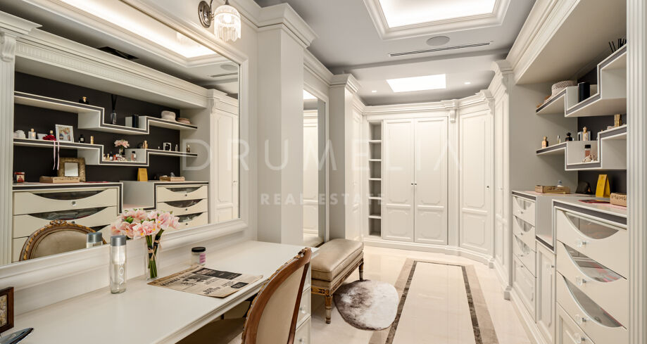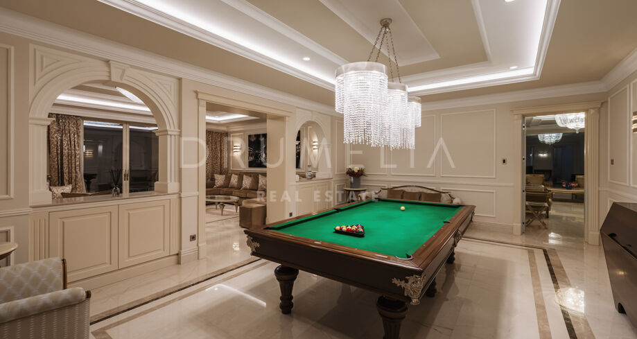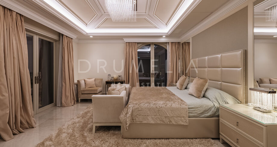 L’architecte a mis l’accent sur l’éclairage, à la fois direct et indirect, qui renforce la sensation d’espace, complétée par des plafonds d’une hauteur impressionnante dans l’ensemble de la maison. Cette demeure haut de gamme, en excellent état, est dotée de nombreux équipements de luxe, notamment un système Smart Home, un chauffage par le sol, du double vitrage, un système d’alarme, l’air conditionné et des armoires encastrées. Les finitions et les matériaux sont de la plus haute qualité, avec des sols en marbre italien et des céramiques, des boiseries, des lustres faits à la main et des éclairages LED sophistiqués.