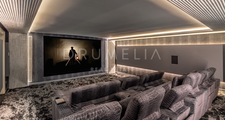 L’opulente suite de maître dispose d’une salle de bains et d’un dressing pour elle et lui, d’un salon et d’une superbe terrasse offrant une vue imprenable sur la mer. En outre, il y a quatre chambres familiales, chacune avec une salle de bains, un dressing, un salon et une terrasse privée. Le sous-sol comprend un garage pour huit voitures, une salle de cinéma de 11 places, une cave à vin et un espace spa avec piscine chauffée, jacuzzi, sauna, hammam, salle de fitness, salle de massage, salle de bains et deux douches. Les locaux du personnel sont également situés au sous-sol et se composent de deux appartements séparés d’une chambre à coucher, d’une salle à manger, d’une buanderie et d’un local technique.