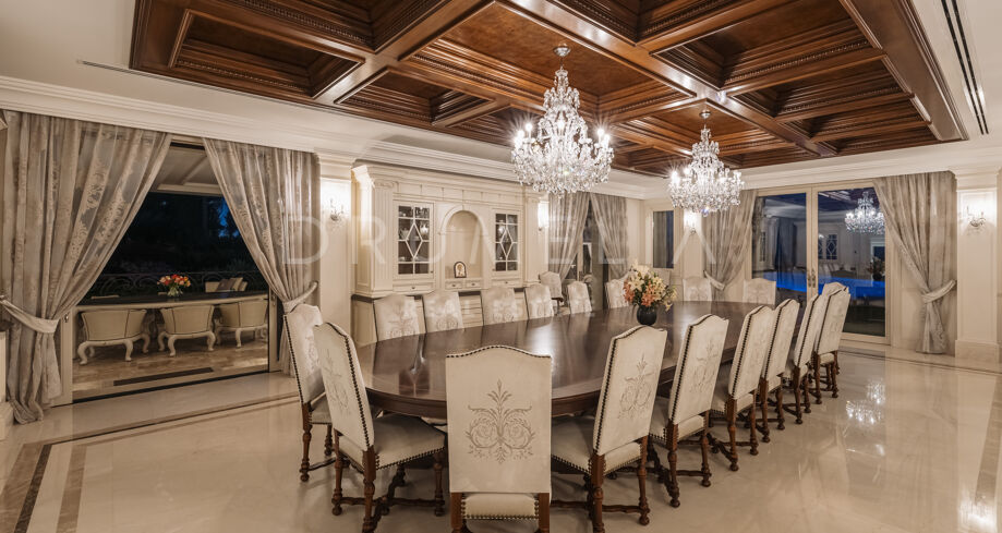 Située sur un terrain spacieux et bien distribué de 5 850 m², cette demeure de quatre niveaux s’étend sur 2 442 m², avec 10 chambres et 13 salles de bains (dont 9 en-suite). La grande entrée néoclassique, avec ses colonnes corinthiennes, s’ouvre sur un magnifique hall d’entrée avec un double escalier majestueux et un ascenseur donnant accès à tous les étages. Le rez-de-chaussée comprend un salon avec deux cheminées, une salle à manger, une cuisine principale entièrement équipée avec un îlot central, une cuisine pour le personnel, un bureau, une réserve, deux toilettes pour les invités, une salle de jeux avec un bar, une salle de télévision et trois chambres d’invités avec salles de bains privatives. Le salon et la salle à manger s’étendent sur des terrasses couvertes (d’une superficie totale de 836 m²) et un grand espace barbecue, idéal pour les repas en plein air et les réceptions. Les jardins magnifiquement aménagés sont dotés d’une impressionnante piscine à débordement, de bains de soleil, de jeux d’eau et de vastes pelouses.