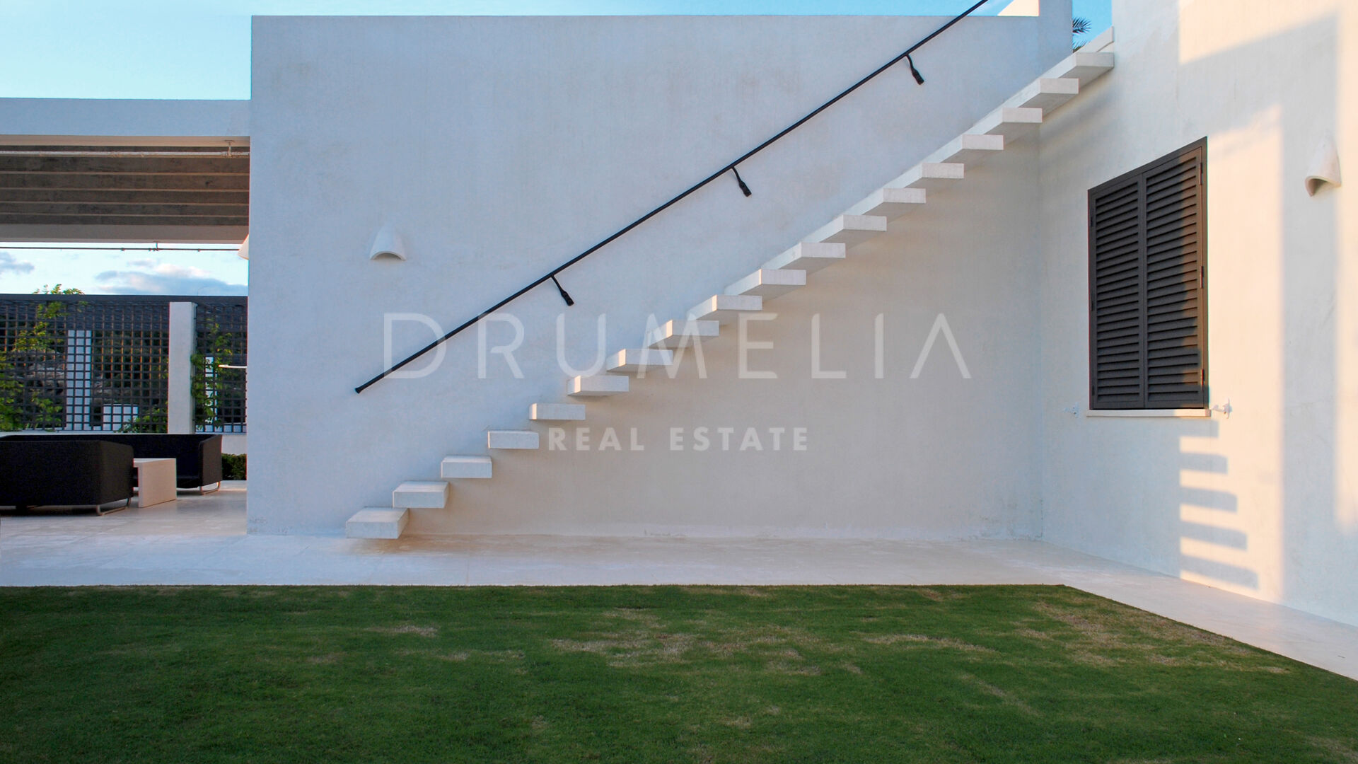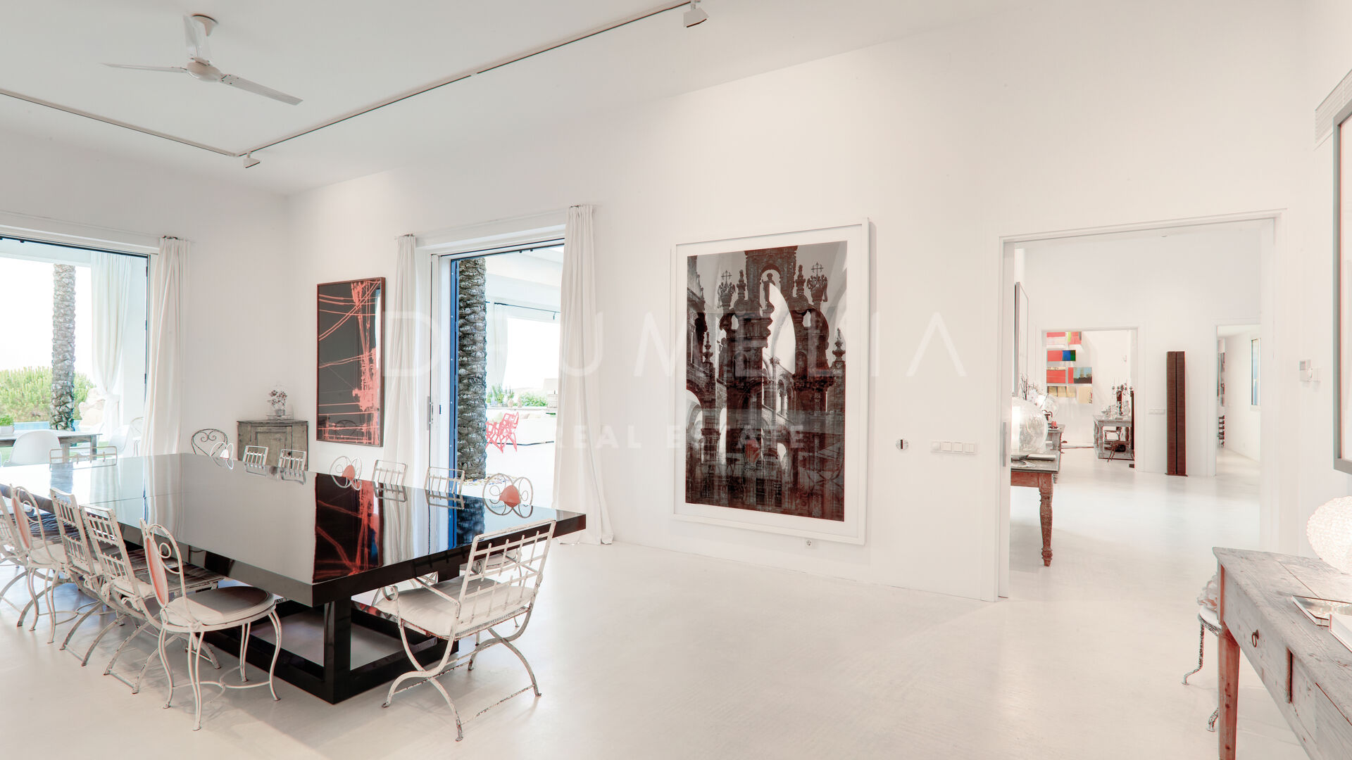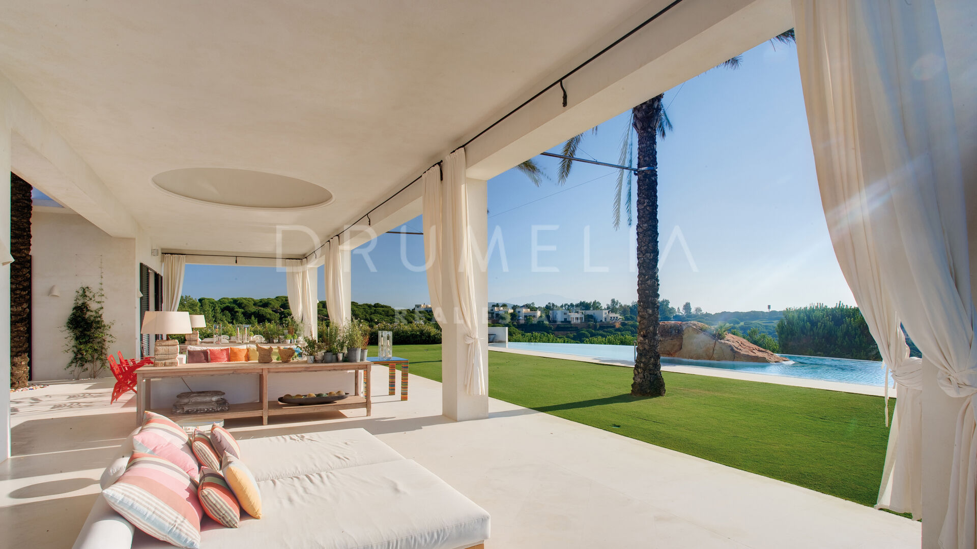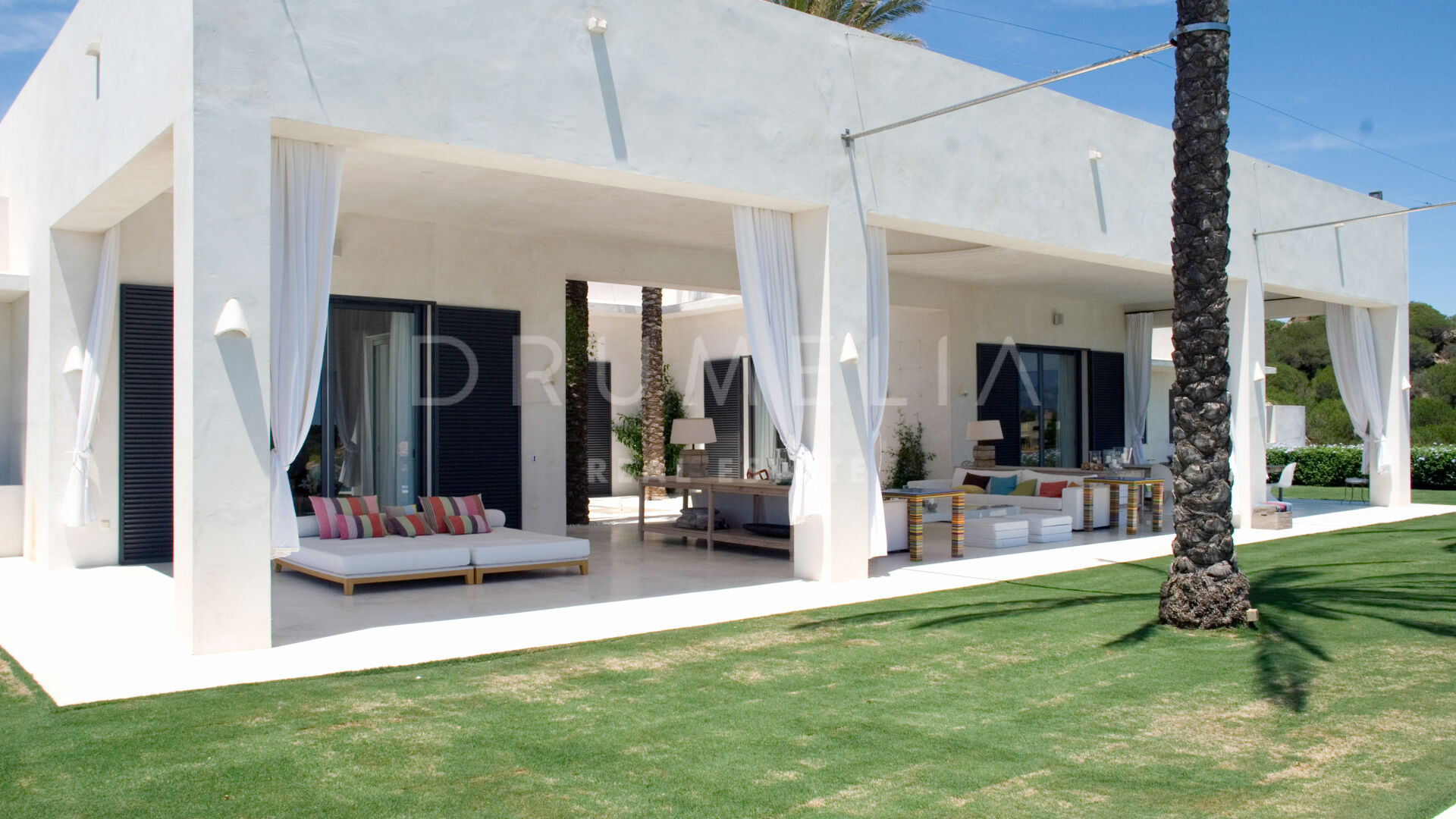 La maison principale se compose d’un salon et d’une salle à manger avec une grande table conçue par le designer d’intérieur qui domine la pièce ; de 4 suites de chambres sereines ; d’une salle de jeux ; d’une buanderie ; d’une cuisine élégante de style minimaliste, qui communique avec la salle à manger al fresco ; d’une cour et de terrasses étonnantes. Pour le revêtement de sol, un pavé industriel lisse ne nécessitant aucun joint a été employé, réalisant ainsi une union entre toutes les zones. L’impressionnante chambre principale comprend un dressing, une salle de bain en-suite et une douche d’été. Le porche principal donne sur la piscine privée. Le concept de son mobilier découle du sentiment d’être presque dans un salon, c’est pourquoi on lui a donné le même caractère et la même importance. L’espace Spa comprend un sauna, un vestiaire, un jacuzzi et une salle de bain. La Staff-Area dispose d’un salon, d’une cuisine, de 2 chambres et d’une salle de bain, d’une cave à vin, d’un débarras, d’un garage intérieur pour 2 voitures et d’une salle d’installation.