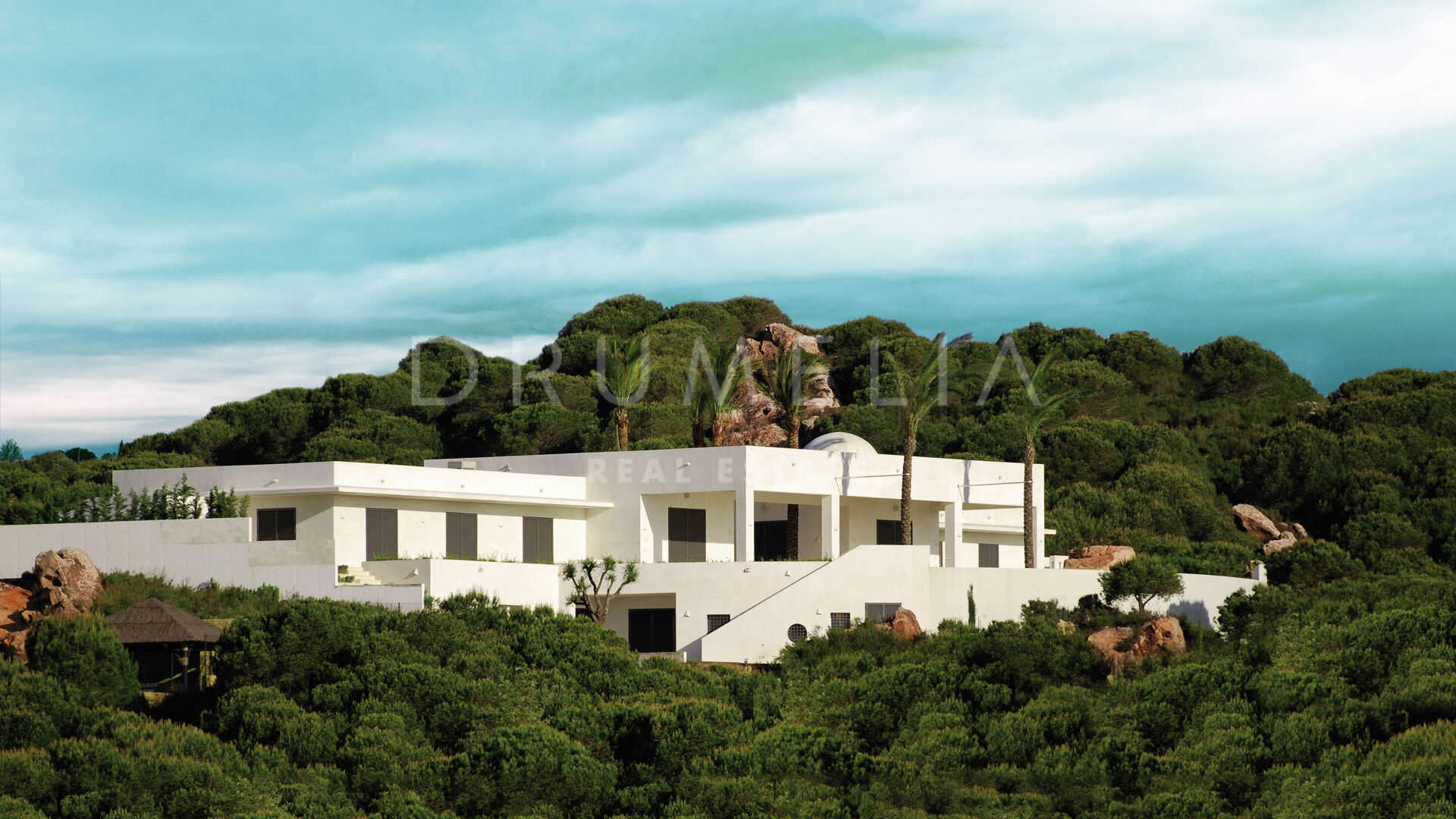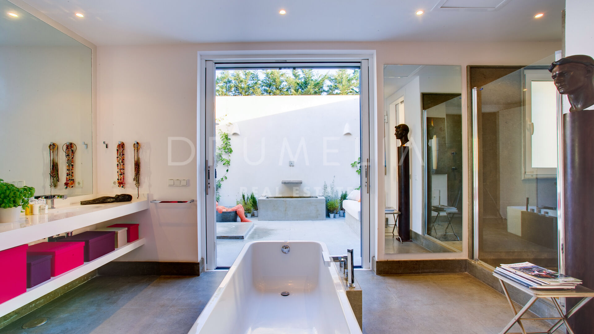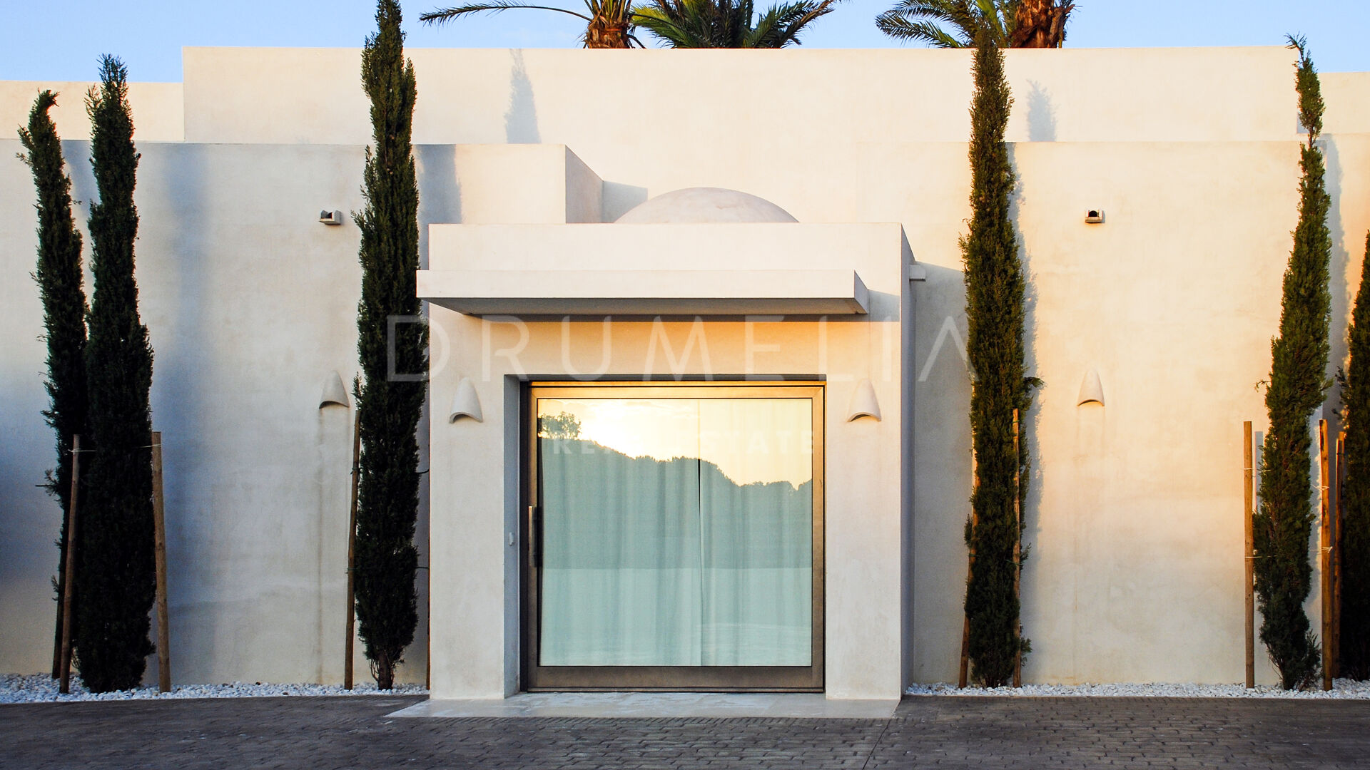 La maison principale se compose d’un salon et d’une salle à manger avec une grande table conçue par le designer d’intérieur qui domine la pièce ; de 4 suites de chambres sereines ; d’une salle de jeux ; d’une buanderie ; d’une cuisine élégante de style minimaliste, qui communique avec la salle à manger al fresco ; d’une cour et de terrasses étonnantes. Pour le revêtement de sol, un pavé industriel lisse ne nécessitant aucun joint a été employé, réalisant ainsi une union entre toutes les zones. L’impressionnante chambre principale comprend un dressing, une salle de bain en-suite et une douche d’été. Le porche principal donne sur la piscine privée. Le concept de son mobilier découle du sentiment d’être presque dans un salon, c’est pourquoi on lui a donné le même caractère et la même importance. L’espace Spa comprend un sauna, un vestiaire, un jacuzzi et une salle de bain. La Staff-Area dispose d’un salon, d’une cuisine, de 2 chambres et d’une salle de bain, d’une cave à vin, d’un débarras, d’un garage intérieur pour 2 voitures et d’une salle d’installation.
