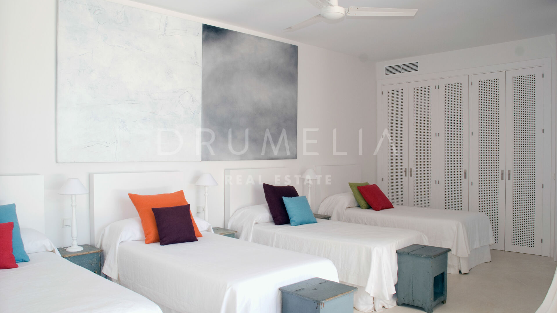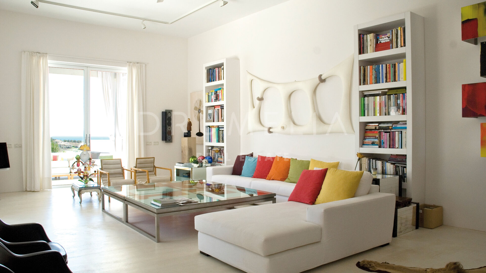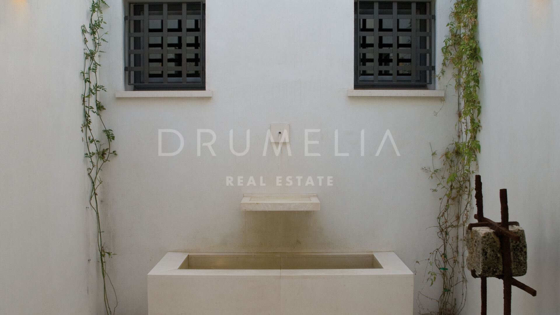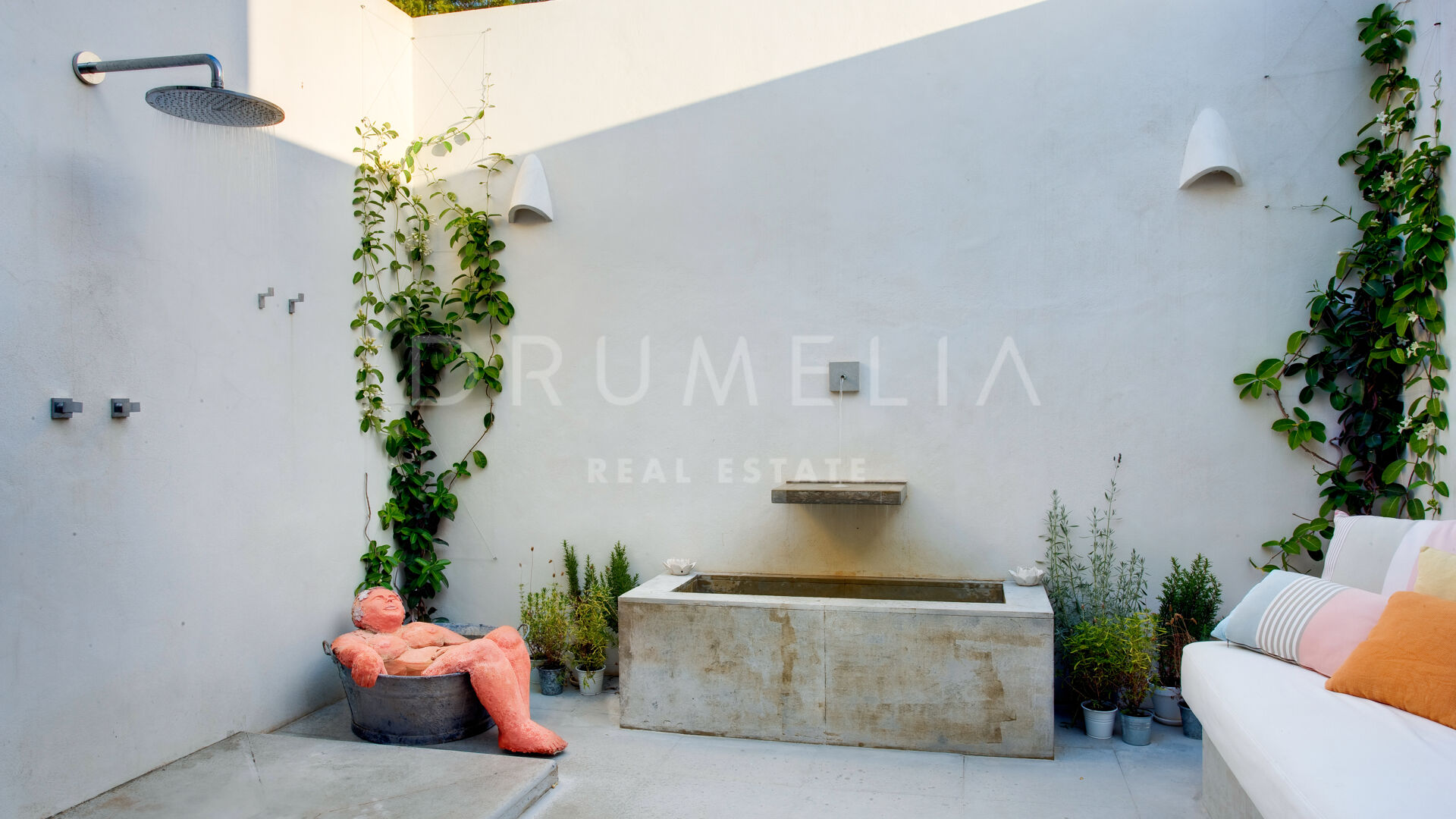 La maison principale se compose d’un salon et d’une salle à manger avec une grande table conçue par le designer d’intérieur qui domine la pièce ; de 4 suites de chambres sereines ; d’une salle de jeux ; d’une buanderie ; d’une cuisine élégante de style minimaliste, qui communique avec la salle à manger al fresco ; d’une cour et de terrasses étonnantes. Pour le revêtement de sol, un pavé industriel lisse ne nécessitant aucun joint a été employé, réalisant ainsi une union entre toutes les zones. L’impressionnante chambre principale comprend un dressing, une salle de bain en-suite et une douche d’été. Le porche principal donne sur la piscine privée. Le concept de son mobilier découle du sentiment d’être presque dans un salon, c’est pourquoi on lui a donné le même caractère et la même importance. L’espace Spa comprend un sauna, un vestiaire, un jacuzzi et une salle de bain. La Staff-Area dispose d’un salon, d’une cuisine, de 2 chambres et d’une salle de bain, d’une cave à vin, d’un débarras, d’un garage intérieur pour 2 voitures et d’une salle d’installation.