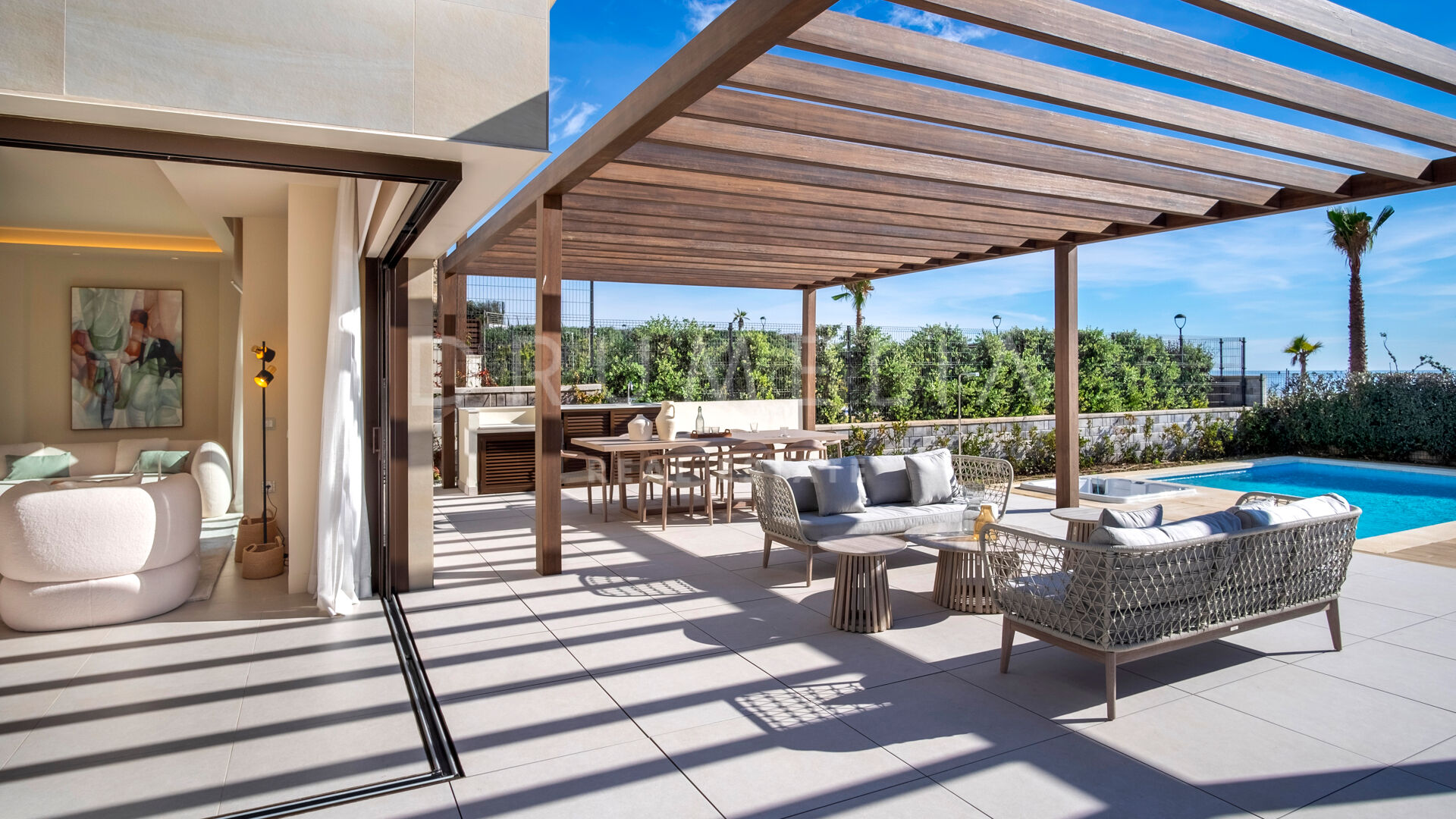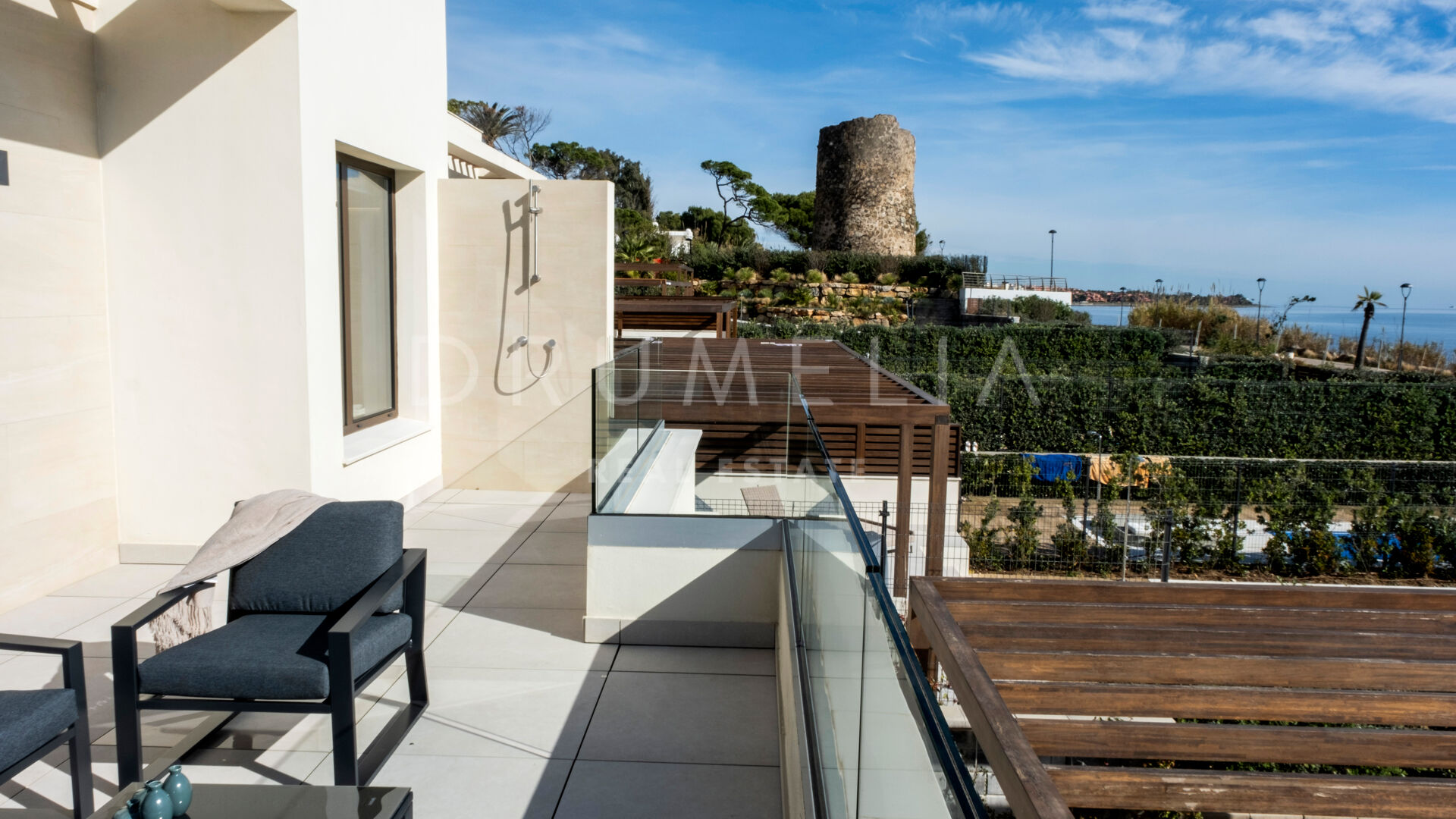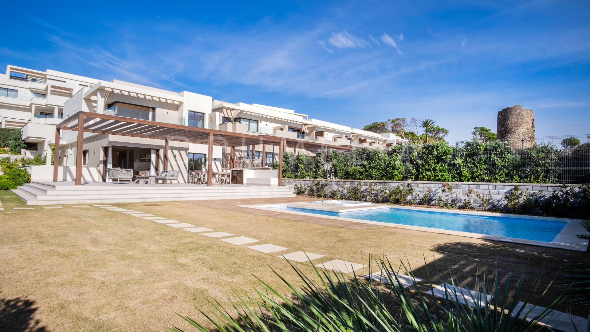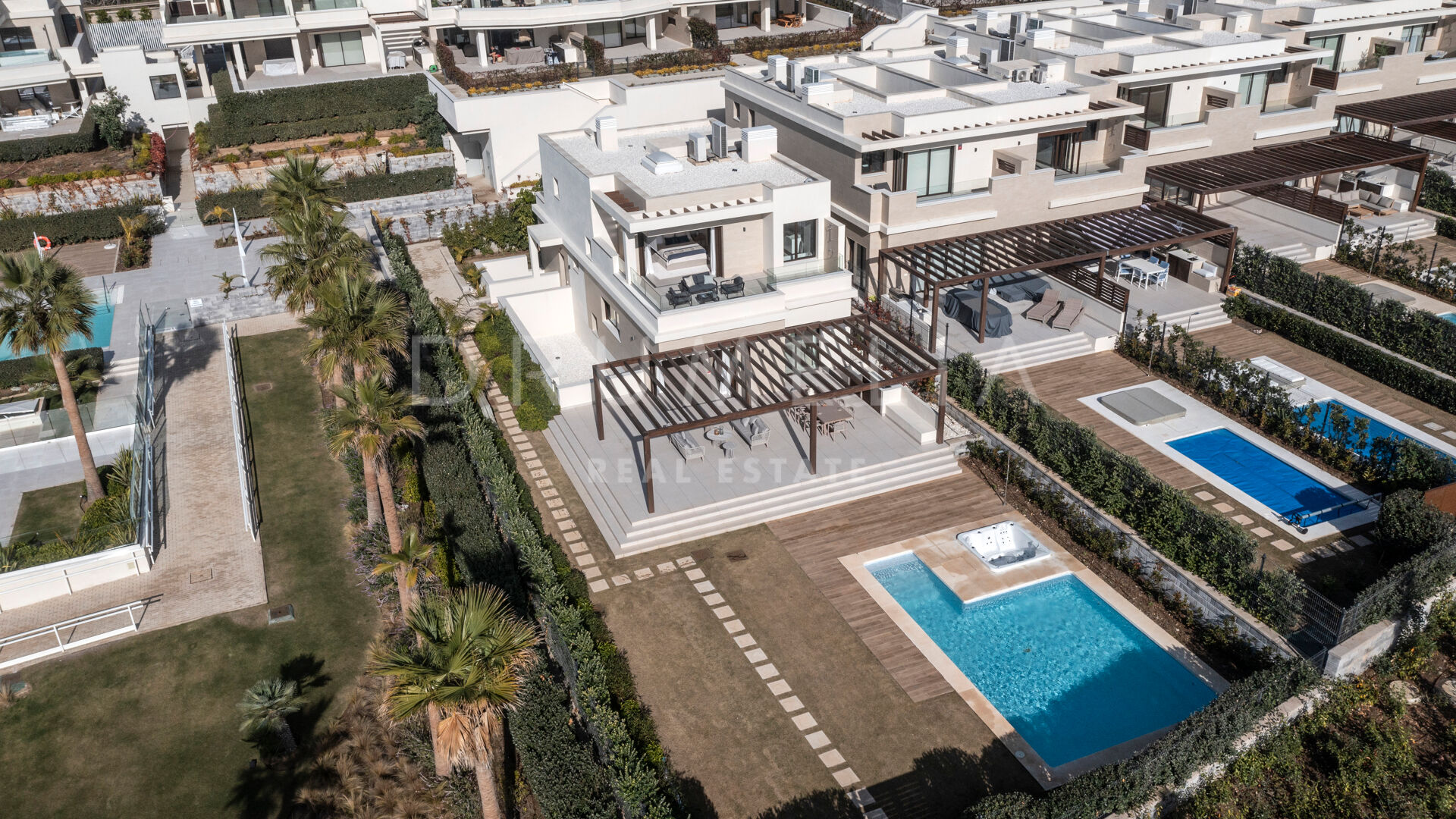 Les équipements communs de Velaya comprennent un court de tennis et de paddle, une piscine pour enfants, un jacuzzi, un espace barbecue, une piscine chauffée, des jardins en terrasse, une salle de sport, des fontaines, un accès à pied à la plage, une promenade privée, une aire de jeux pour enfants et un parking pour les invités. Cette villa offre des vues imprenables dans tous les coins, ce qui en fait une résidence vraiment exceptionnelle.