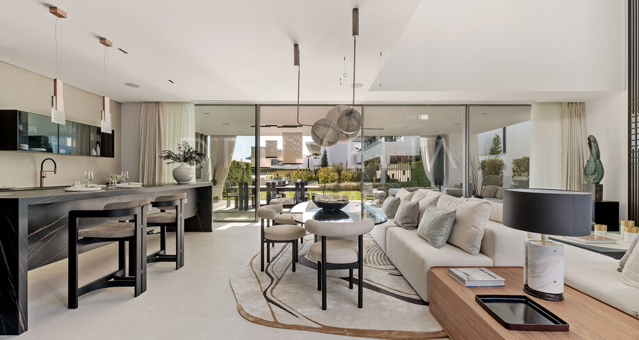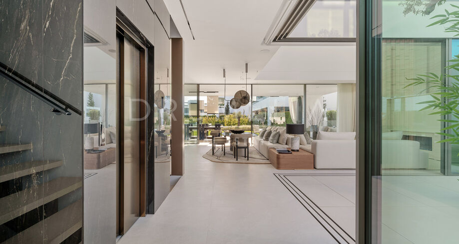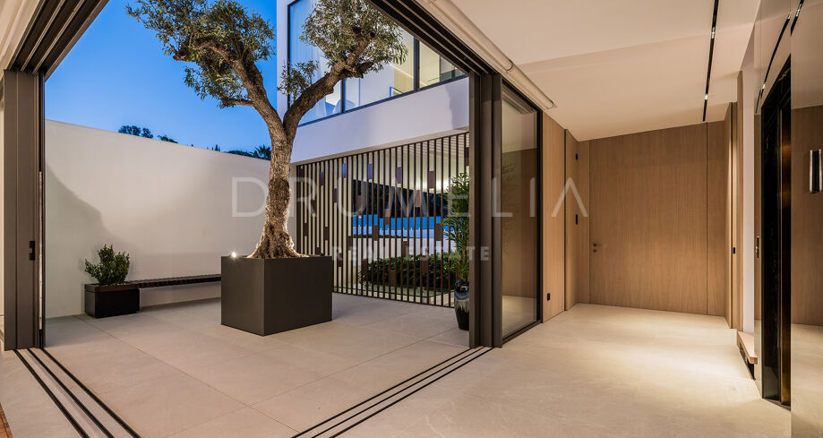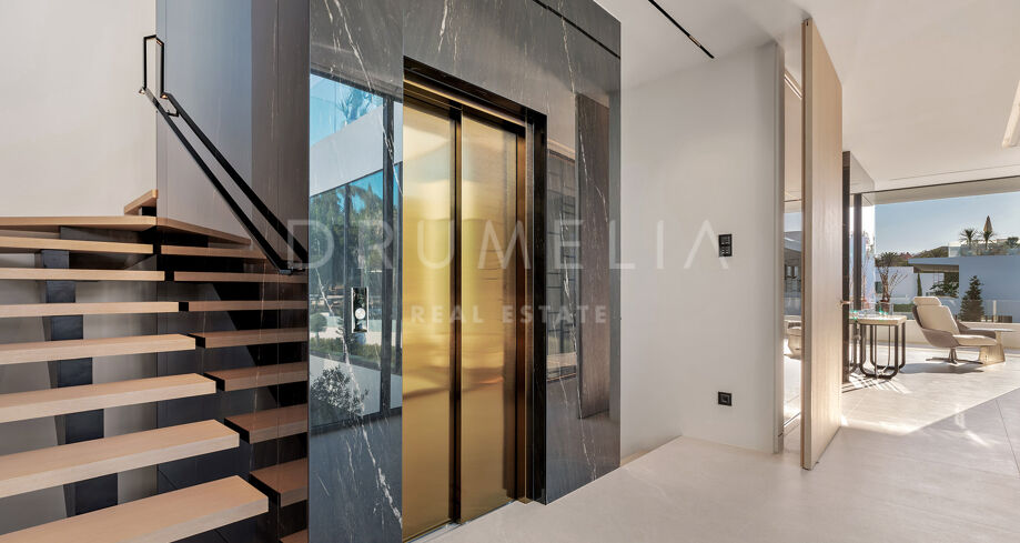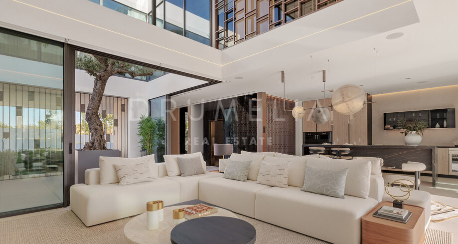 S’étendant sur quatre niveaux soigneusement conçus, la villa dispose d’un ascenseur privé reliant chaque étage. Le salon spacieux bénéficie d’une impressionnante hauteur sous plafond, créant une atmosphère lumineuse et ouverte, idéale pour recevoir des invités. Cet espace s’ouvre harmonieusement sur une terrasse élégamment aménagée, parfaite pour profiter du style de vie intérieur/extérieur caractéristique de Marbella. Au cœur de la villa se trouve un patio intérieur, agrémenté d’un olivier mature, fusionnant la nature et le design contemporain pour accentuer la sensation d’espace. La cuisine Gaggenau ultramoderne, équipée d’appareils haut de gamme, allie style et fonctionnalité, offrant ainsi un rêve pour tout chef.