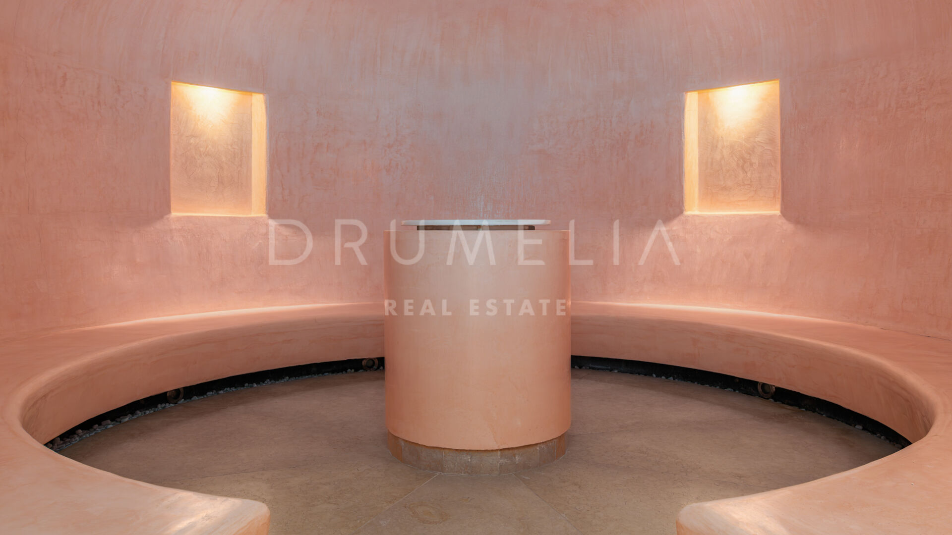A dedicated wellness area includes an indoor pool, cold-water pool, sauna, Turkish bath, and massage room. A cinema and game room provide additional leisure space. Outdoor living is highlighted by landscaped gardens, a large pool, an outdoor bar, al-fresco dining areas, and a pizza oven.