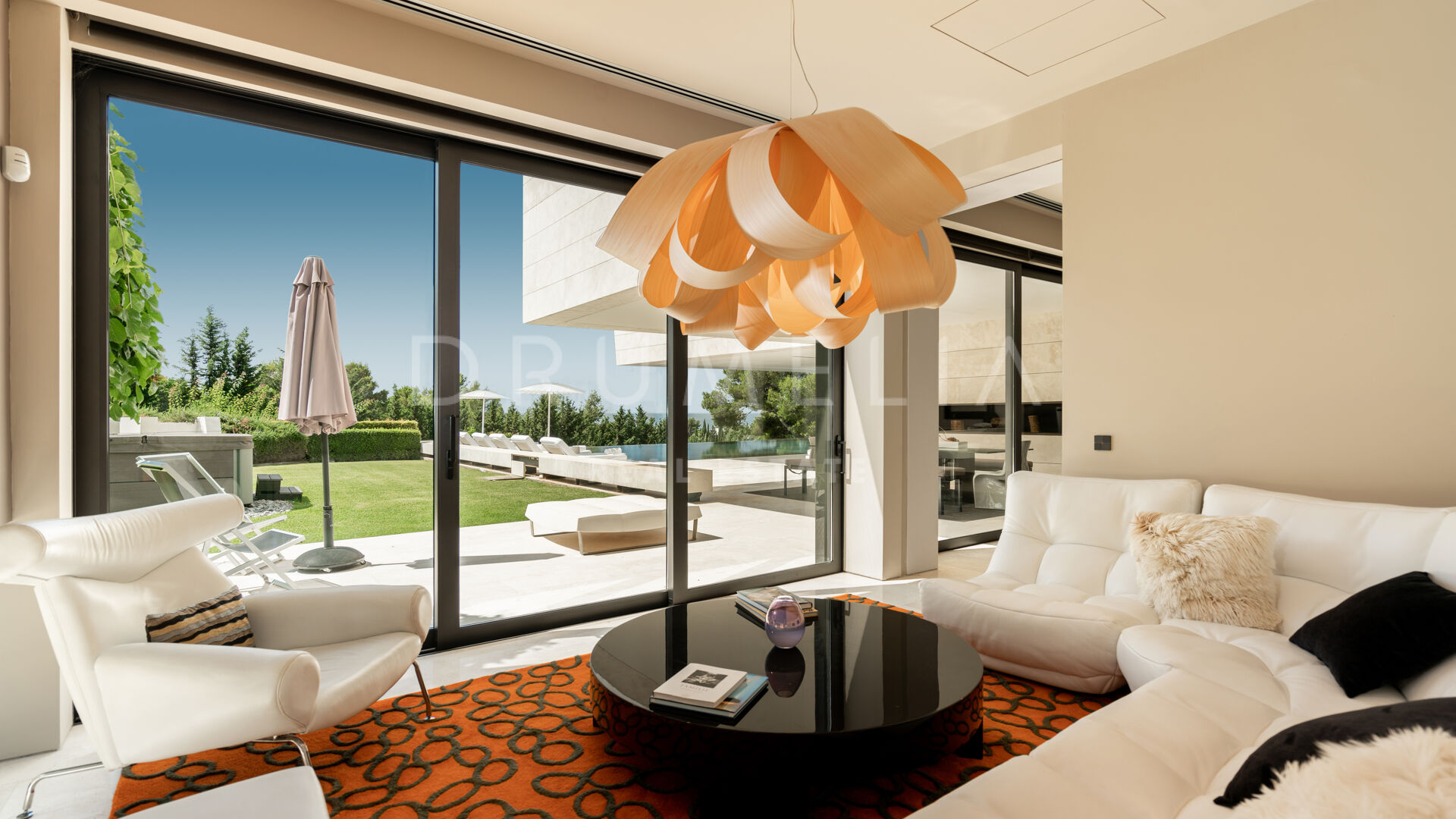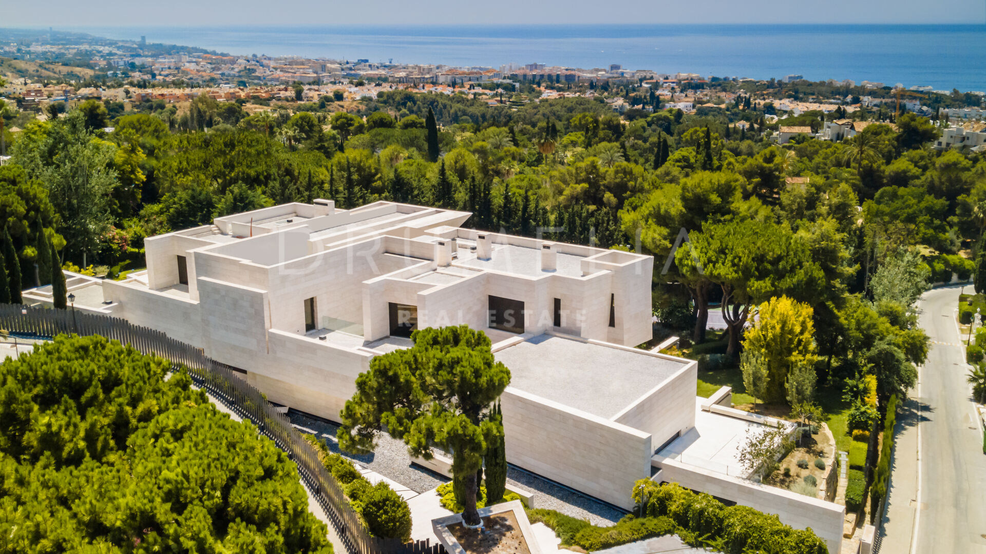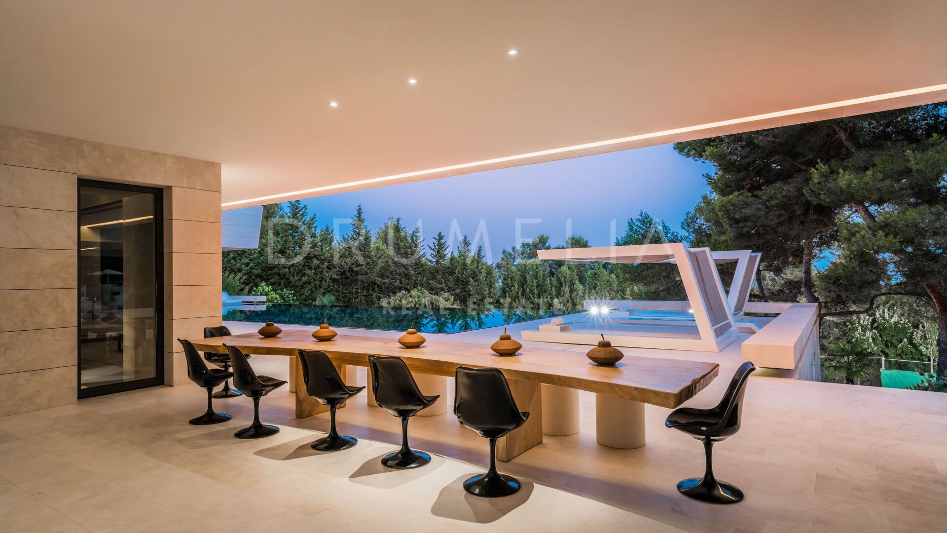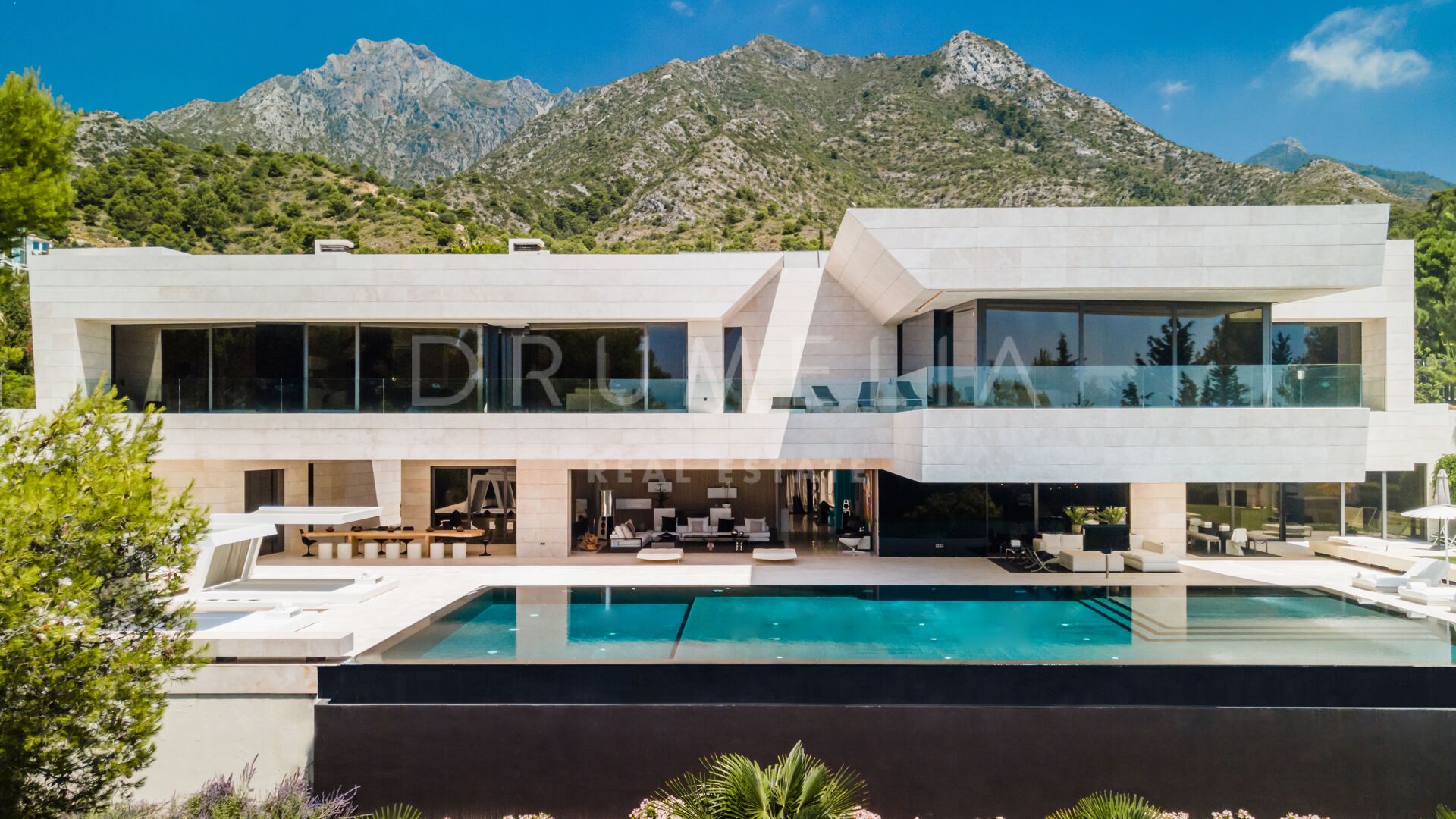 Set in the lush foothills of Cascada de Camoján, Golden Mile, Marbella, this contemporary Mediterranean villa offers an extraordinary blend of design, nature, and tranquillity. Surrounded by greenery and positioned to capture sweeping vistas across the Mediterranean toward two continents, the property delivers a rare sense of stillness and seclusion.