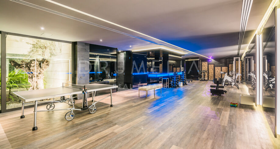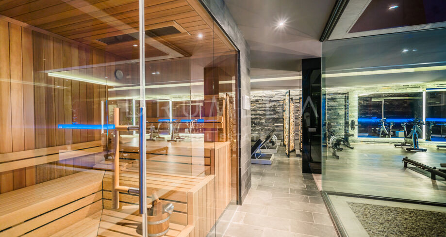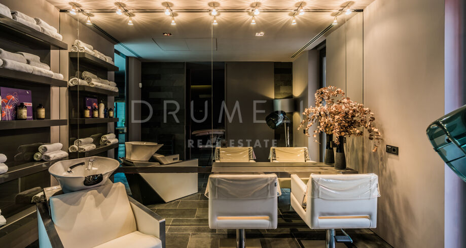 Villaen byr på et komplett spa med badstue, dampbad, kaldtvannsbasseng, treningsrom og skjønnhetssalong, samt glassvinrom, flygel og integrert Meridian-lydsystem. Kjøkkenet fra Poggenpohl fungerer som boligens kulinariske midtpunkt.