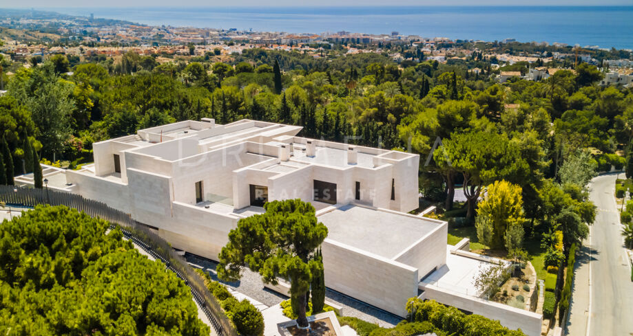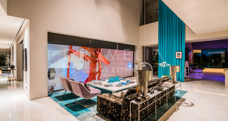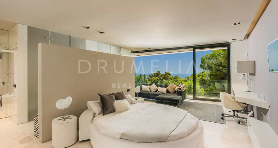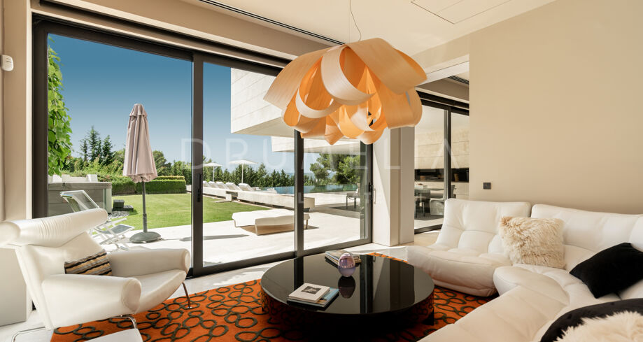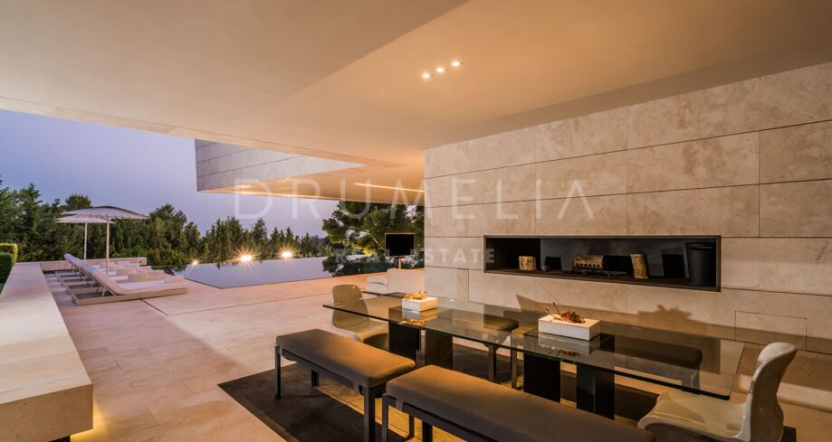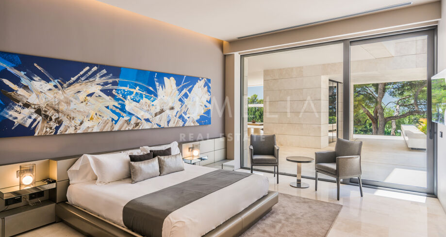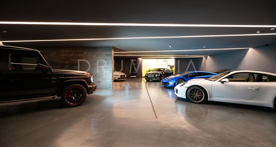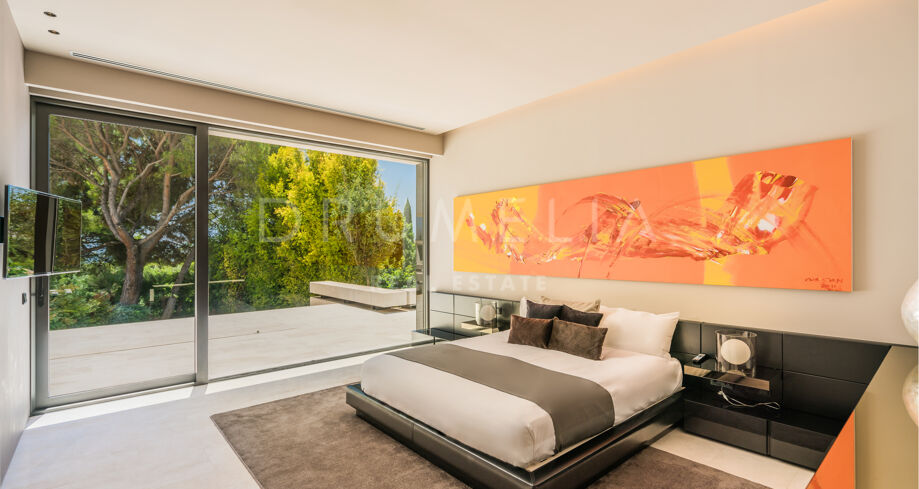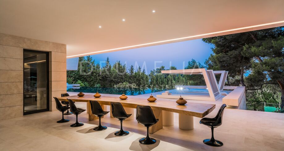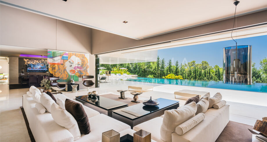 Denne moderne middelhavsvillaen ligger i de grønne åssider i Cascada de Camoján, Golden Mile, Marbella, der natur, arkitektur og ro møtes. Omgitt av frodig vegetasjon og med utsikt over Middelhavet mot to kontinenter, tilbyr eiendommen en sjelden følelse av stillhet og eksklusivitet.