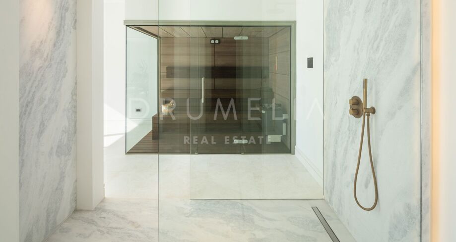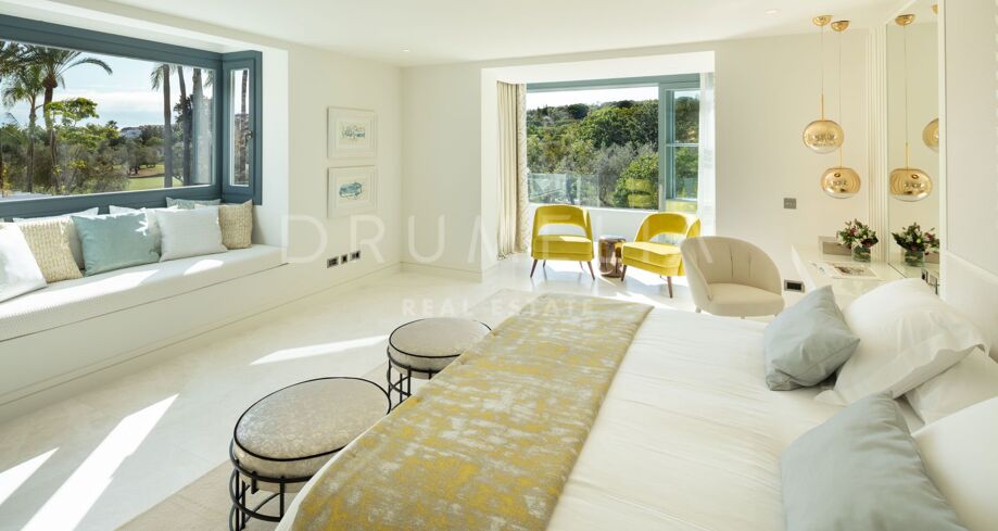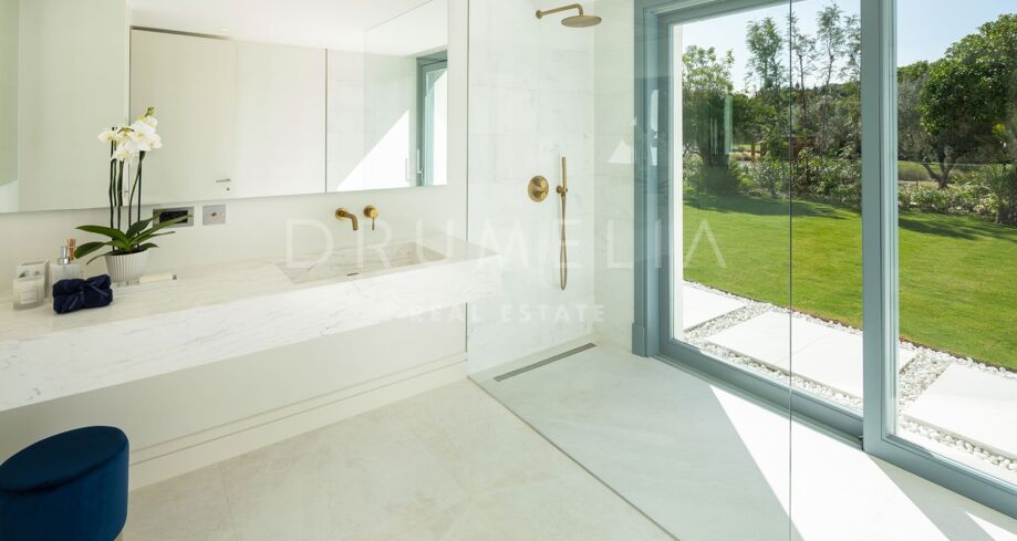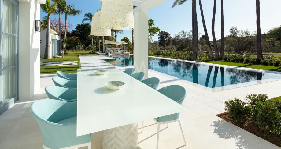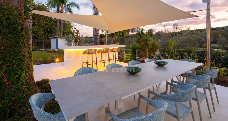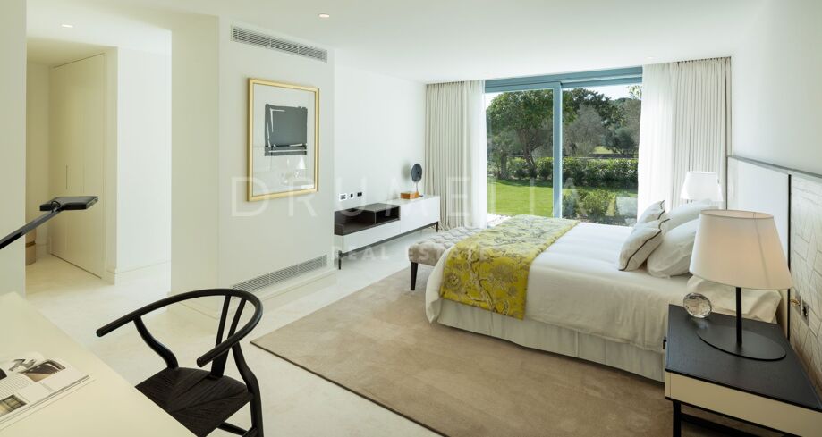 Det som virkelig skiller denne førstelinja-eiendommen fra andre, er hvordan den skarpe arkitekturen smelter sammen med uteområdene: den hvite verandaen som speiler seg i bassenget, de romslige terrassene og den storslåtte utsikten over golfbanene skaper en bemerkelsesverdig atmosfære fra morgen til kveld. Dette er et hjem som er designet for å nytes i ro og mak, vanskelig å forlate og lett å forelske seg i.