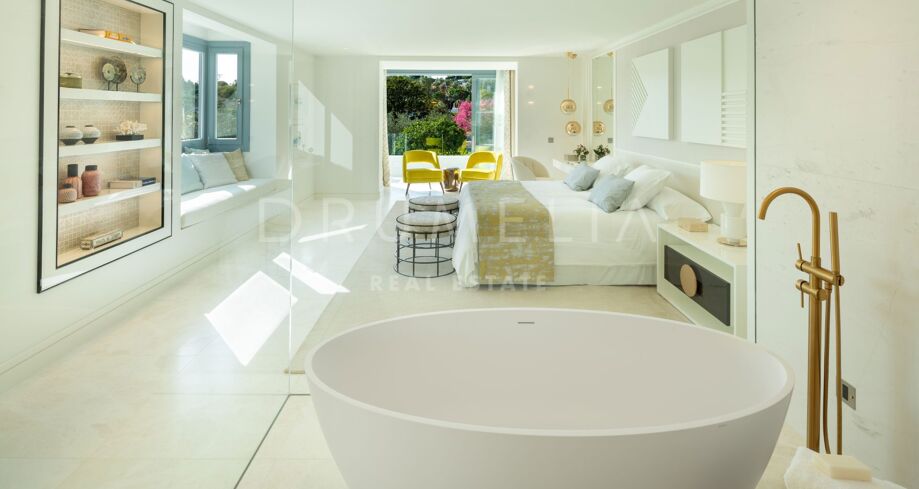 Innendørs utmerker boligen seg med sitt raffinerte, minimalistiske design og eksepsjonelle komfort. Syv rolige soverom og ni bad gir rikelig med plass for familier eller grupper, mens king size-senger, høykvalitets sengetøy og gjennomtenkte baderomsløsninger løfter oppholdet. Hovedoppholdsrommene er lyse og moderne, med god plass til å slappe av, spise eller underholde.