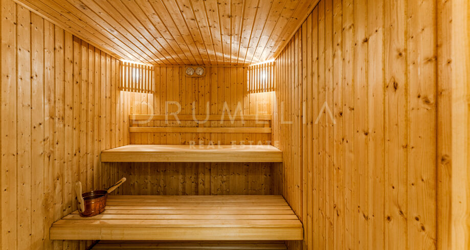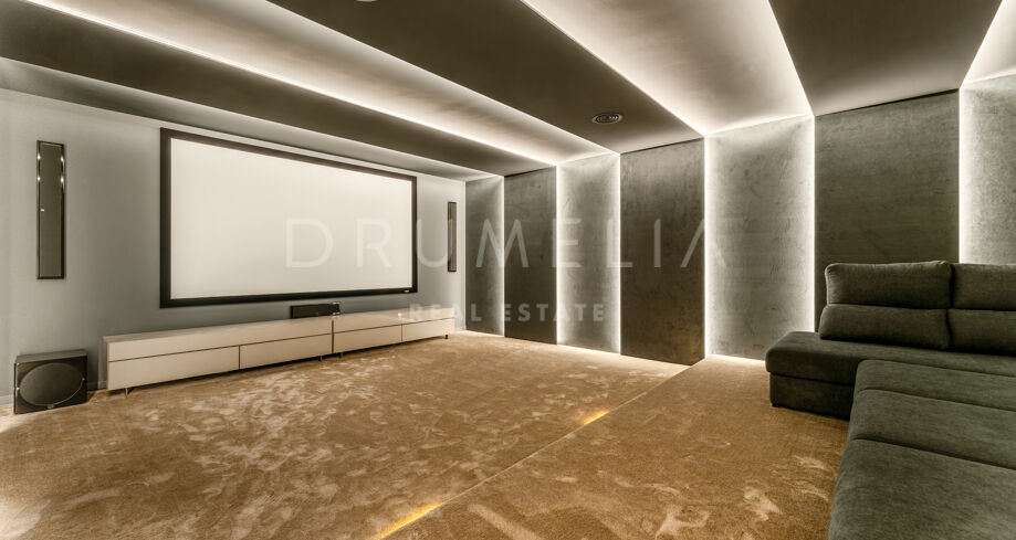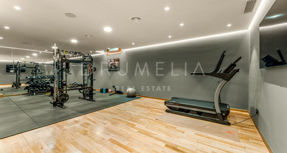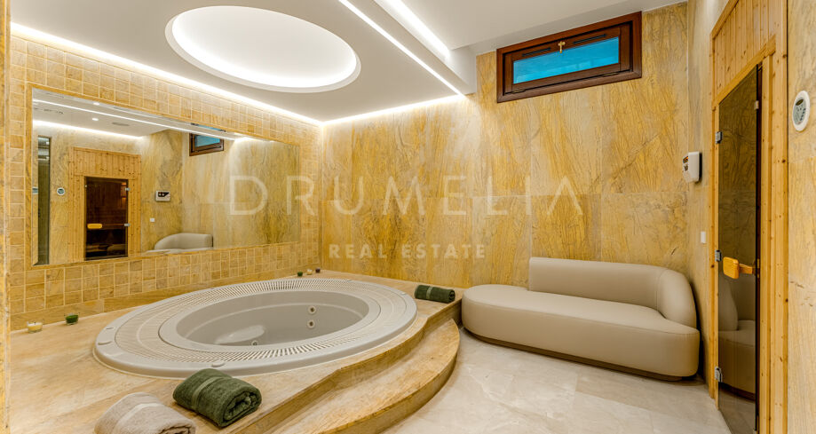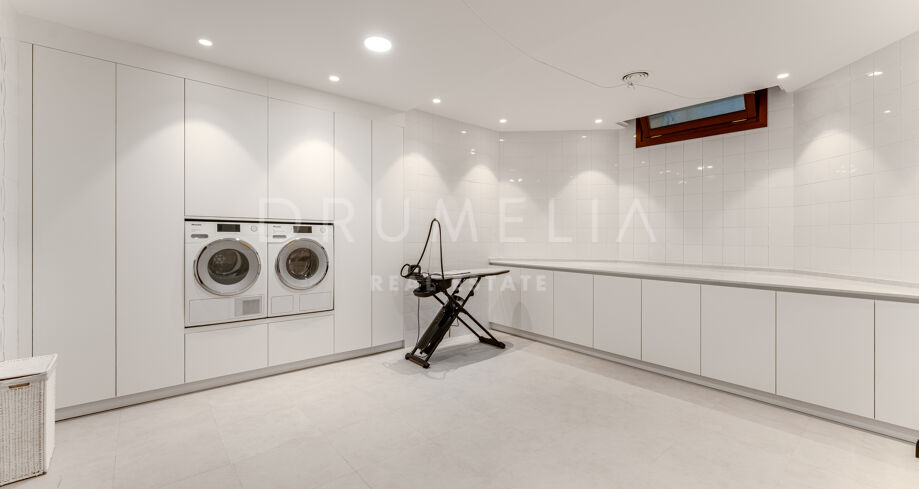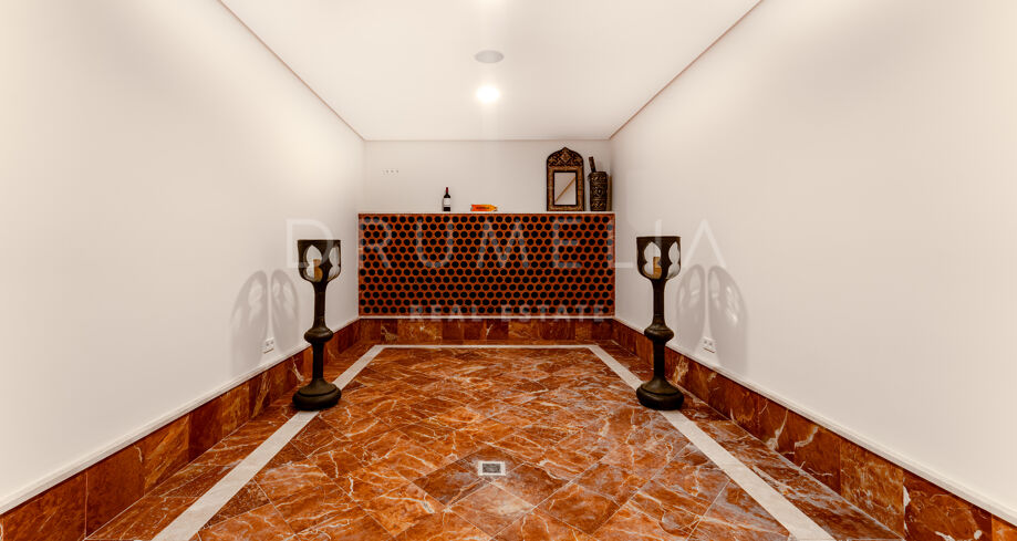 Villaen har flere soverom og salonger, en stor trapp, hjemmekino, vinkjeller, treningsrom, spa-avdeling og rikelig med innendørs og utendørs soner for avslapning. Svømmebassenget og hagen er sømløst integrert i arkitekturen og skaper en rolig atmosfære som passer både til avslapping og sosiale sammenkomster. Tidstypiske detaljer som søyler, hvelvede tak og brede ganger gir huset et tidløst og harmonisk uttrykk.