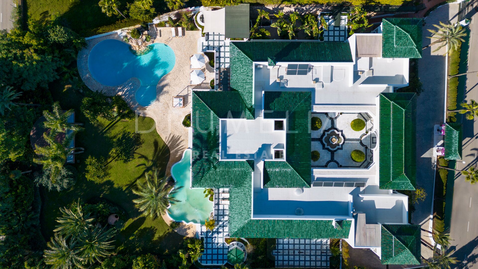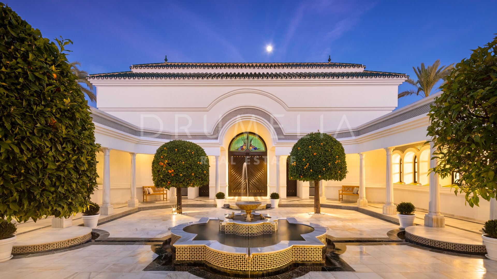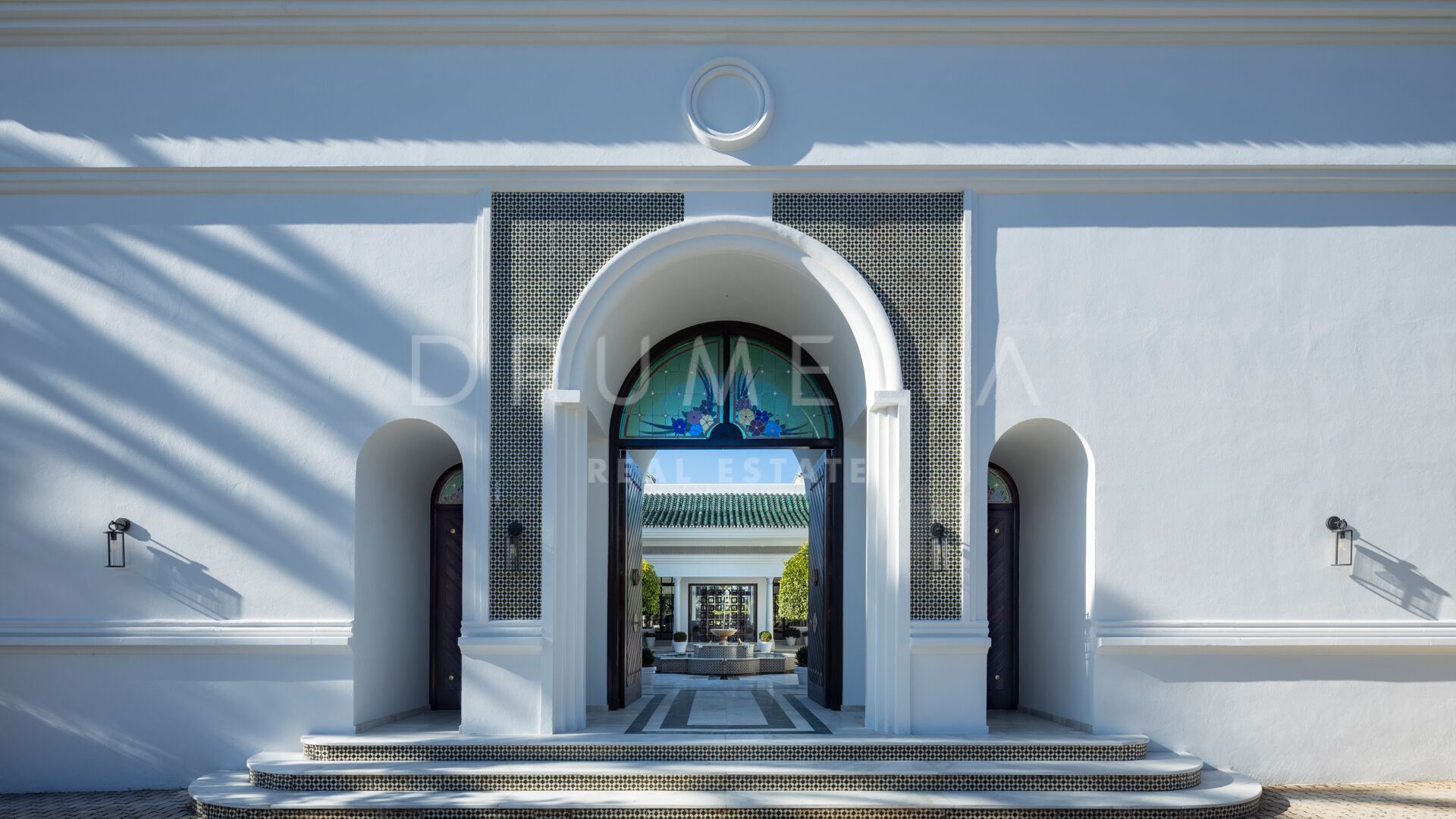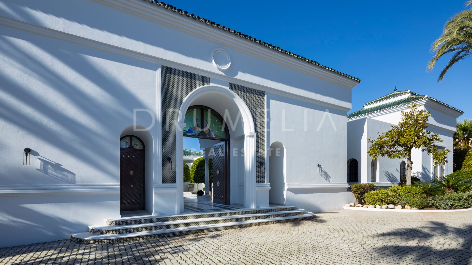 De woning van 4000 m², gelegen op een uitgestrekt perceel, past perfect in de omgeving. Het ontwerp kenmerkt zich door traditionele Andalusische esthetiek met Moorse invloeden, waaronder een lagune-geïnspireerd privézwembad, een charmante buitenpergola en verschillende terrassen om te dineren en te ontspannen. Het interieur biedt open woon- en eetgedeeltes met hoge plafonds, een volledig uitgeruste keuken, gastenslaapkamers met en-suite badkamers en een grote slaapkamer op de begane grond met een weelderige privébadkamer en een ruime inloopkast. Belangrijke kenmerken zoals twee prachtige patio’s versierd met fonteinen versterken de charme van het pand.
