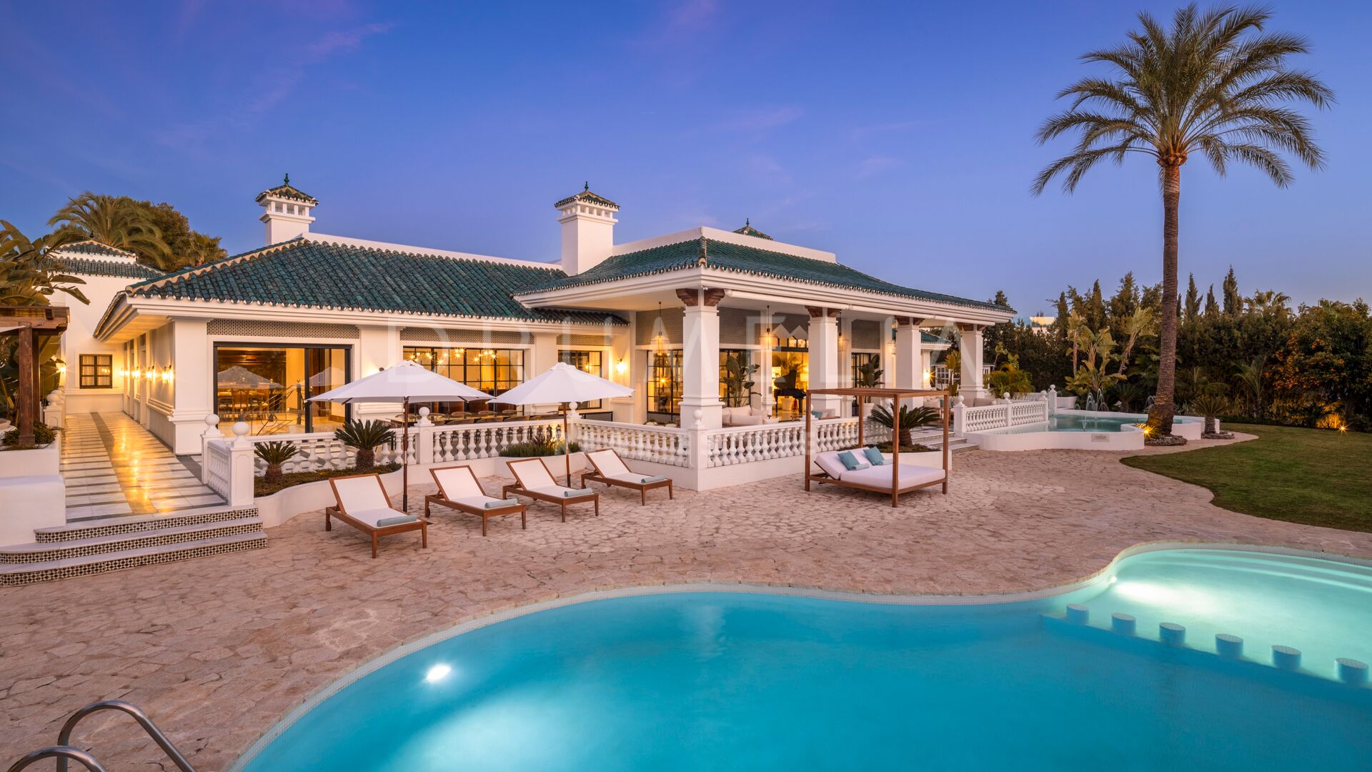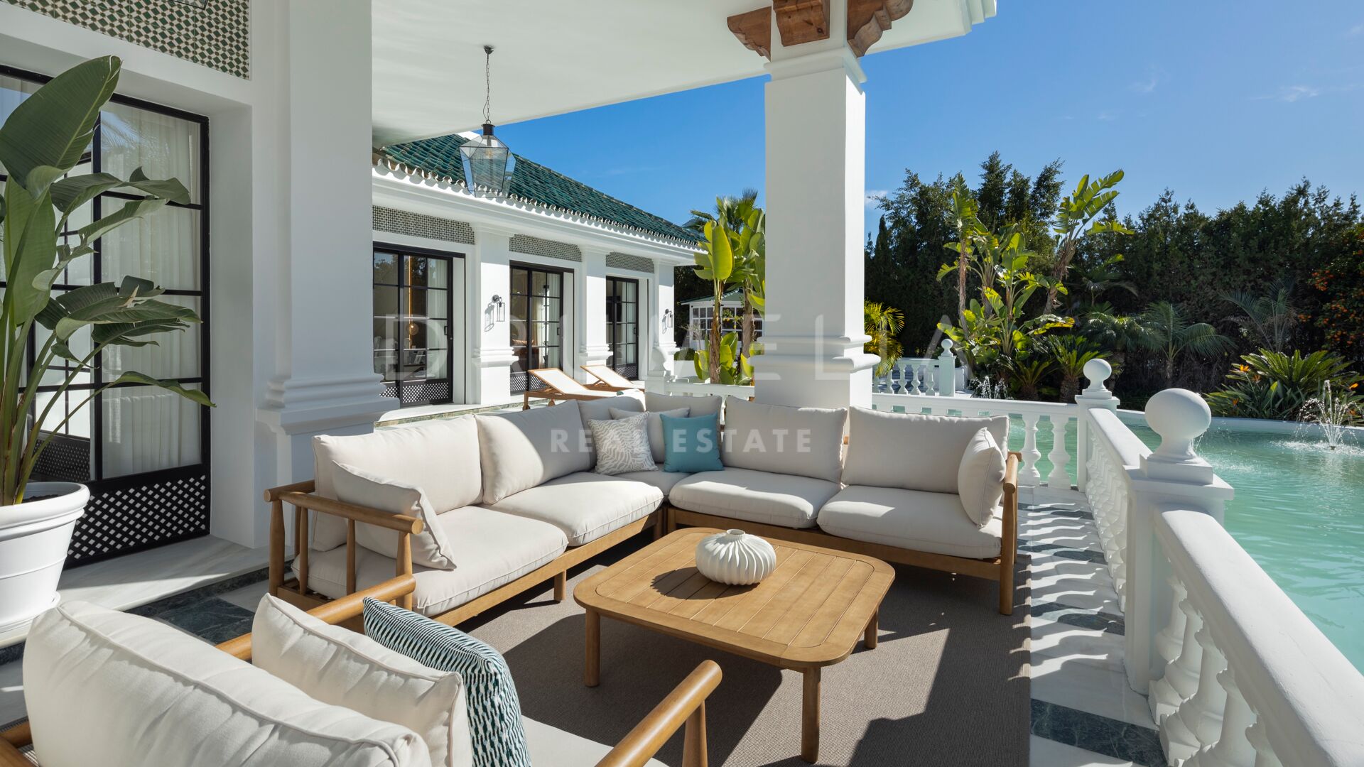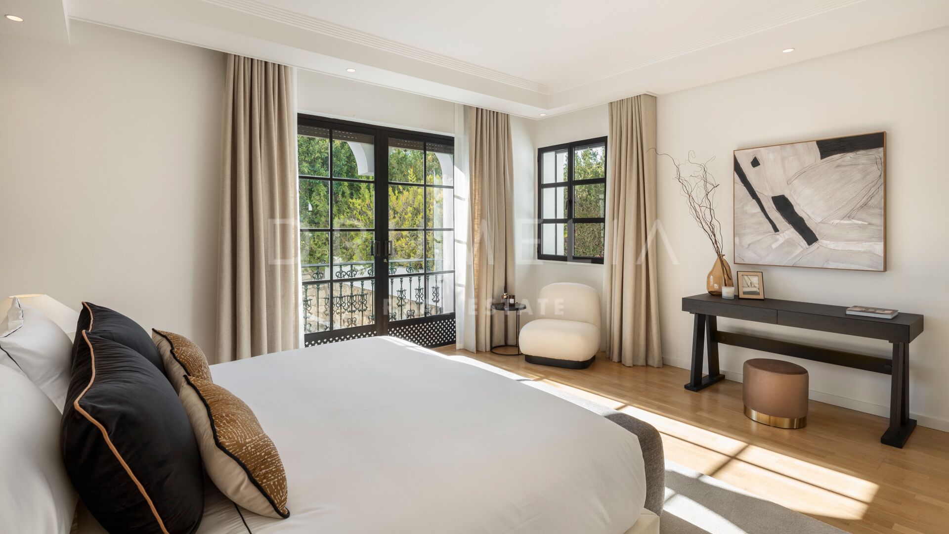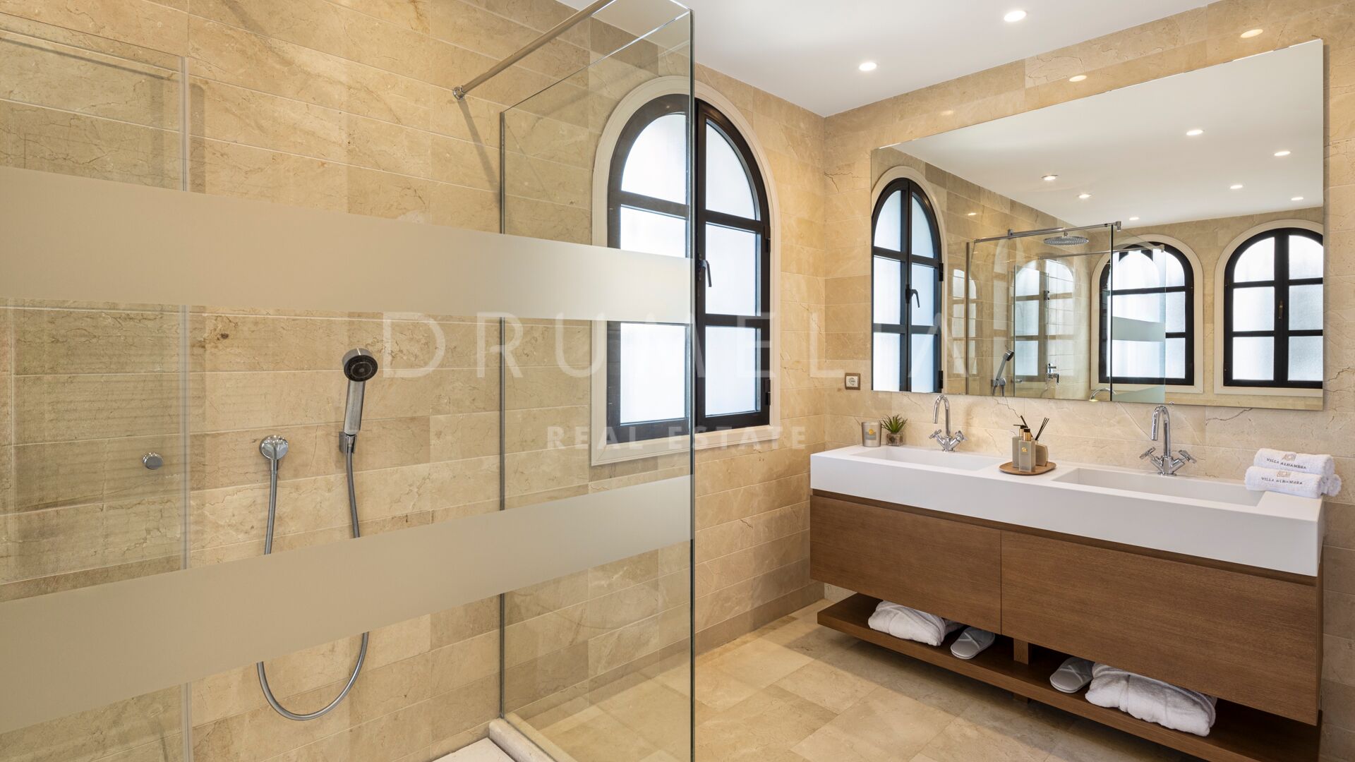 De woning van 4000 m², gelegen op een uitgestrekt perceel, past perfect in de omgeving. Het ontwerp kenmerkt zich door traditionele Andalusische esthetiek met Moorse invloeden, waaronder een lagune-geïnspireerd privézwembad, een charmante buitenpergola en verschillende terrassen om te dineren en te ontspannen. Het interieur biedt open woon- en eetgedeeltes met hoge plafonds, een volledig uitgeruste keuken, gastenslaapkamers met en-suite badkamers en een grote slaapkamer op de begane grond met een weelderige privébadkamer en een ruime inloopkast. Belangrijke kenmerken zoals twee prachtige patio’s versierd met fonteinen versterken de charme van het pand.