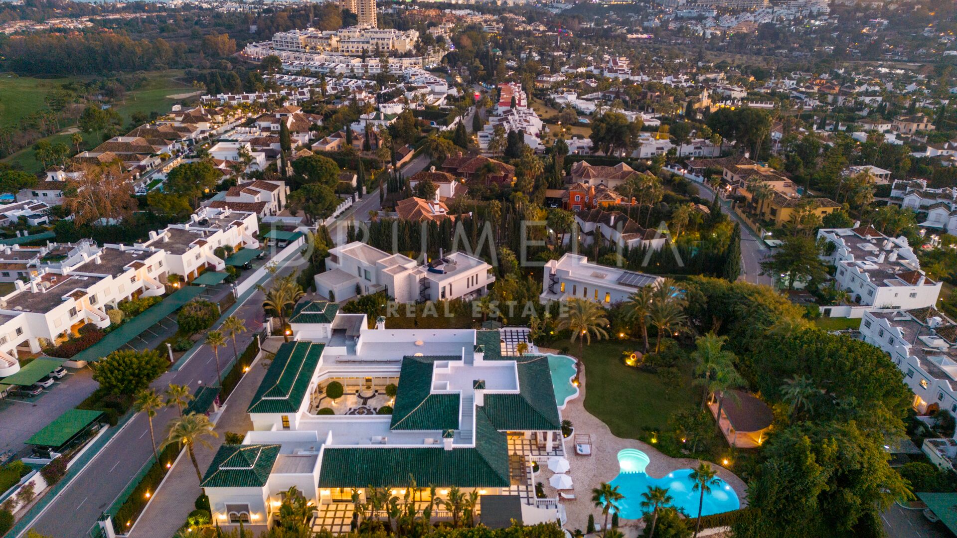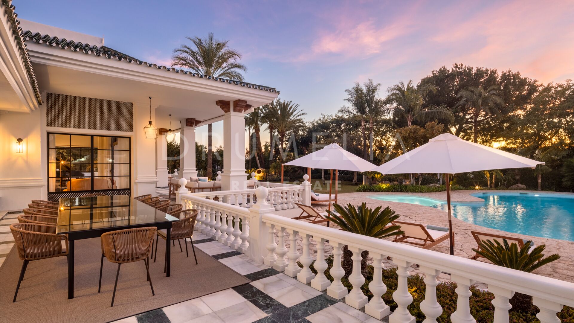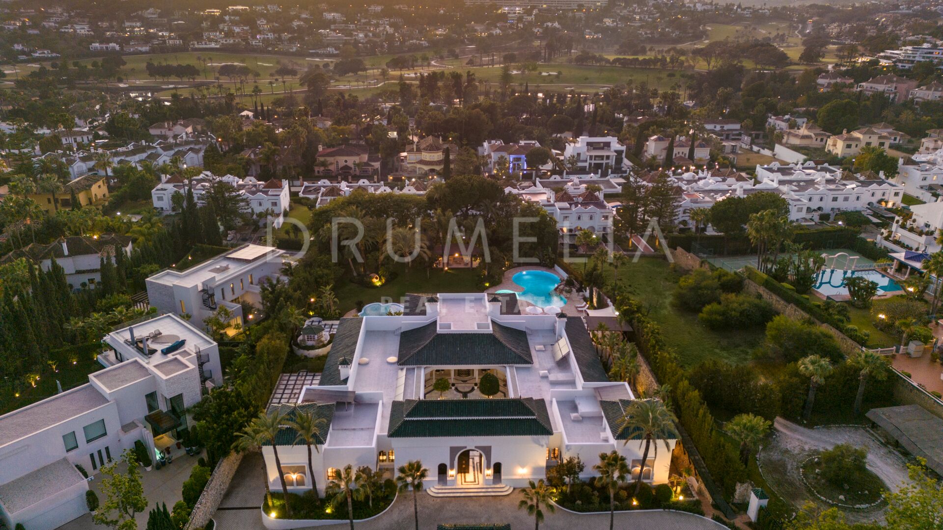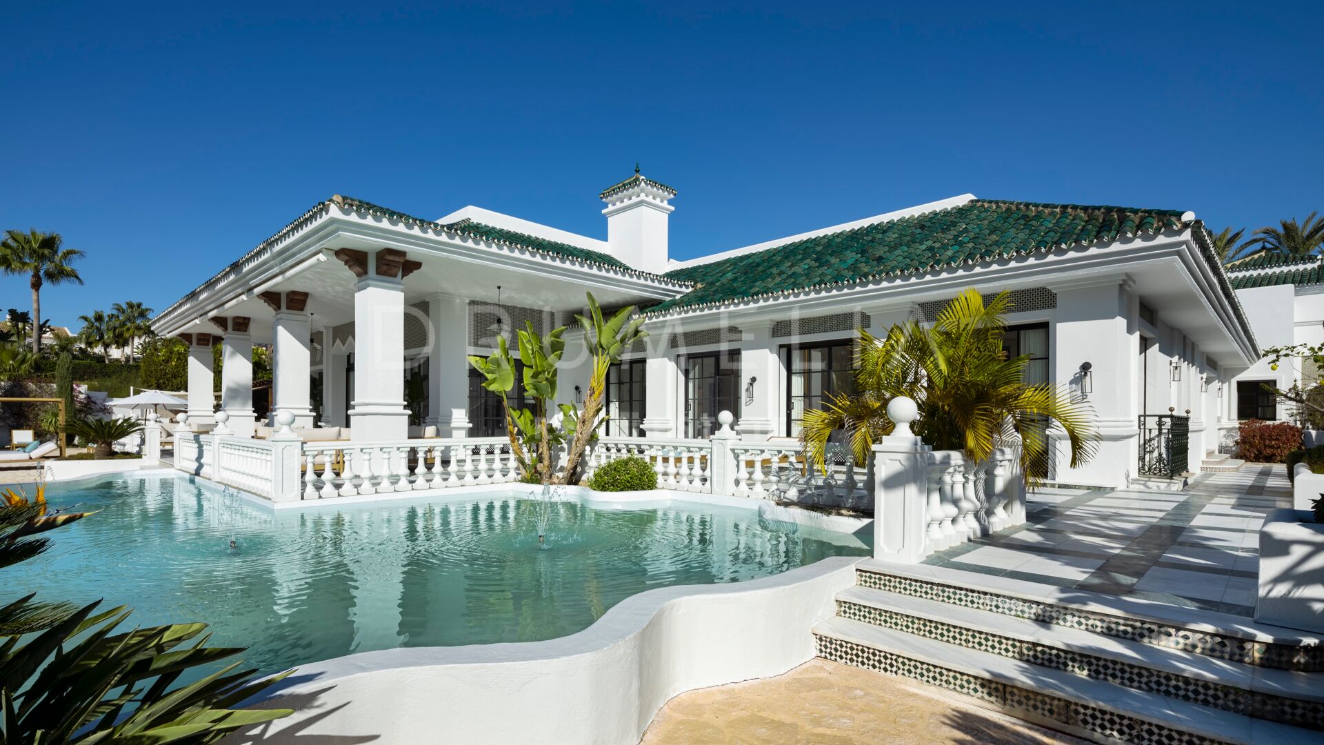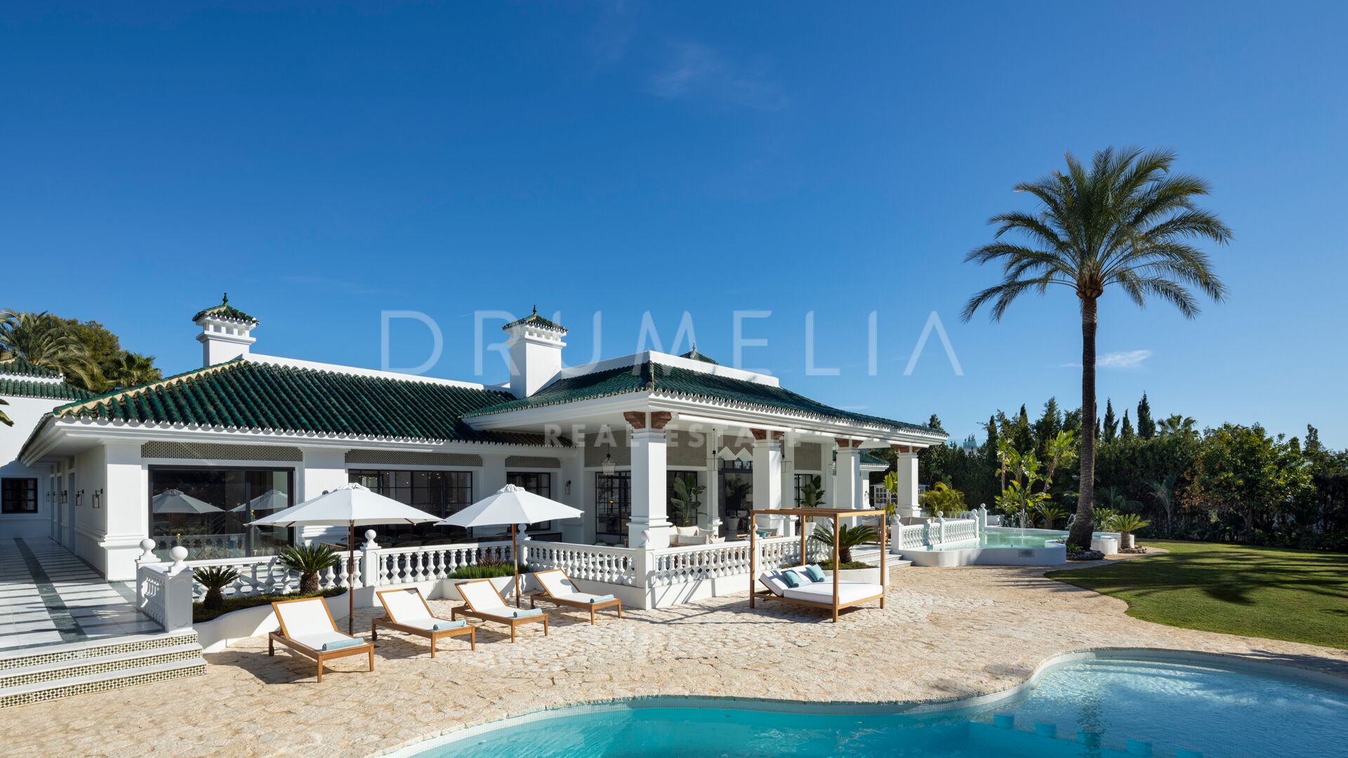 De woning van 4000 m², gelegen op een uitgestrekt perceel, past perfect in de omgeving. Het ontwerp kenmerkt zich door traditionele Andalusische esthetiek met Moorse invloeden, waaronder een lagune-geïnspireerd privézwembad, een charmante buitenpergola en verschillende terrassen om te dineren en te ontspannen. Het interieur biedt open woon- en eetgedeeltes met hoge plafonds, een volledig uitgeruste keuken, gastenslaapkamers met en-suite badkamers en een grote slaapkamer op de begane grond met een weelderige privébadkamer en een ruime inloopkast. Belangrijke kenmerken zoals twee prachtige patio’s versierd met fonteinen versterken de charme van het pand.