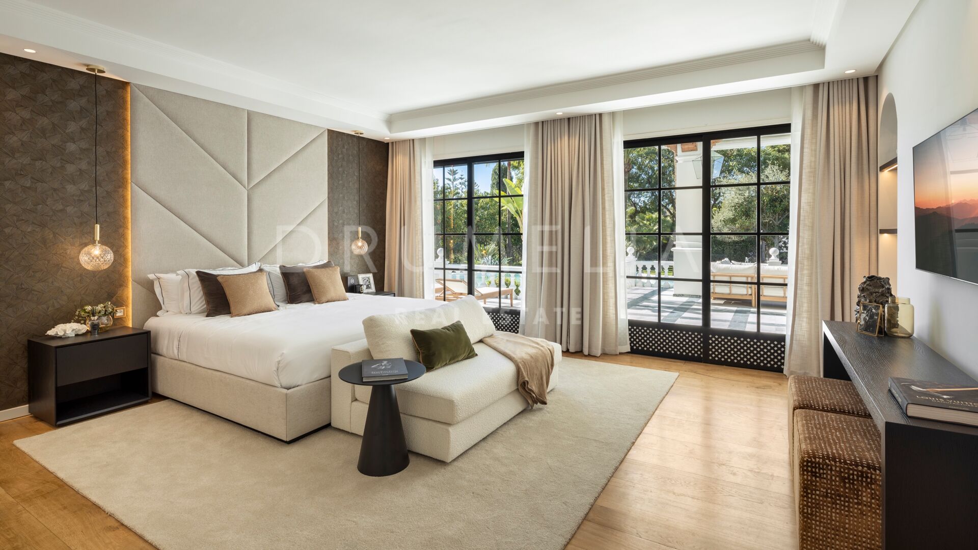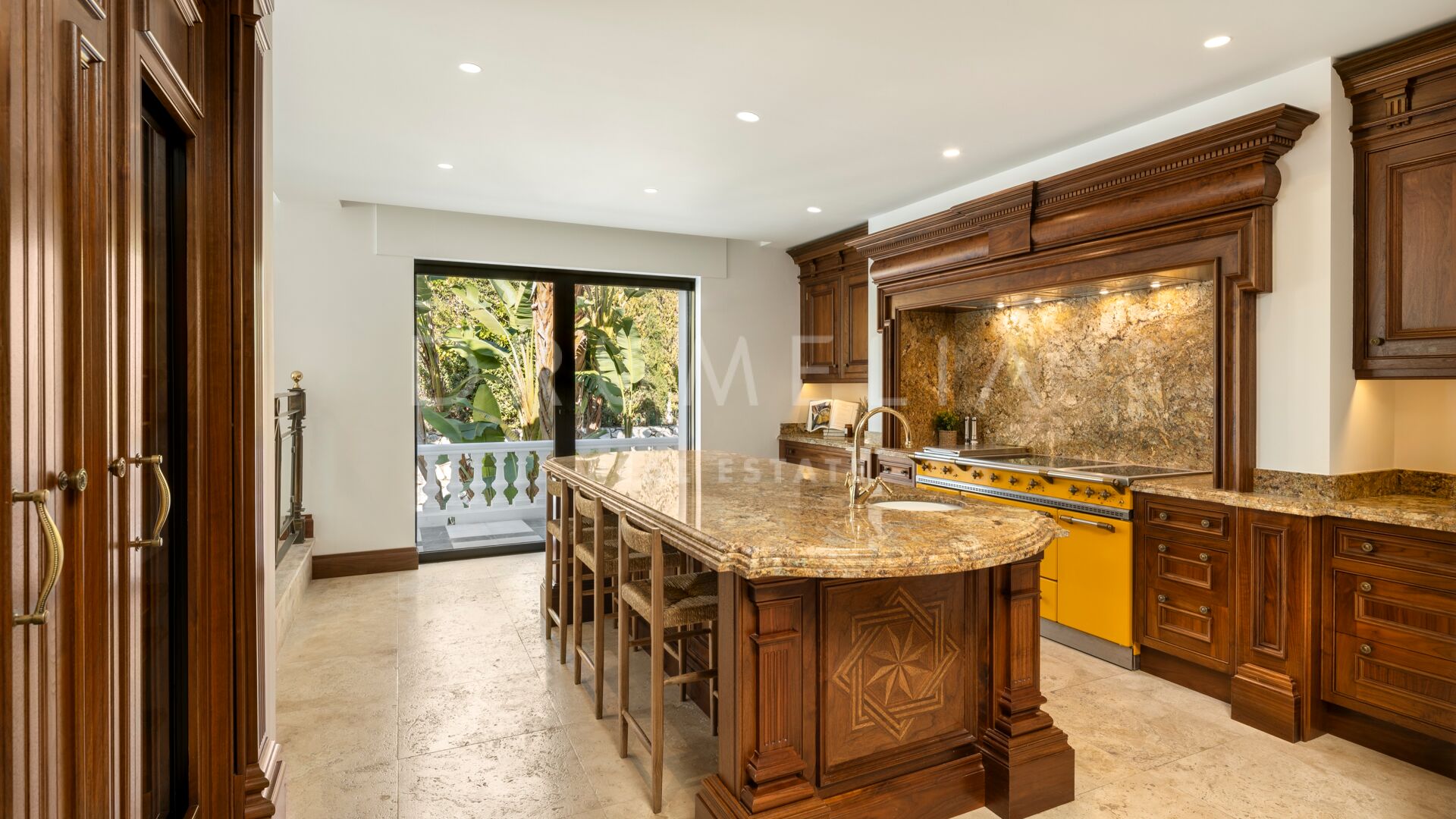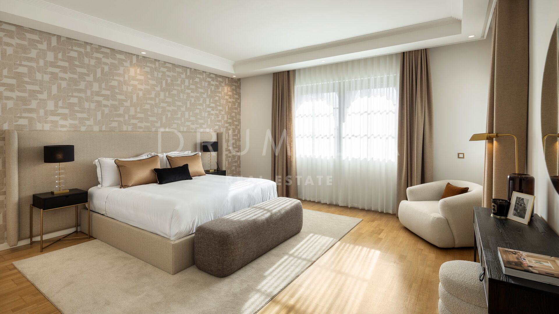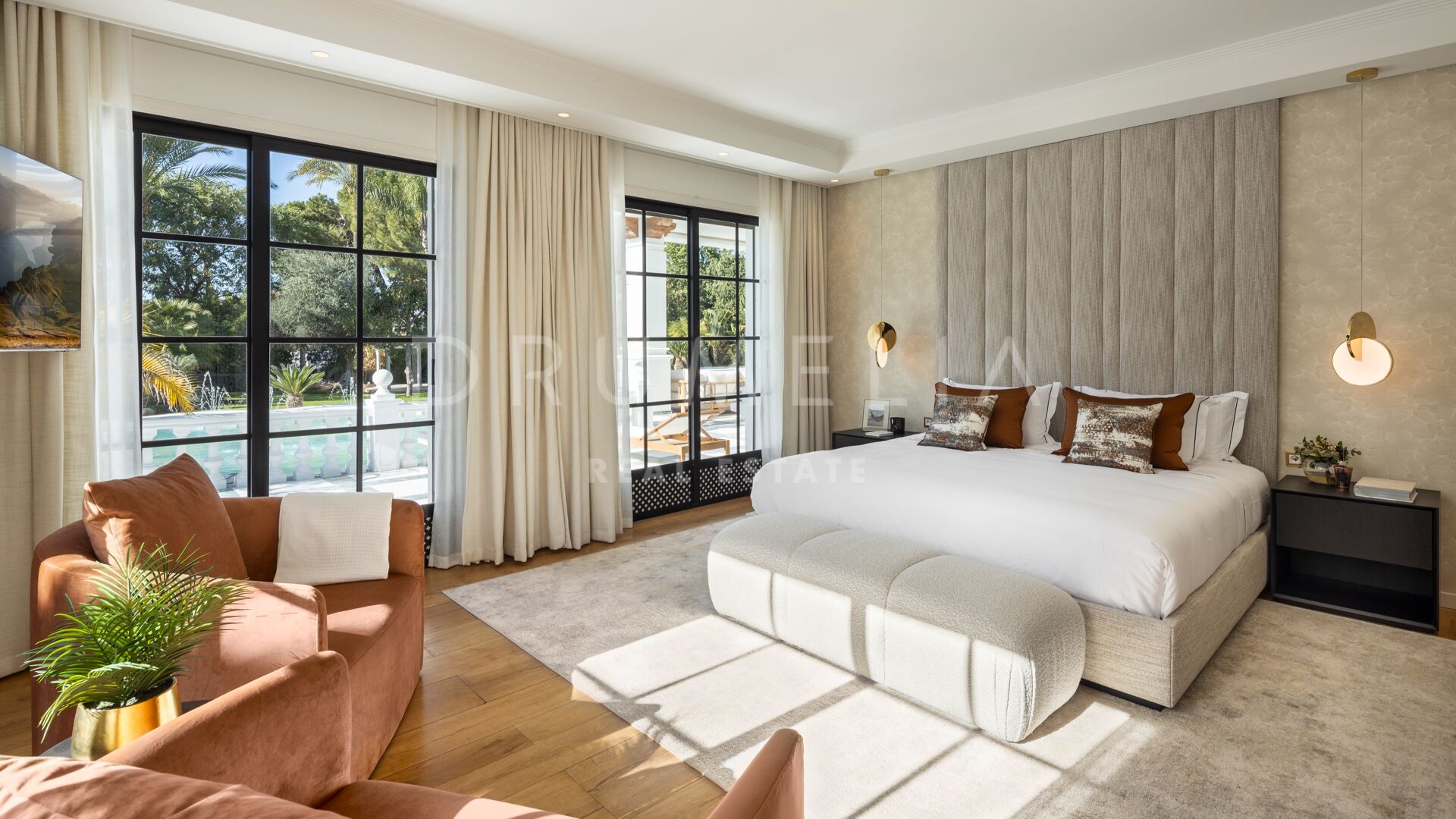 De woning van 4000 m², gelegen op een uitgestrekt perceel, past perfect in de omgeving. Het ontwerp kenmerkt zich door traditionele Andalusische esthetiek met Moorse invloeden, waaronder een lagune-geïnspireerd privézwembad, een charmante buitenpergola en verschillende terrassen om te dineren en te ontspannen. Het interieur biedt open woon- en eetgedeeltes met hoge plafonds, een volledig uitgeruste keuken, gastenslaapkamers met en-suite badkamers en een grote slaapkamer op de begane grond met een weelderige privébadkamer en een ruime inloopkast. Belangrijke kenmerken zoals twee prachtige patio’s versierd met fonteinen versterken de charme van het pand.