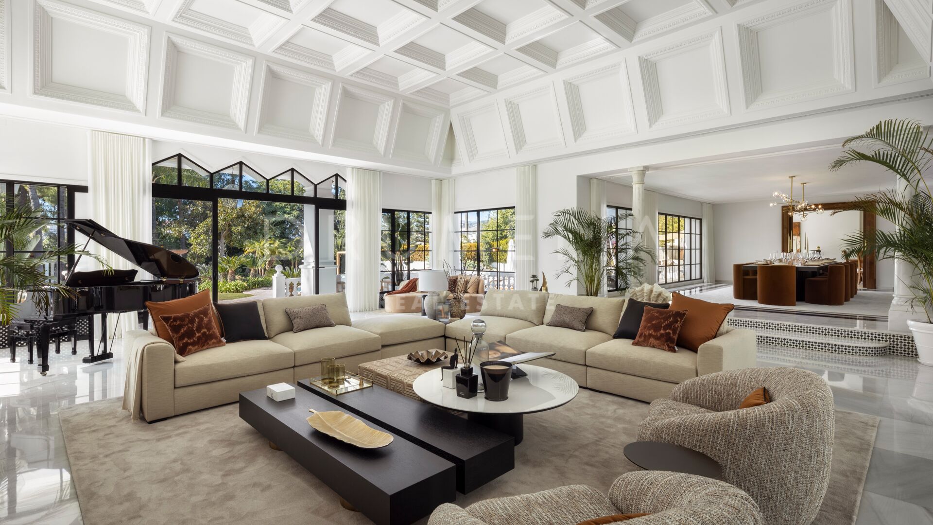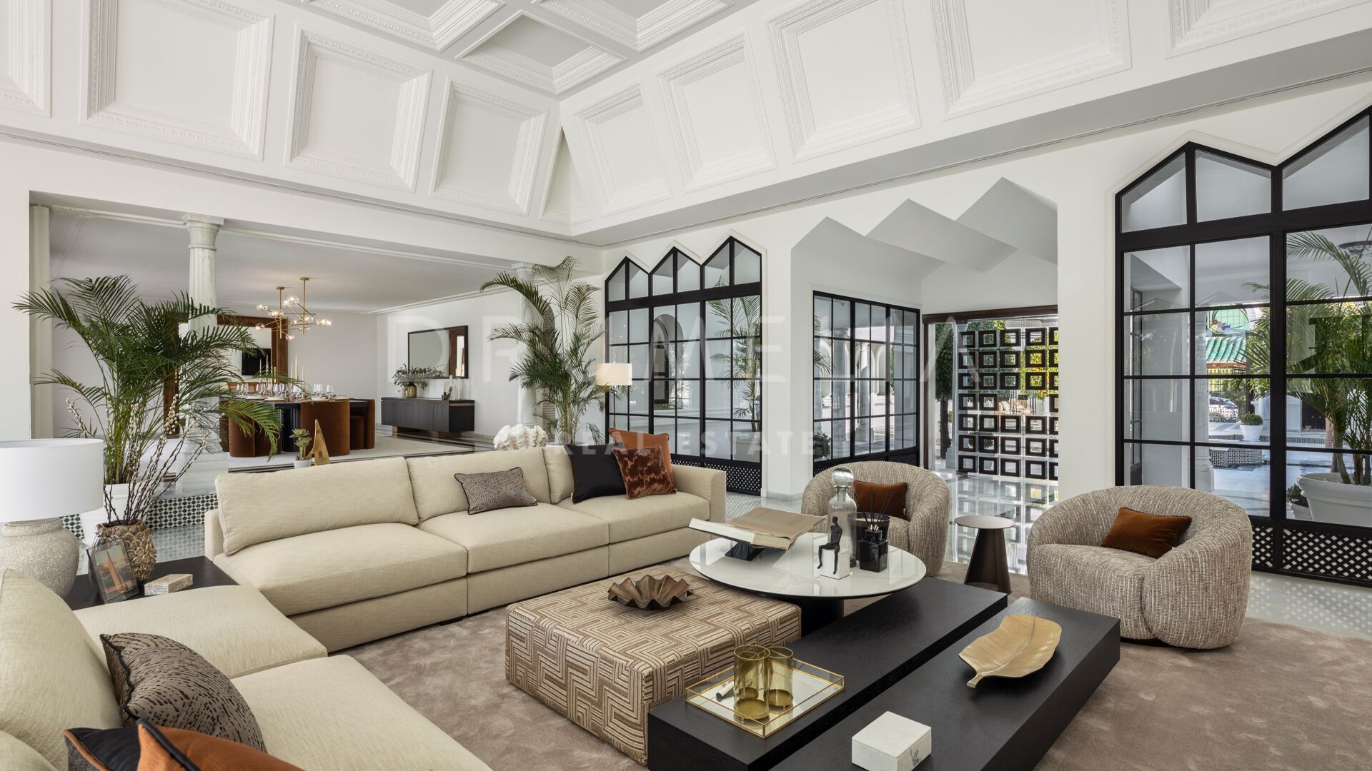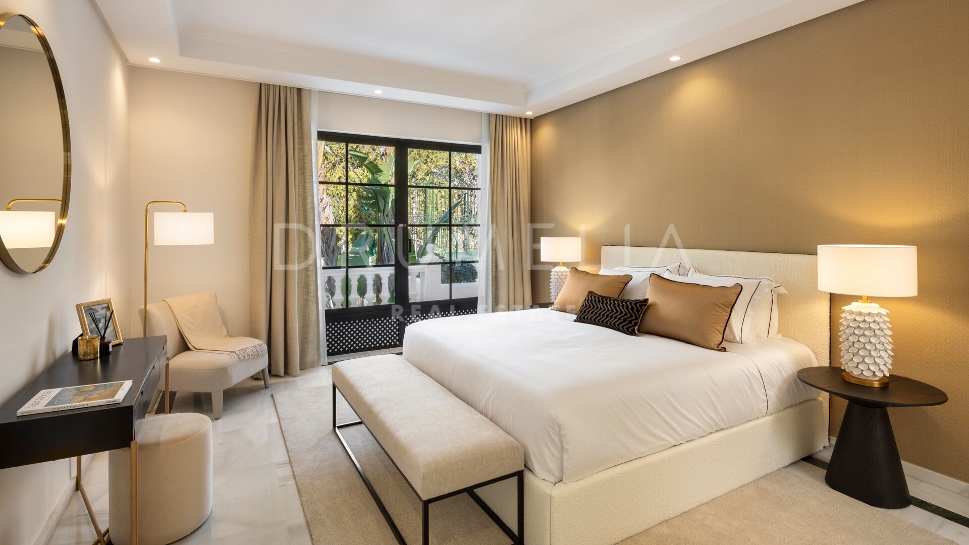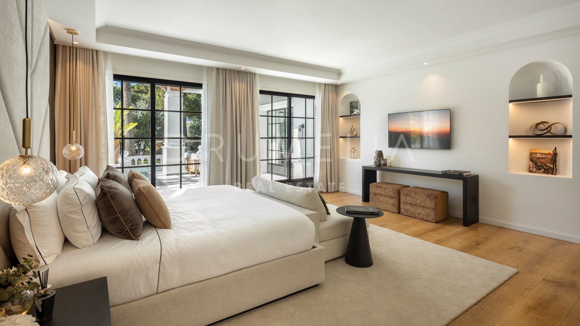 De woning van 4000 m², gelegen op een uitgestrekt perceel, past perfect in de omgeving. Het ontwerp kenmerkt zich door traditionele Andalusische esthetiek met Moorse invloeden, waaronder een lagune-geïnspireerd privézwembad, een charmante buitenpergola en verschillende terrassen om te dineren en te ontspannen. Het interieur biedt open woon- en eetgedeeltes met hoge plafonds, een volledig uitgeruste keuken, gastenslaapkamers met en-suite badkamers en een grote slaapkamer op de begane grond met een weelderige privébadkamer en een ruime inloopkast. Belangrijke kenmerken zoals twee prachtige patio’s versierd met fonteinen versterken de charme van het pand.