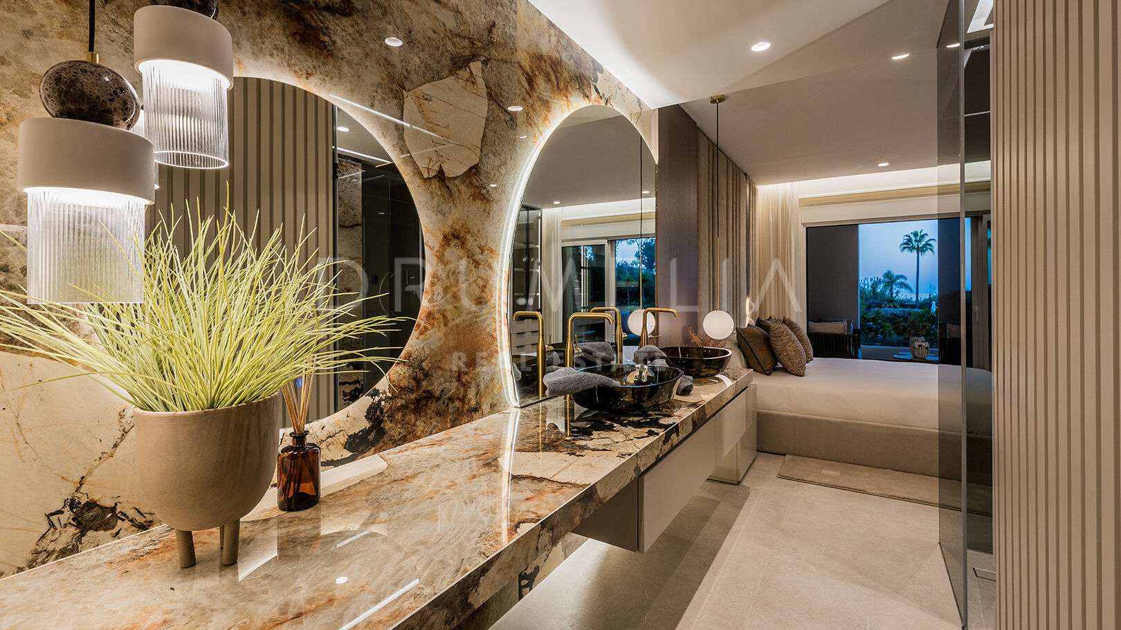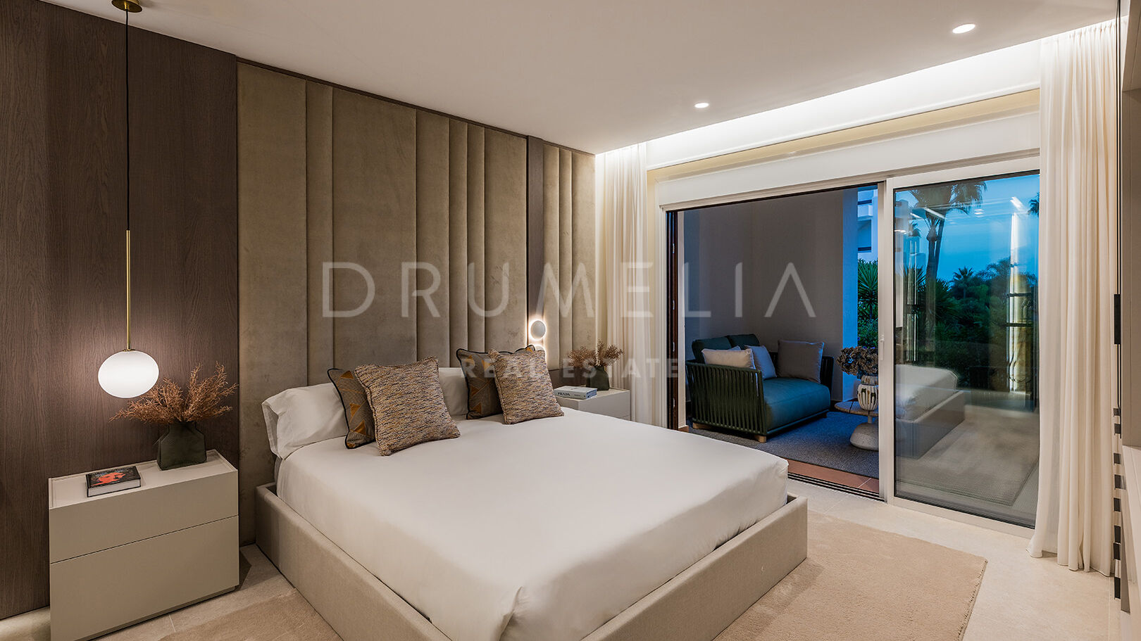 Gelegen tussen Marbella en Estepona, in de prestigieuze strandwijk Bahía del Velerín, biedt dit uitzonderlijke appartement op de begane grond een ongeëvenaarde combinatie van luxe, design en rust. Het appartement bevindt zich in een beveiligd, omheind complex met 24-uurs bewaking, waar bewoners kunnen genieten van weelderige tropische tuinen, een indrukwekkend lagunezwembad met een sfeervolle poolbar en directe toegang tot een van de mooiste zandstranden van de Costa del Sol.