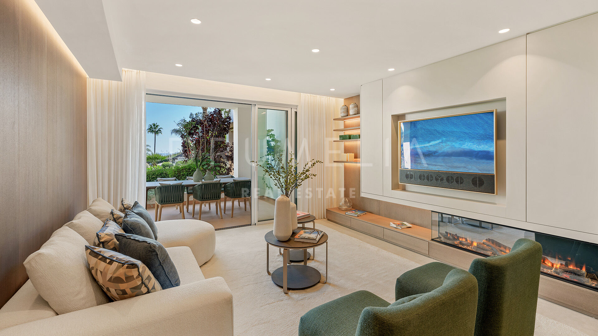 Dit volledig gerenoveerde en stijlvol ingerichte appartement wordt volledig gemeubileerd en instapklaar aangeboden. Het beschikt over een lichte, open indeling die binnen- en buitenleven naadloos met elkaar verbindt. De elegante woonkamer, voorzien van een elektrische haard, op maat gemaakte kasten en een premium Bang & Olufsen-geluidssysteem, opent naar een privéterras met uitzicht op de verzorgde tuinen en gedeeltelijk zeezicht—de ideale plek voor een diner in de buitenlucht of om te ontspannen in de mediterrane zon.