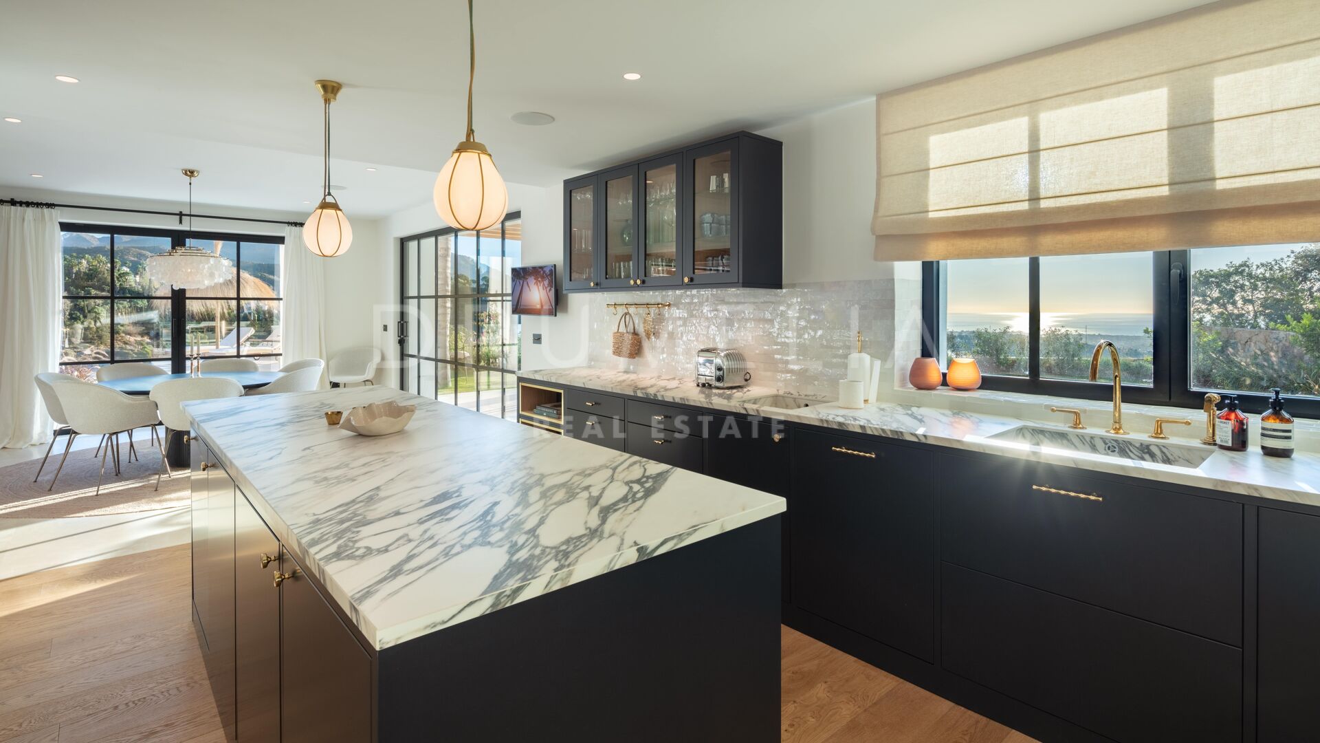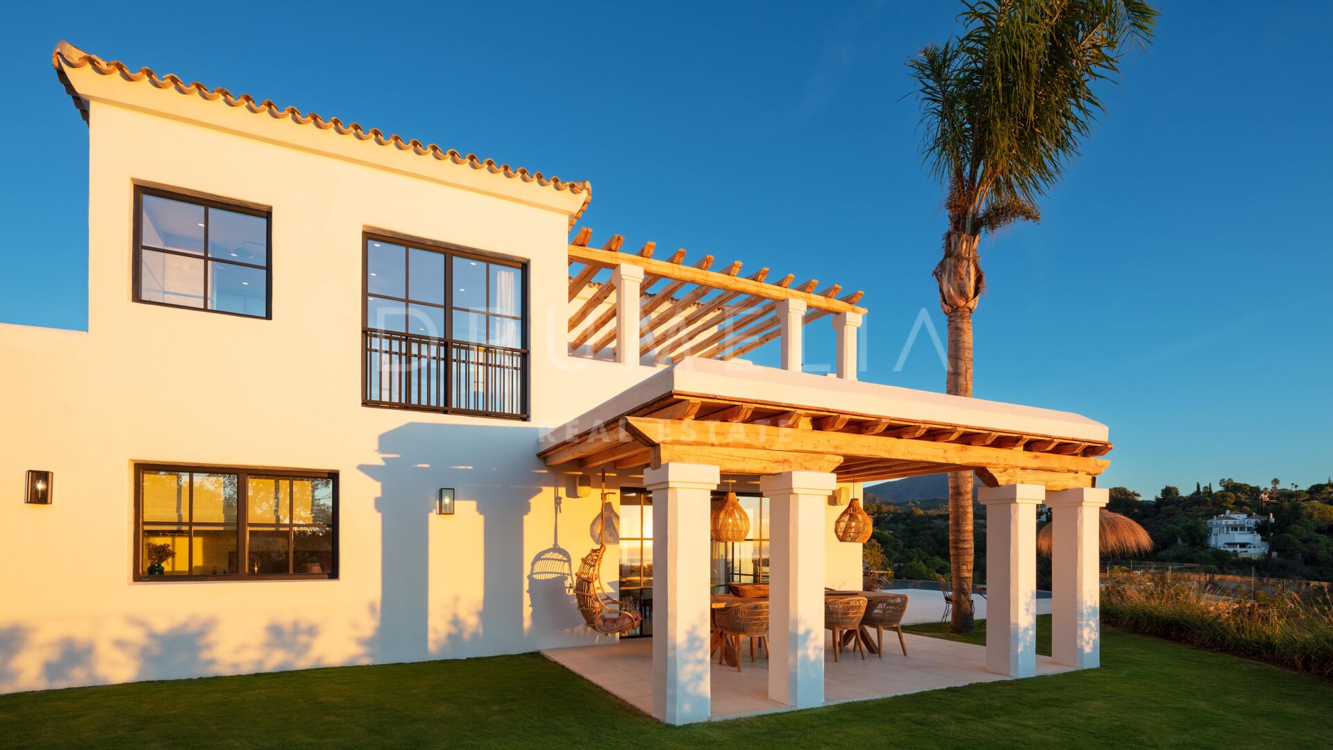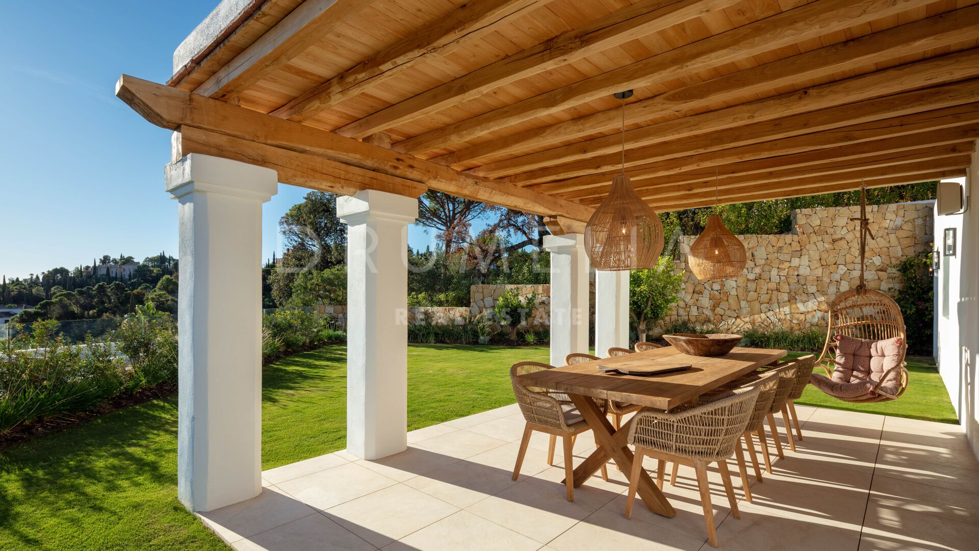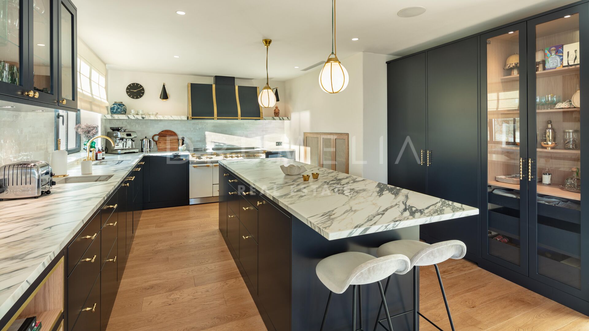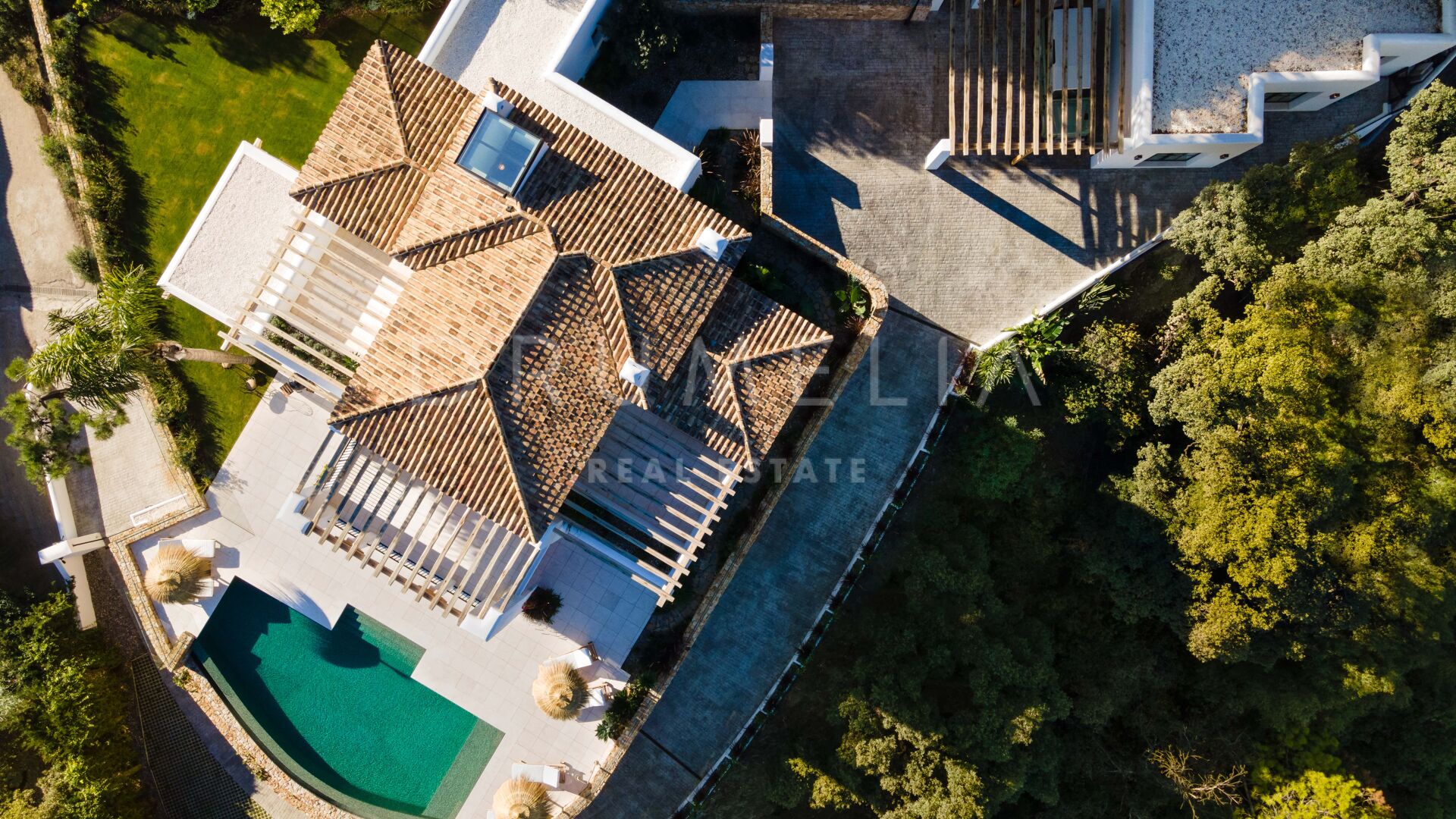 Het hoogwaardige huis biedt ongeëvenaard comfort en stijl. Het heeft 6 grote slaapkamers, 5 badkamers en 1 toilet, open woon- en eetruimten, een moderne luxe keuken met centraal eiland/ontbijtruimte, een kantoor aan huis, een garage, opslag- en wasruimten, enz. De mediterrane levensstijl wordt aangemoedigd door uitgestrekte overdekte en zonnige terrassen, een zwembad met nul-rand en een solarium, omgeven door subtropisch aangelegde tuinen.