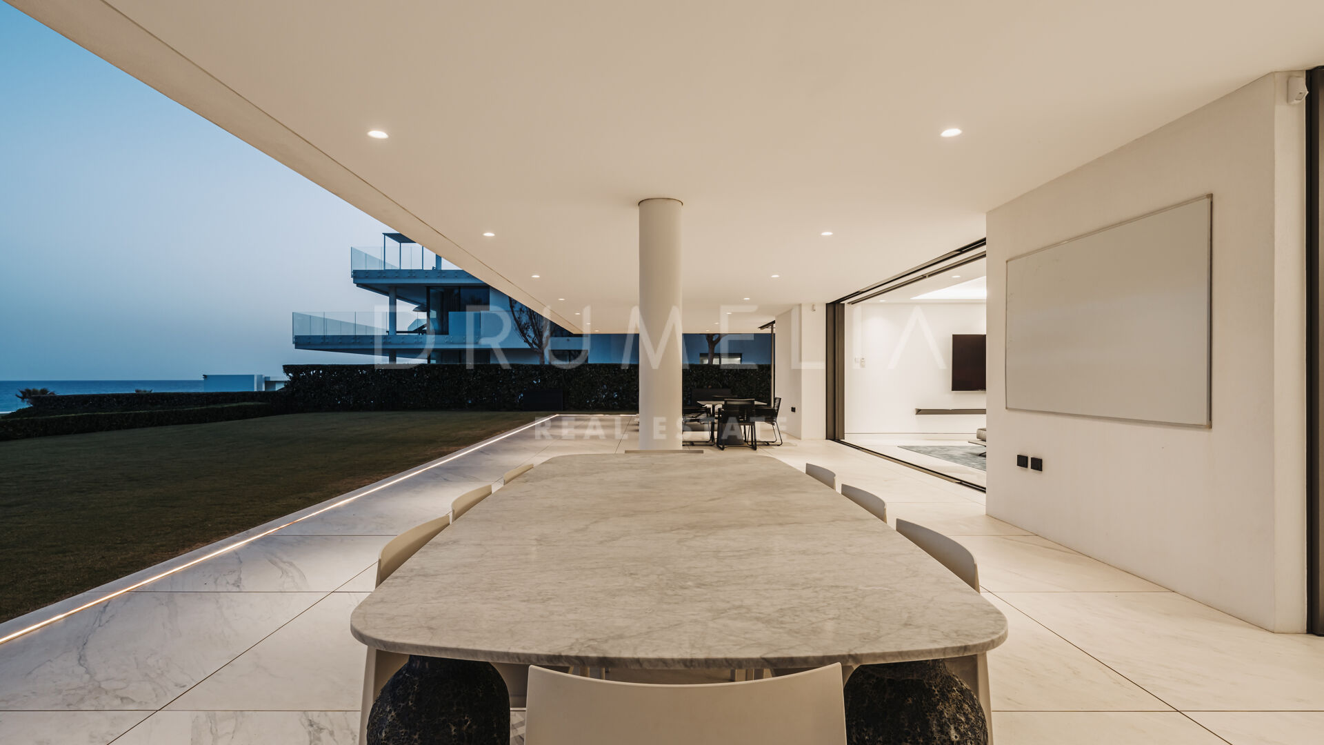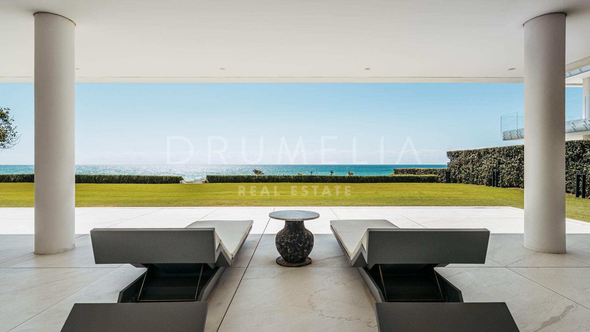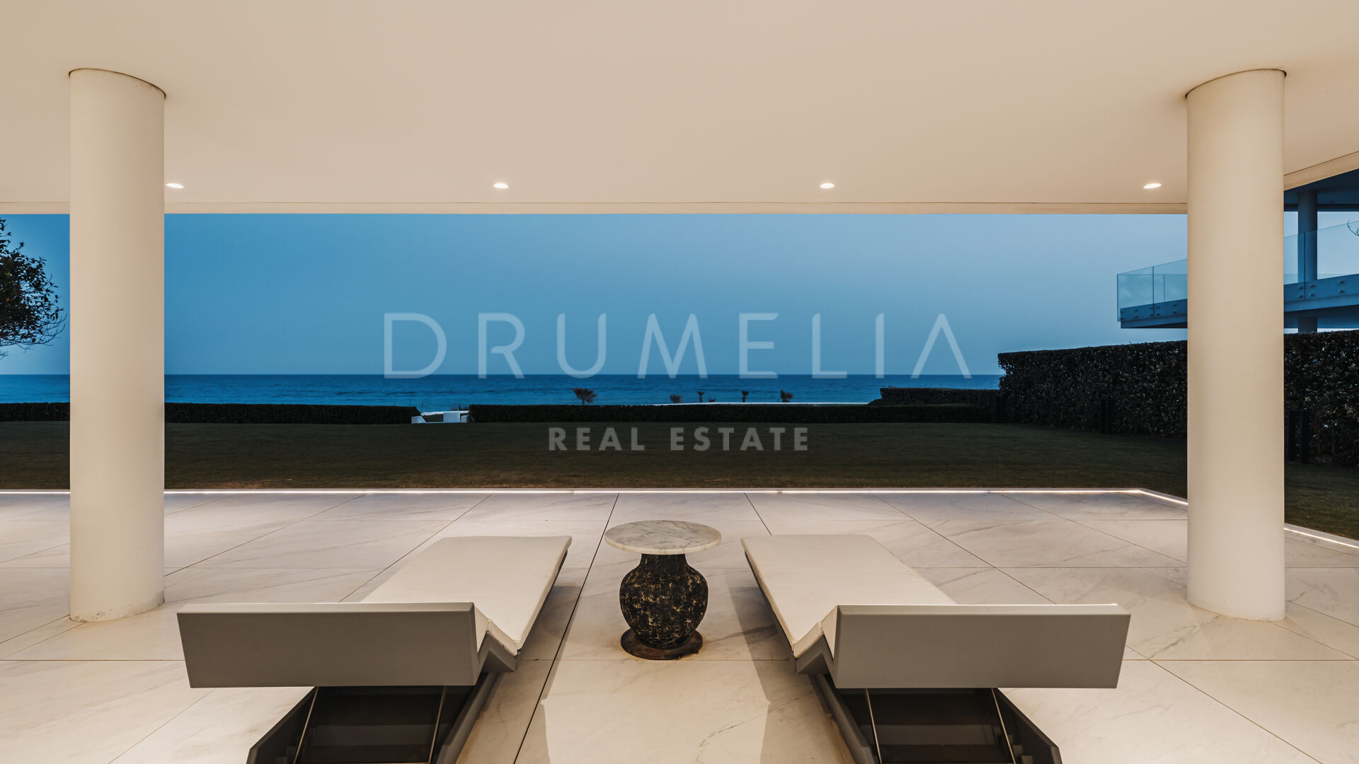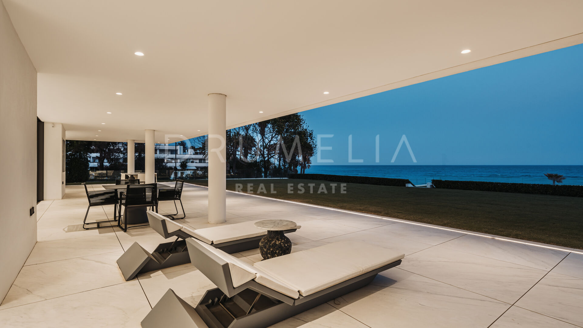 Met een tuin van 415 m² is deze ongelooflijke zuidgerichte woning van 453 m² perfect uitgerust en onberispelijk gepresenteerd, met een combinatie van open ruimte innovatief design met de hoogste kwaliteit materialen en de nieuwste technologieën. Het herbergt 4 stijlvolle slaapkamers met 4 en-suite luxe badkamers, een gastentoilet, een bioscoopzaal, een open woonkamer met een TV-salon, ontvangst- en eetruimtes en een strakke, volledig uitgeruste design keuken met een eiland / ontbijtruimte / bar. De leefruimtes leiden naar de prachtige overdekte terrassen van 146 m², ideaal voor de glorieuze mediterrane levensstijl. Het prachtige pand heeft een prachtig gazon en het strand direct voor de deur, waardoor u elke dag kunt genieten van een unieke, moeiteloos bevoorrechte woonervaring. Stelt u zich voor, u kunt het strand te voet bereiken in slechts één minuut!