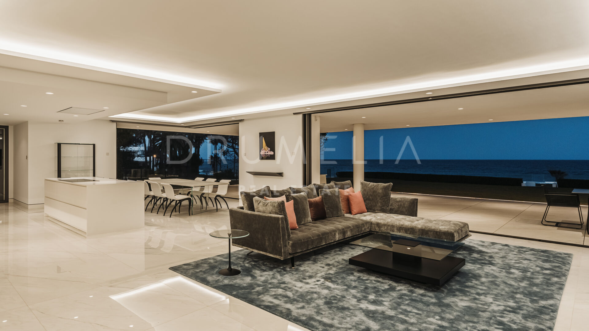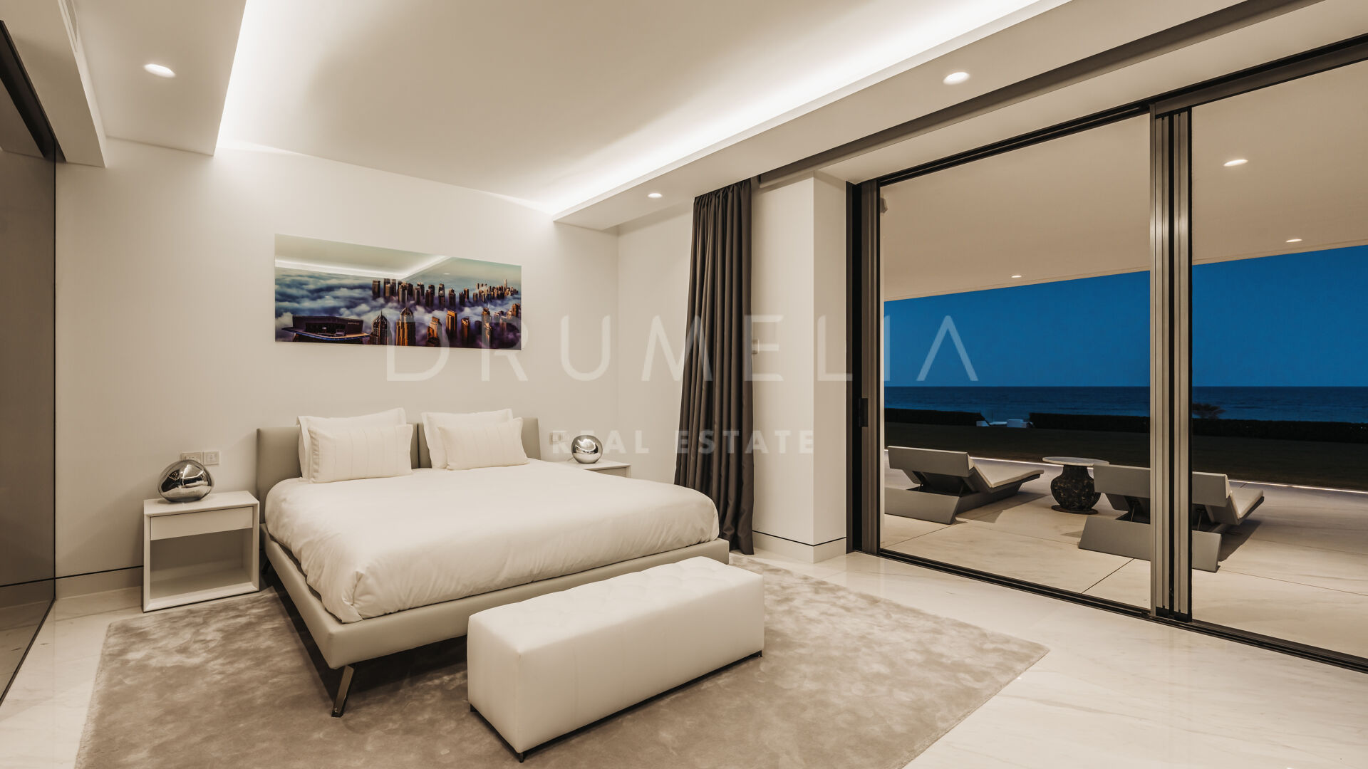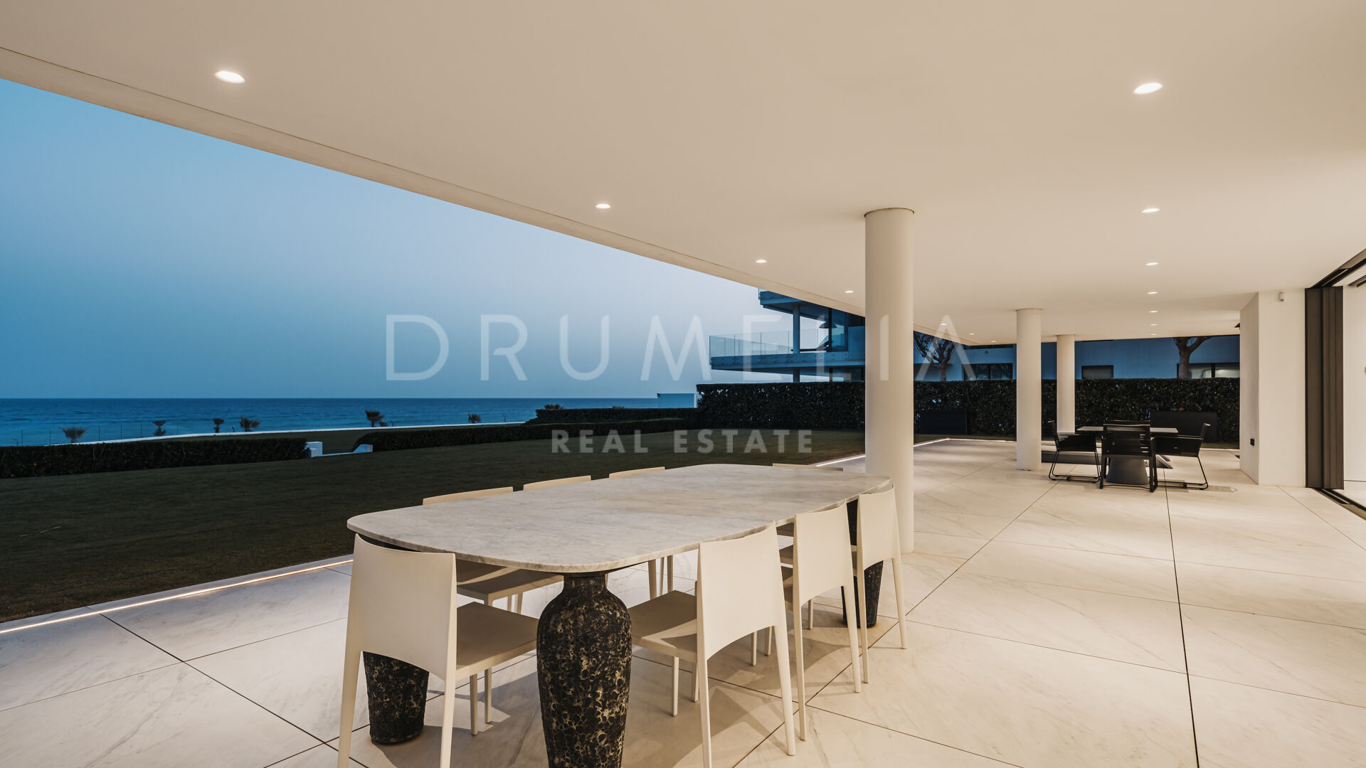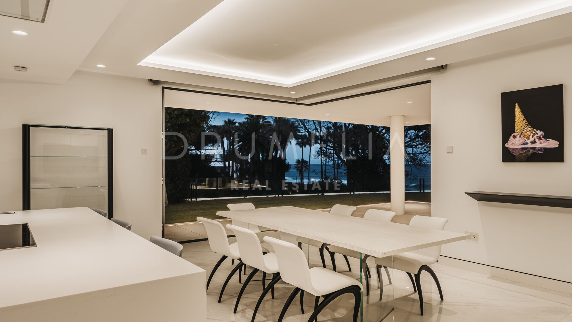 Met een tuin van 415 m² is deze ongelooflijke zuidgerichte woning van 453 m² perfect uitgerust en onberispelijk gepresenteerd, met een combinatie van open ruimte innovatief design met de hoogste kwaliteit materialen en de nieuwste technologieën. Het herbergt 4 stijlvolle slaapkamers met 4 en-suite luxe badkamers, een gastentoilet, een bioscoopzaal, een open woonkamer met een TV-salon, ontvangst- en eetruimtes en een strakke, volledig uitgeruste design keuken met een eiland / ontbijtruimte / bar. De leefruimtes leiden naar de prachtige overdekte terrassen van 146 m², ideaal voor de glorieuze mediterrane levensstijl. Het prachtige pand heeft een prachtig gazon en het strand direct voor de deur, waardoor u elke dag kunt genieten van een unieke, moeiteloos bevoorrechte woonervaring. Stelt u zich voor, u kunt het strand te voet bereiken in slechts één minuut!