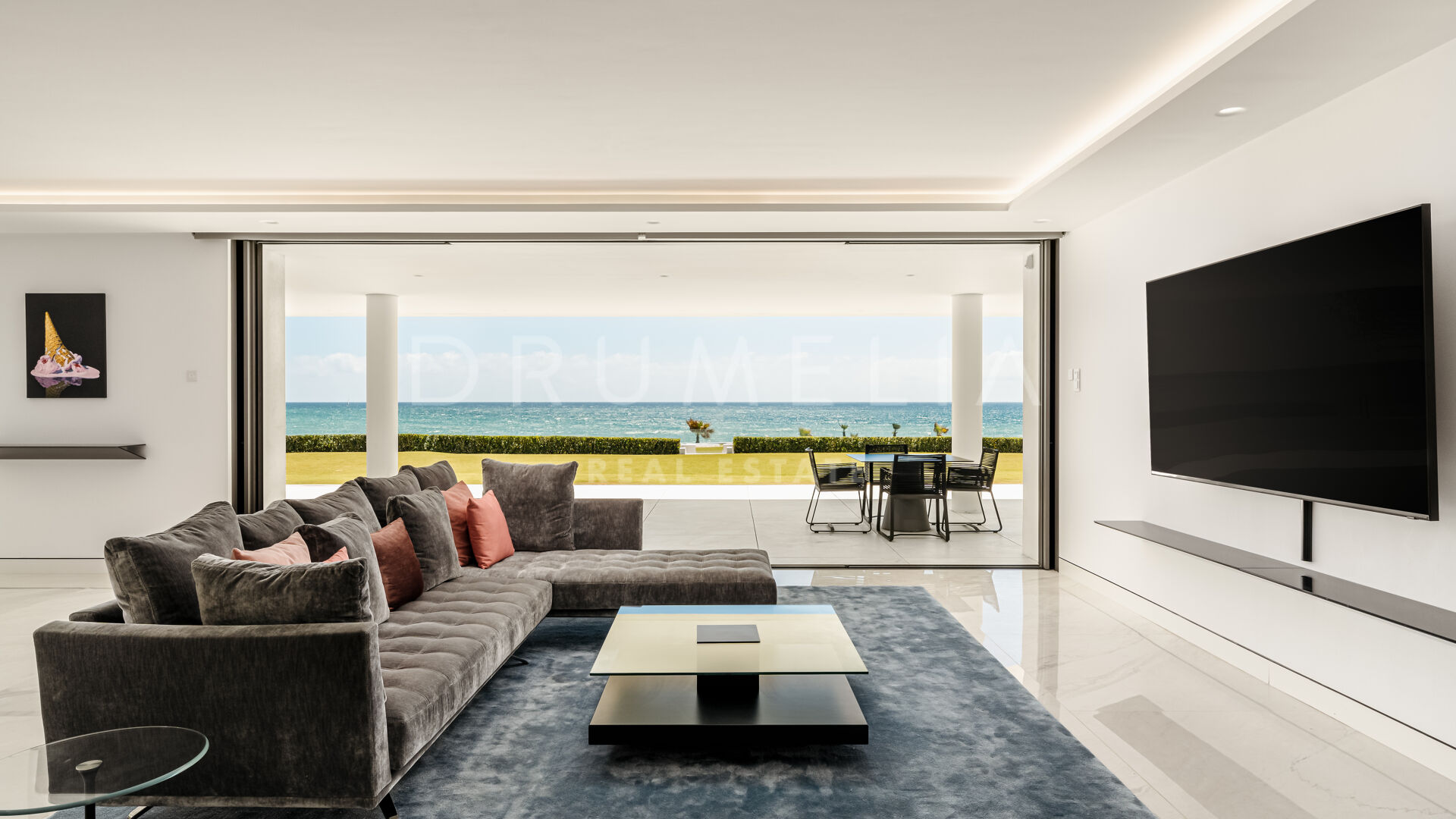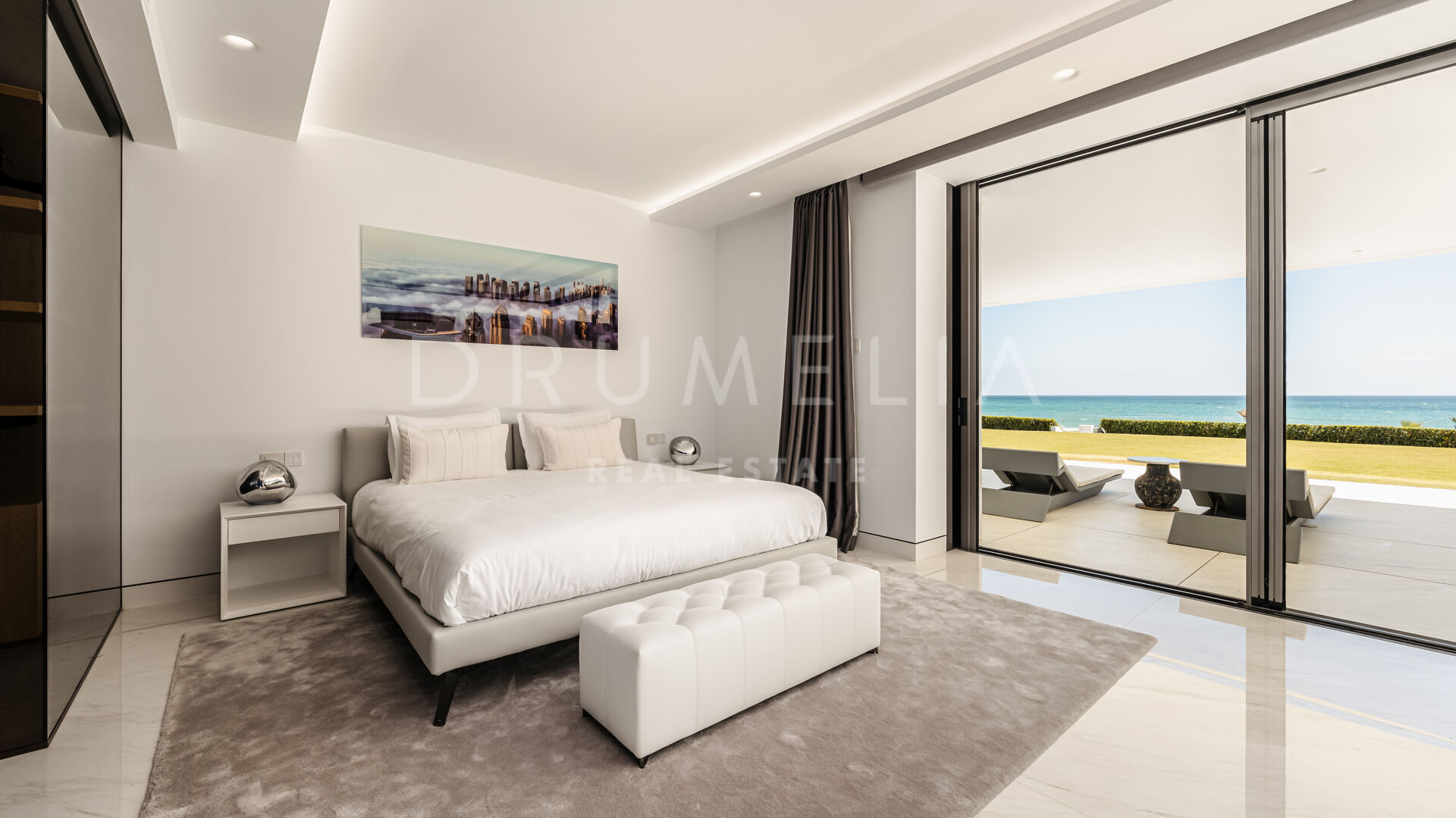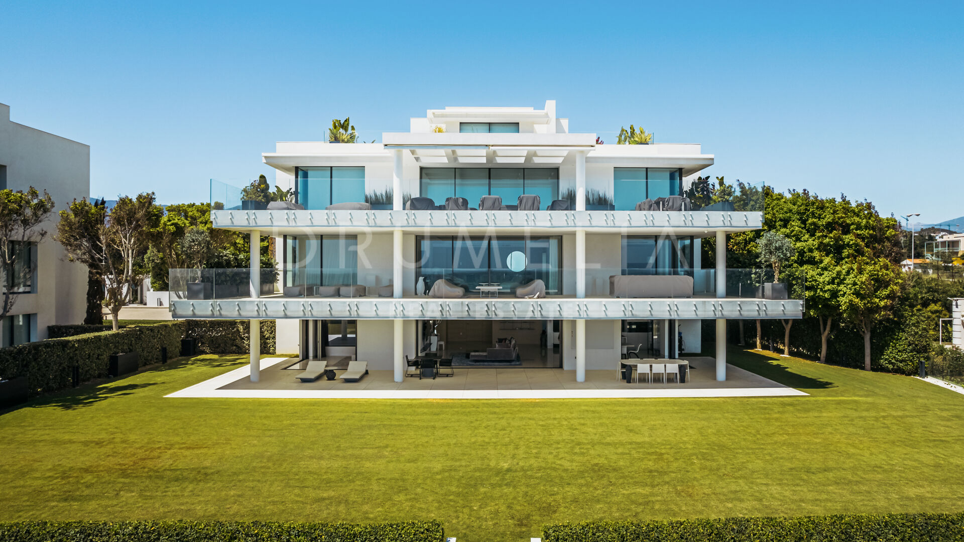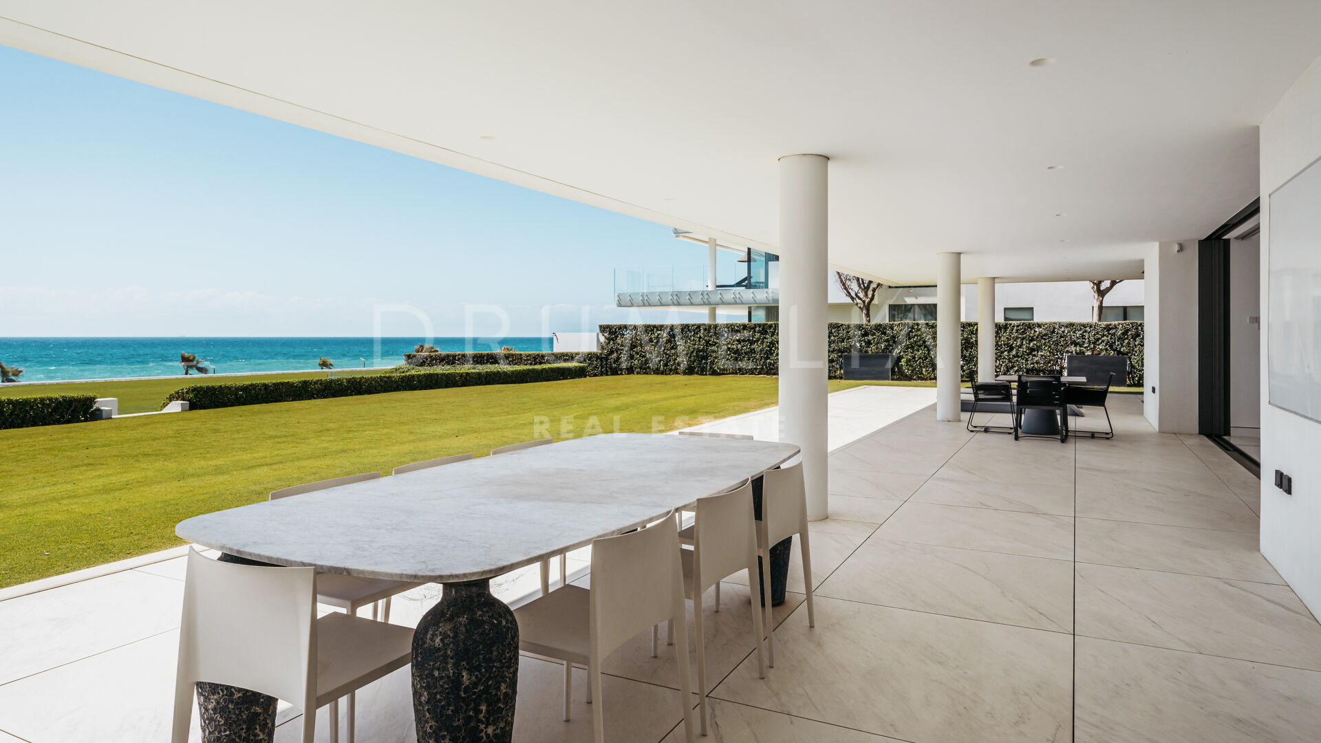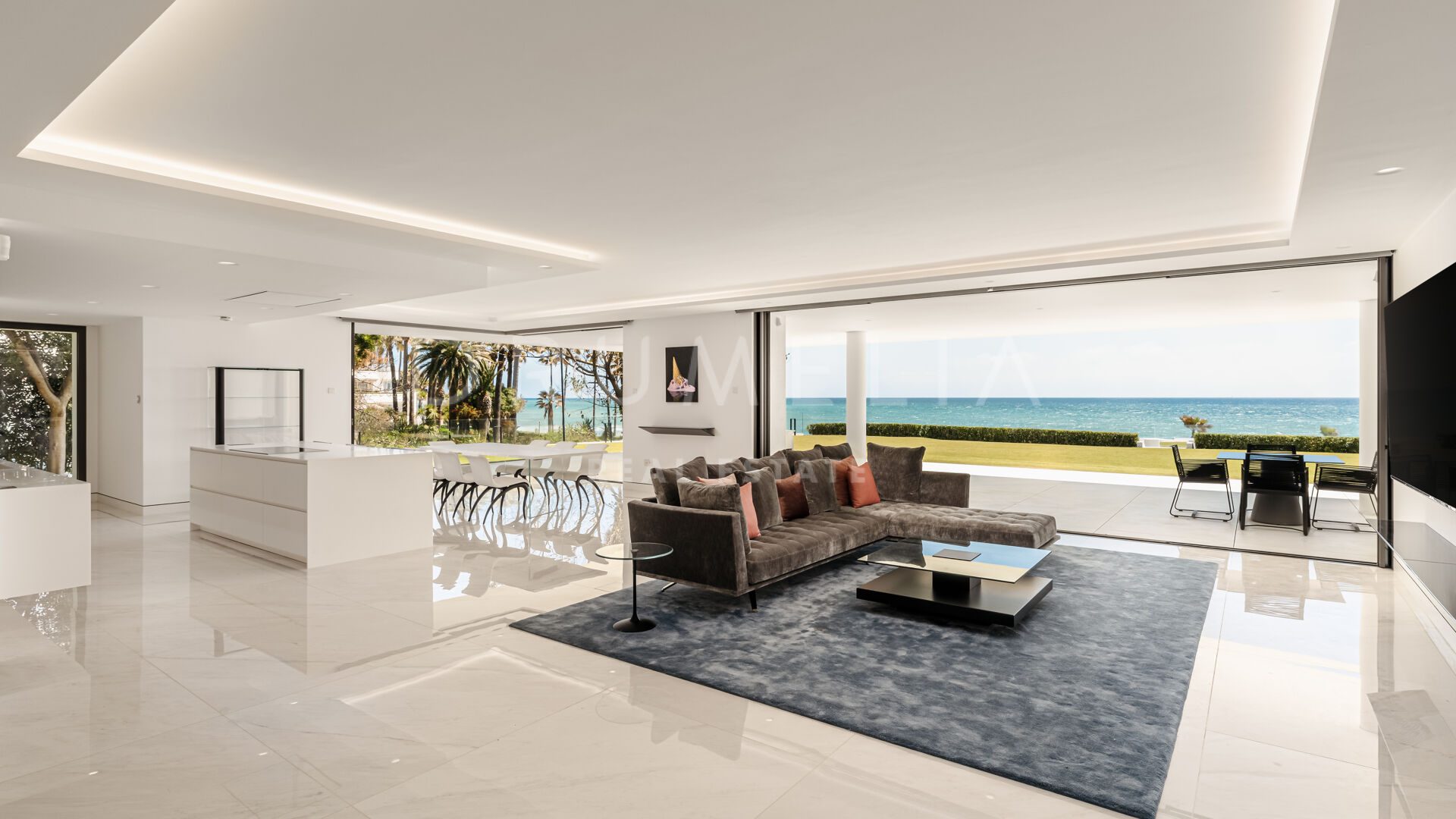 Met een tuin van 415 m² is deze ongelooflijke zuidgerichte woning van 453 m² perfect uitgerust en onberispelijk gepresenteerd, met een combinatie van open ruimte innovatief design met de hoogste kwaliteit materialen en de nieuwste technologieën. Het herbergt 4 stijlvolle slaapkamers met 4 en-suite luxe badkamers, een gastentoilet, een bioscoopzaal, een open woonkamer met een TV-salon, ontvangst- en eetruimtes en een strakke, volledig uitgeruste design keuken met een eiland / ontbijtruimte / bar. De leefruimtes leiden naar de prachtige overdekte terrassen van 146 m², ideaal voor de glorieuze mediterrane levensstijl. Het prachtige pand heeft een prachtig gazon en het strand direct voor de deur, waardoor u elke dag kunt genieten van een unieke, moeiteloos bevoorrechte woonervaring. Stelt u zich voor, u kunt het strand te voet bereiken in slechts één minuut!
