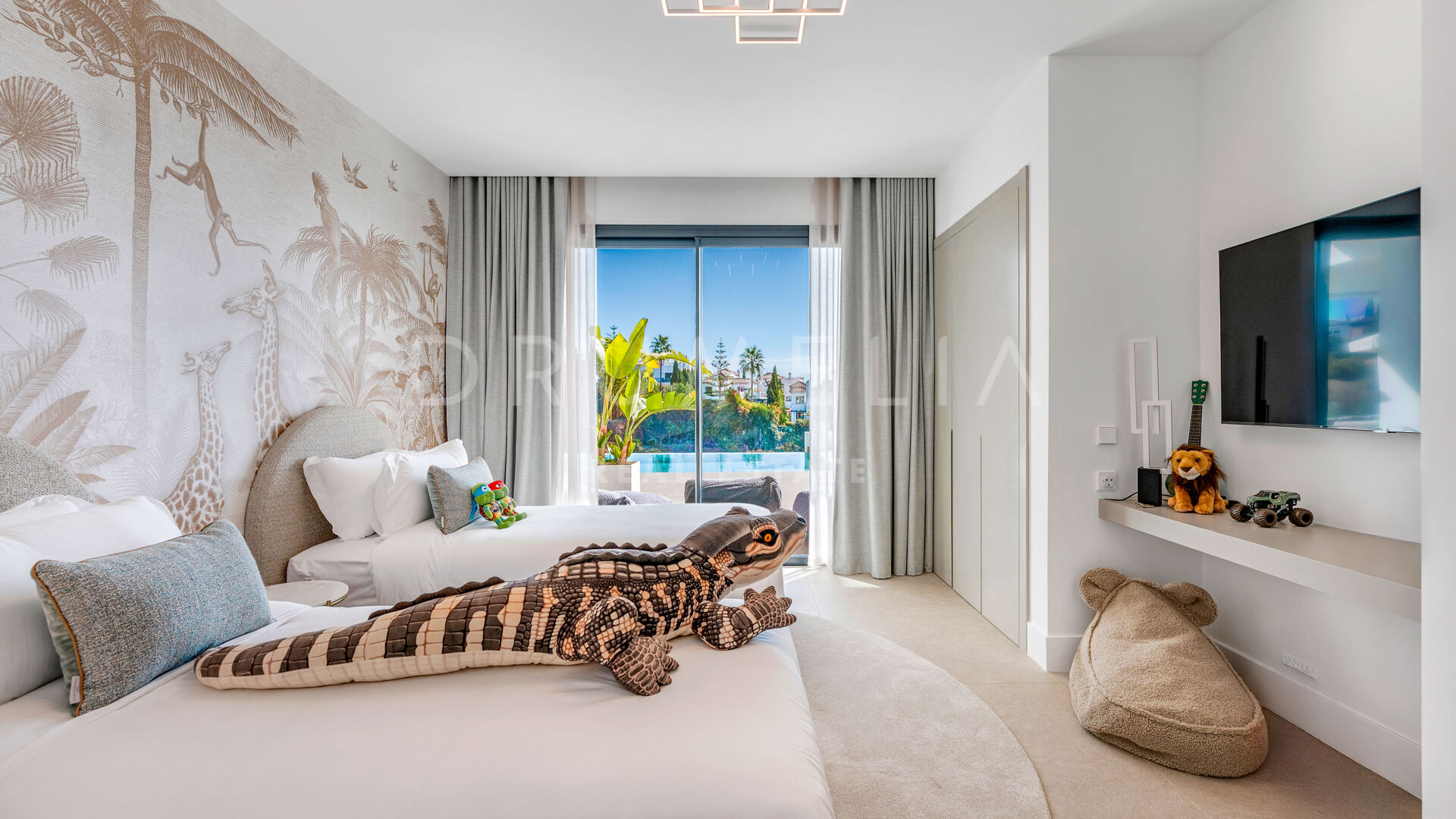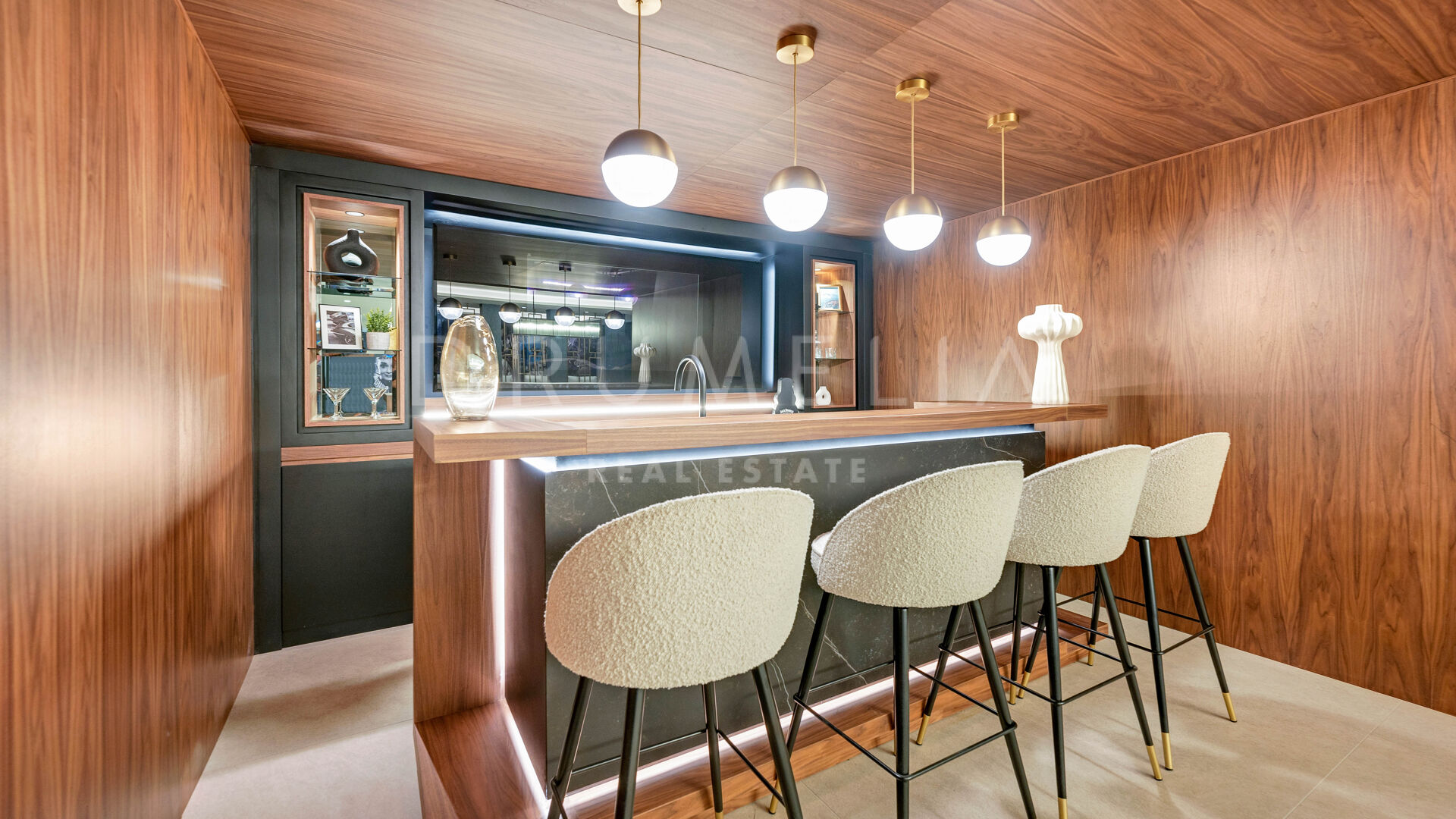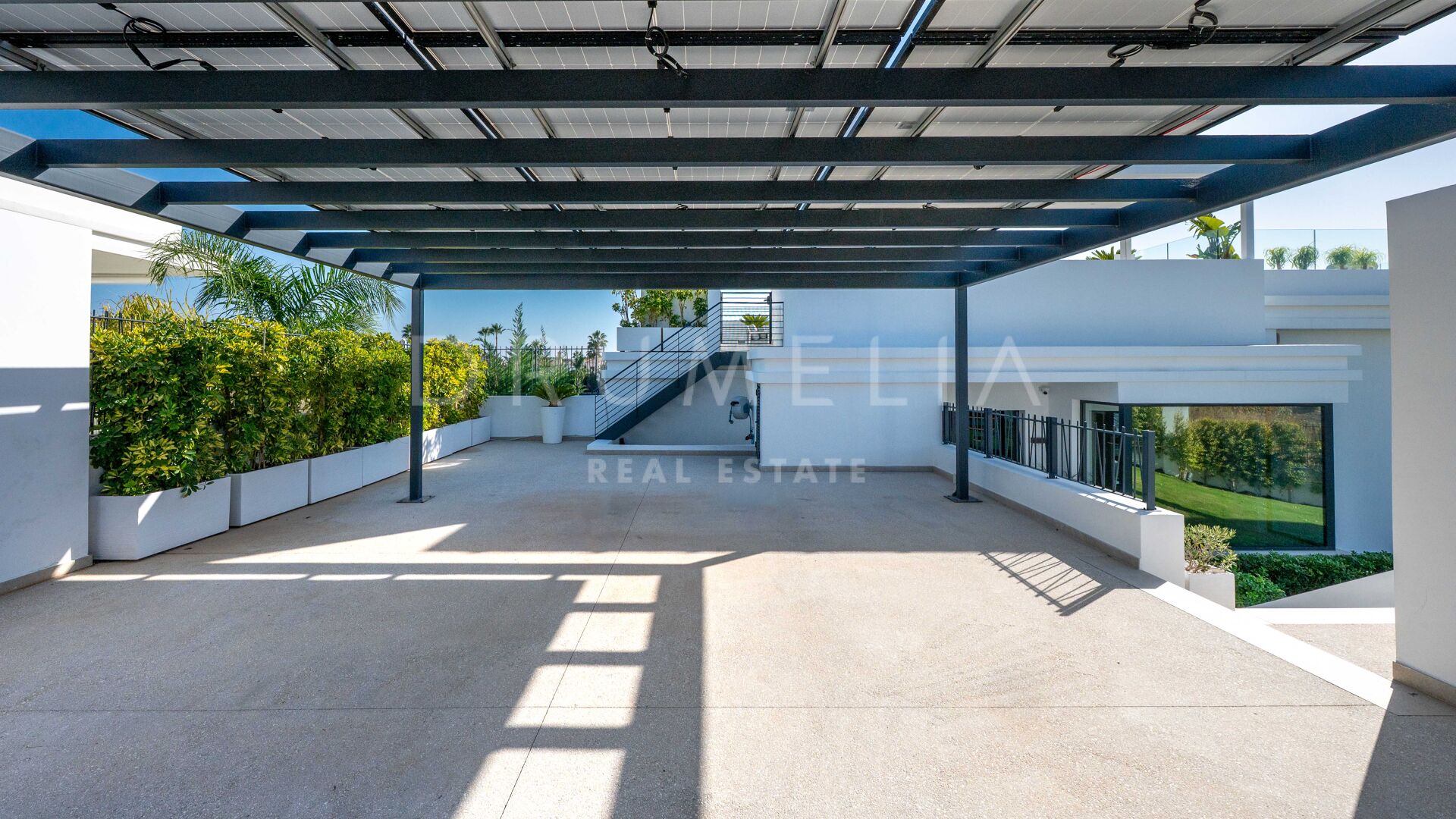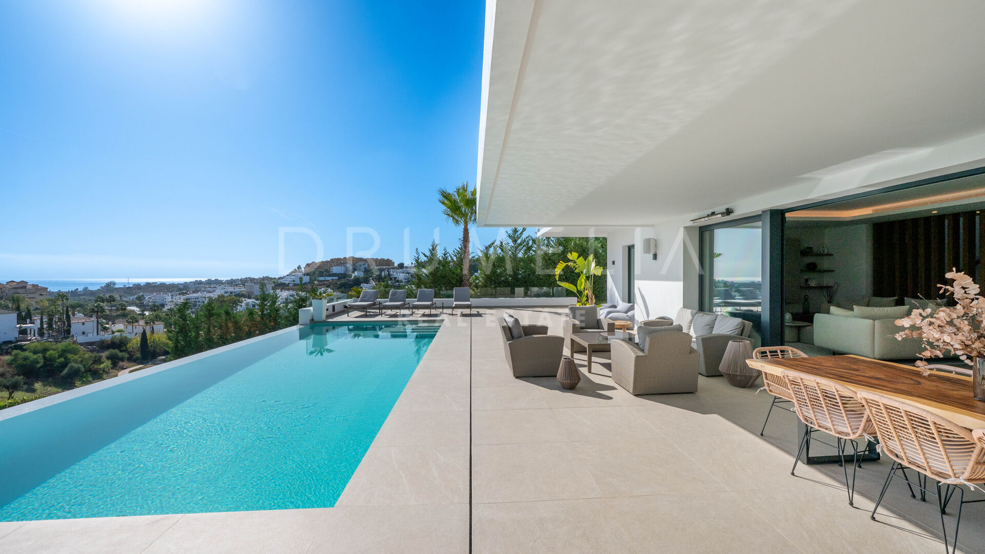 De bovenverdieping biedt volledige privacy, met een master suite met terras, inloopkast en marmeren badkamer. De benedenverdieping omvat een wellness- en entertainmentruimte met bioscoop, wijnkelder, fitnessruimte, sauna, stoombad, koud dompelbad, speelkamer en designbar, evenals twee slaapkamers met eigen badkamer. Een solarium met 360°-uitzicht biedt een adembenemend uitzicht op Gibraltar en het Atlasgebergte, wat een moderne en luxe kustbelevenis compleet maakt.