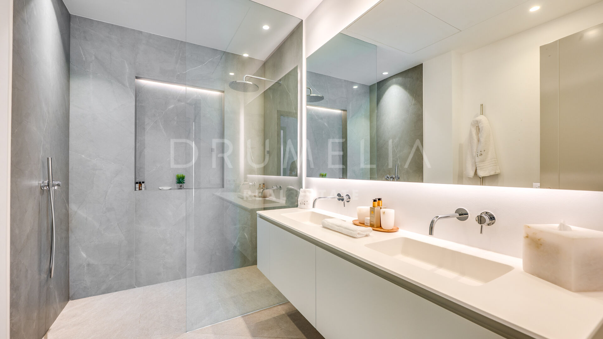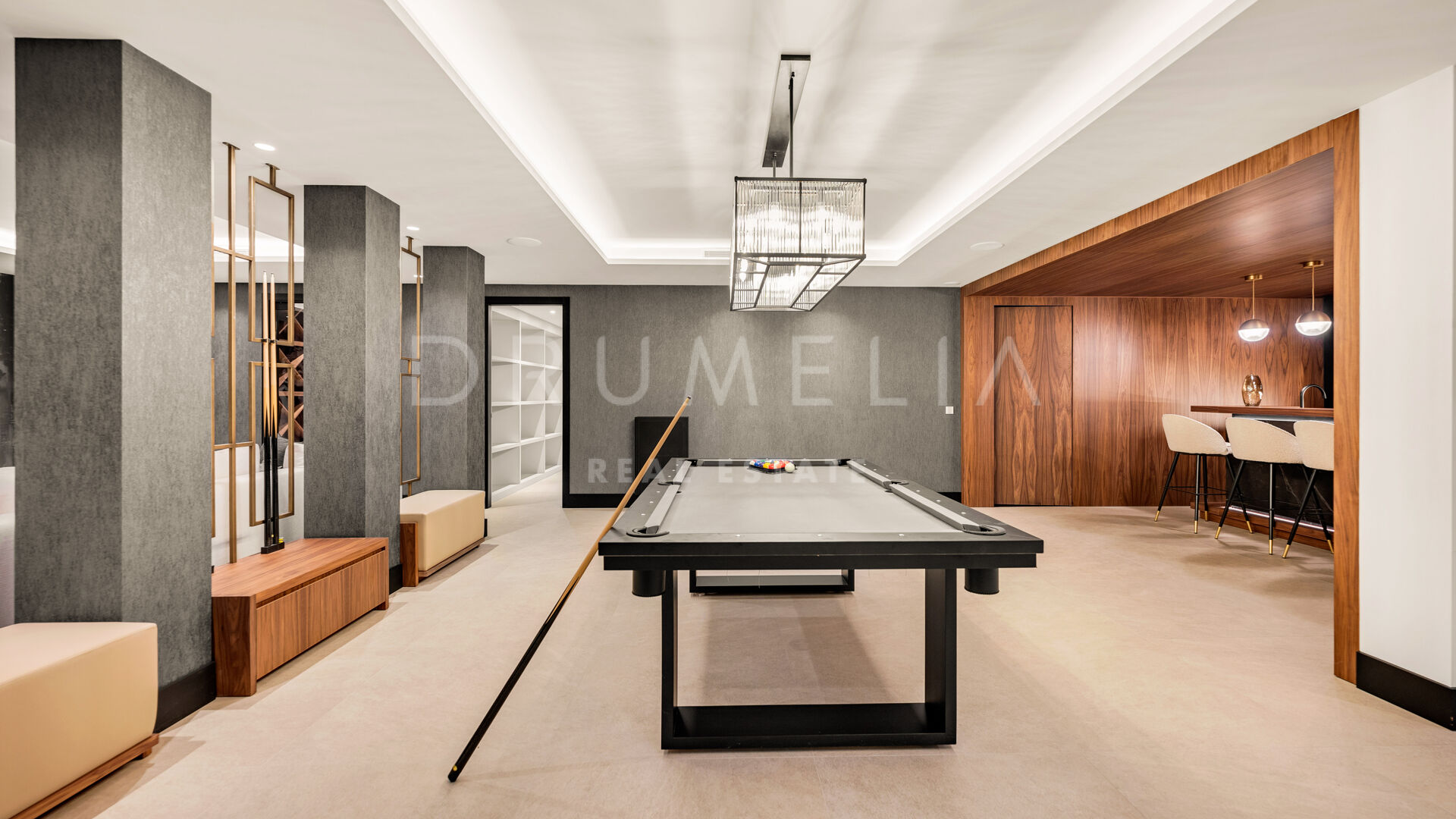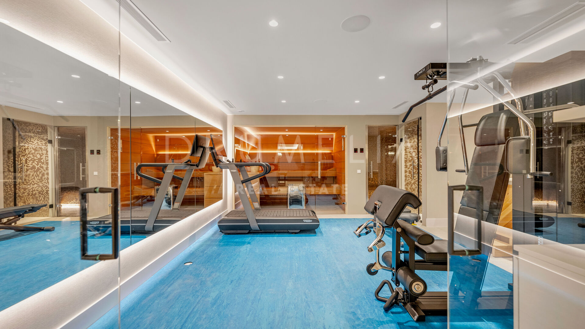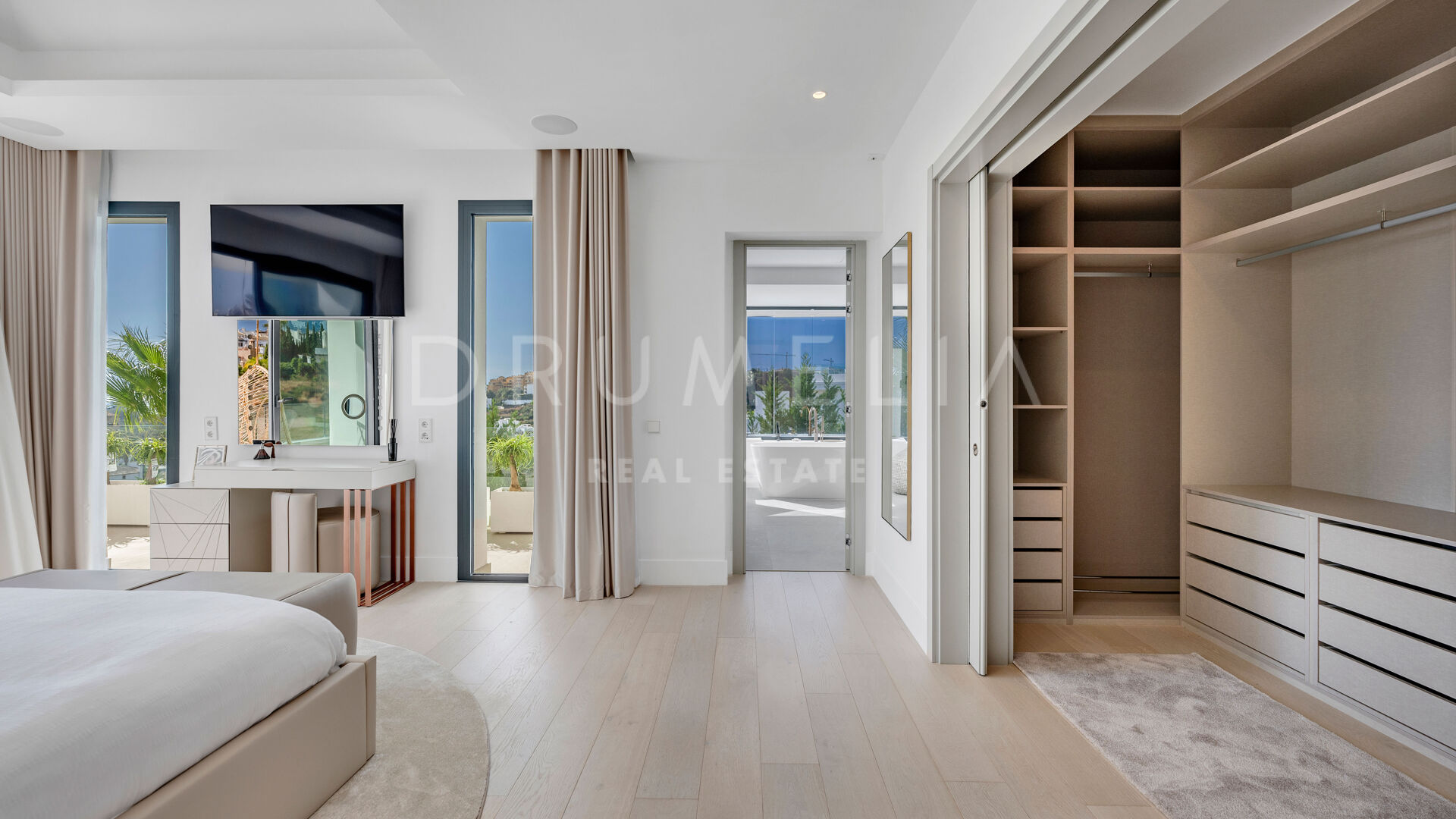 De bovenverdieping biedt volledige privacy, met een master suite met terras, inloopkast en marmeren badkamer. De benedenverdieping omvat een wellness- en entertainmentruimte met bioscoop, wijnkelder, fitnessruimte, sauna, stoombad, koud dompelbad, speelkamer en designbar, evenals twee slaapkamers met eigen badkamer. Een solarium met 360°-uitzicht biedt een adembenemend uitzicht op Gibraltar en het Atlasgebergte, wat een moderne en luxe kustbelevenis compleet maakt.