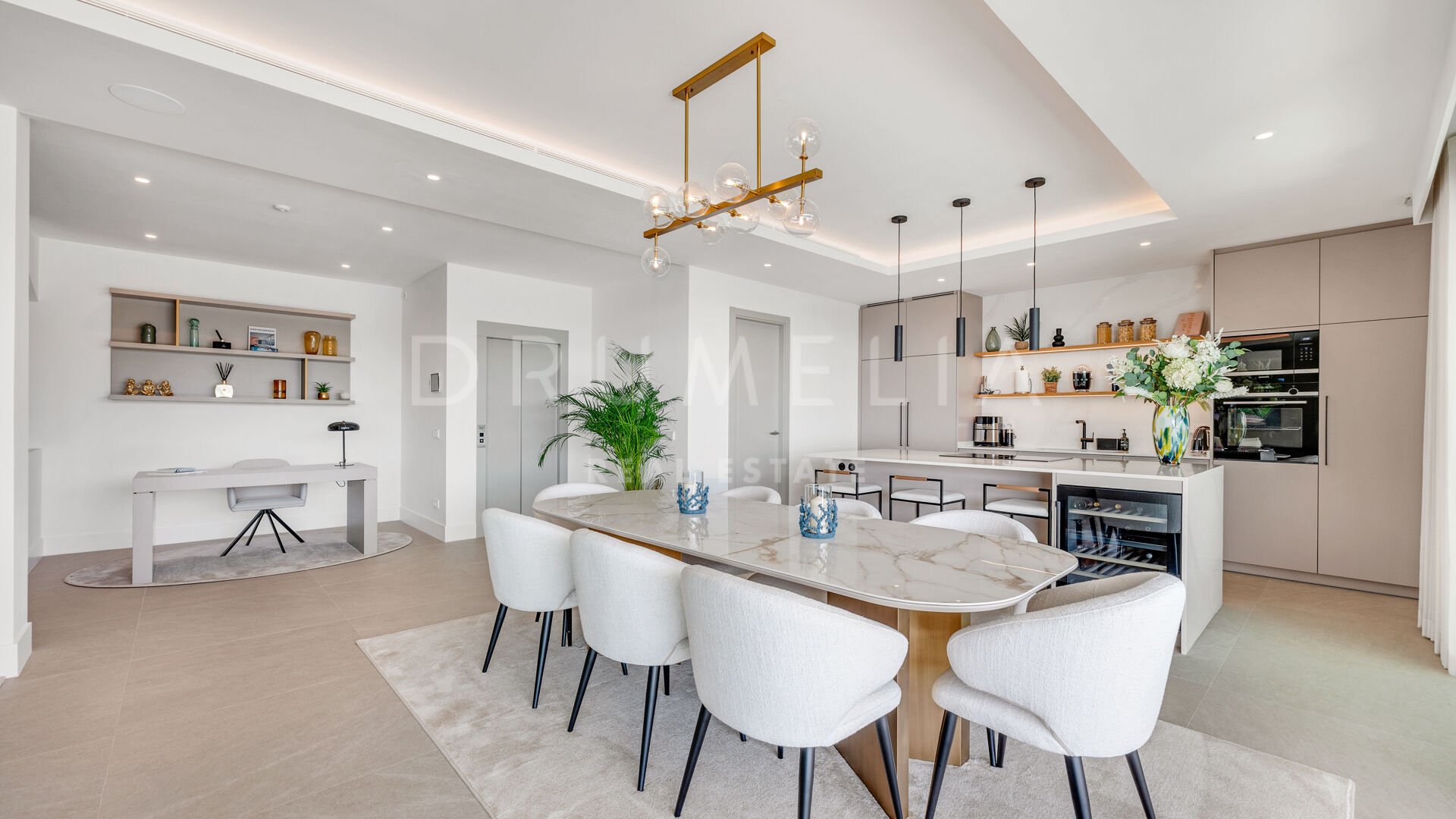 Deze indrukwekkende villa van vier verdiepingen bevindt zich in de exclusieve gemeenschap van La Resina Golf en biedt 674 m² woonruimte en 249 m² terrassen. Het moderne ontwerp zorgt voor een naadloze verbinding tussen binnen en buiten, met overvloedig natuurlijk licht en strakke architectonische lijnen. De privé-ingang en het uitzicht op de Middellandse Zee en de golfbaan zorgen voor een indrukwekkende eerste indruk.