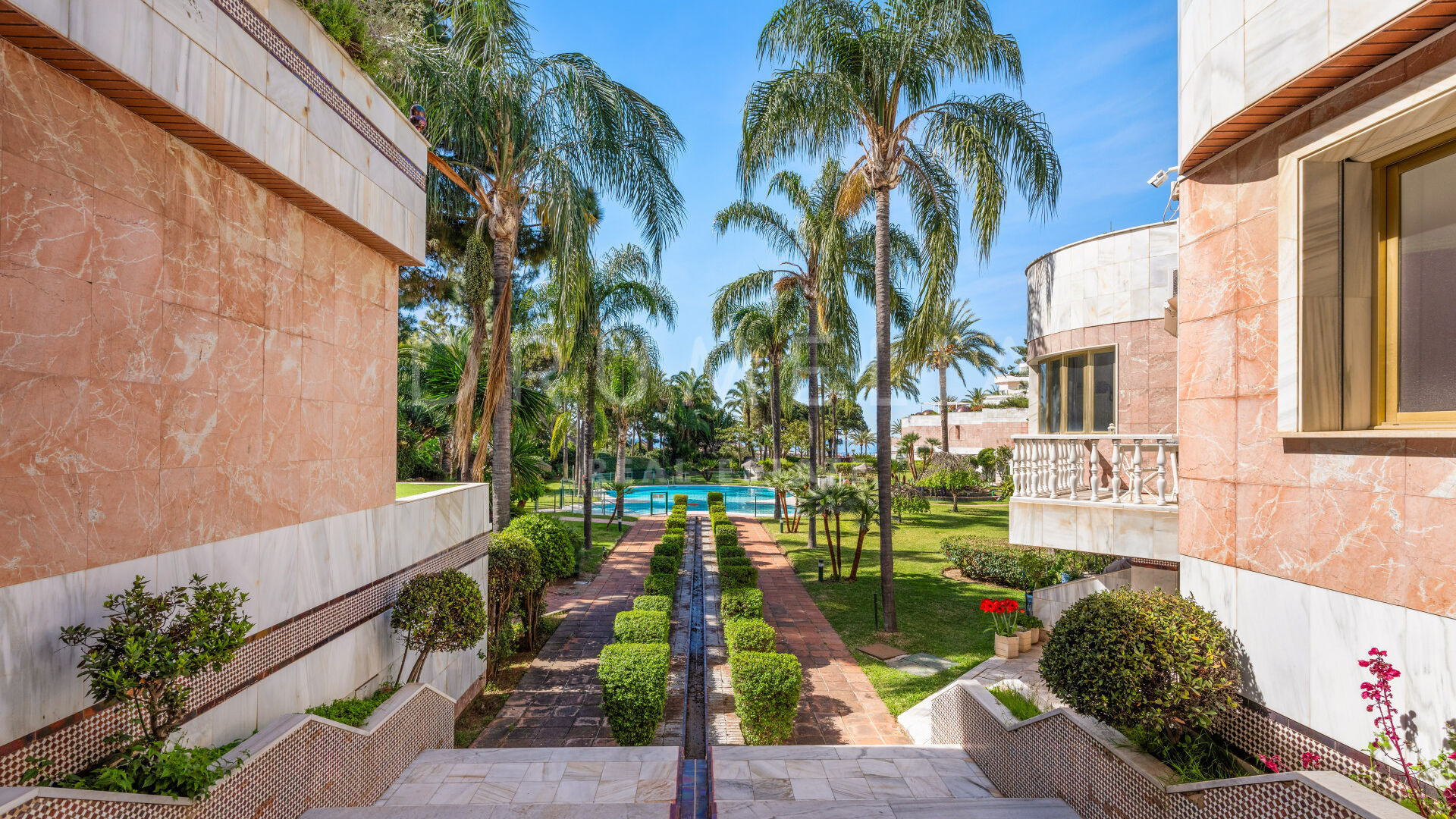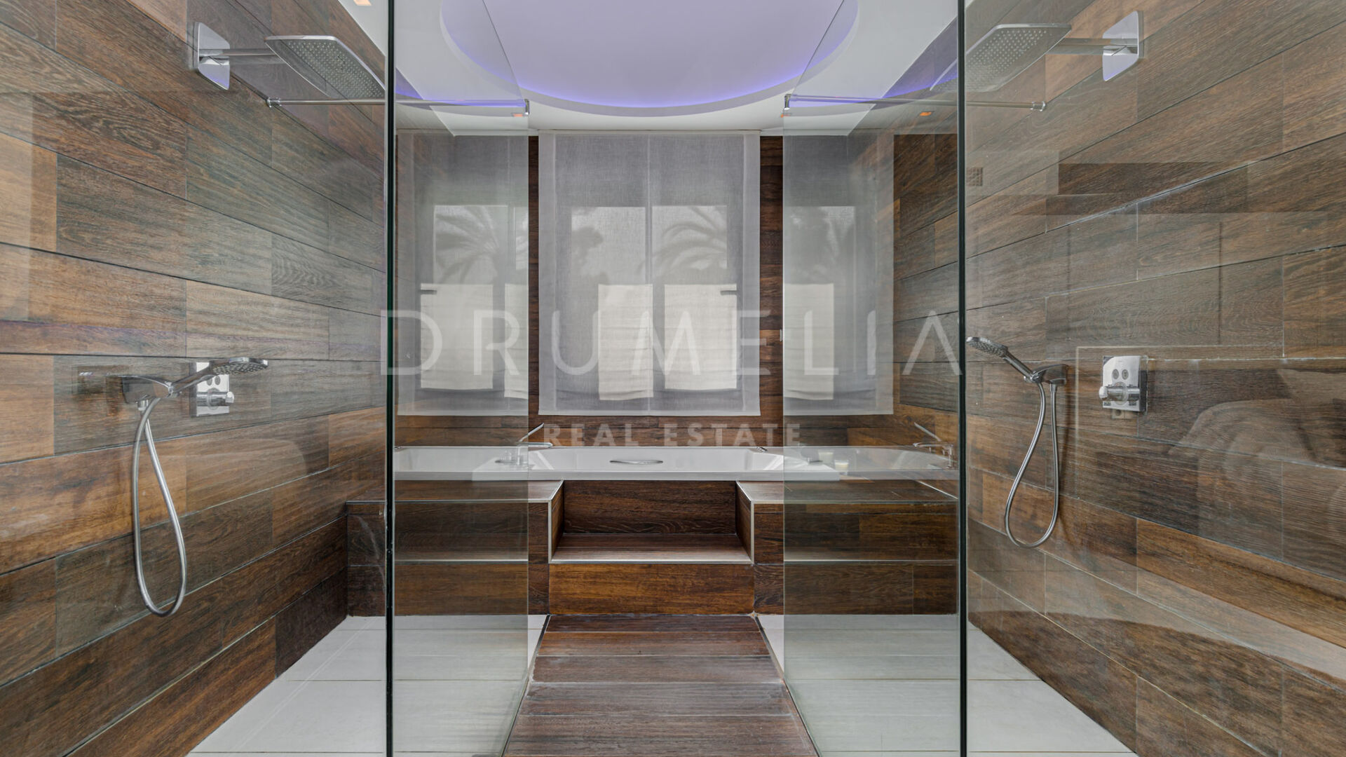 De ideale residentie in het hart van het beroemde Puerto Banus, direct aan zee. Een eerstelijns villa aan zee met 3 slaapkamers en 4 badkamers. Het duplex appartement op de begane grond heeft een grote entreehal in paleisstijl die leidt naar een prachtige open woonkamer op de benedenverdieping en een afgezonderde ruimte op de bovenverdieping met 3 slaapkamers met 3 en-suite badkamers. De master suite is verdeeld in 3 zones: His and Hers kleedruimtes aan elke kant van de ingang die leidt naar het slaapgedeelte met vrij uitzicht op zee en toegang tot een licht terras, en het badkamergedeelte met His and Hers douches, een jacuzzibad met uitzicht op zee en een apart toilet.