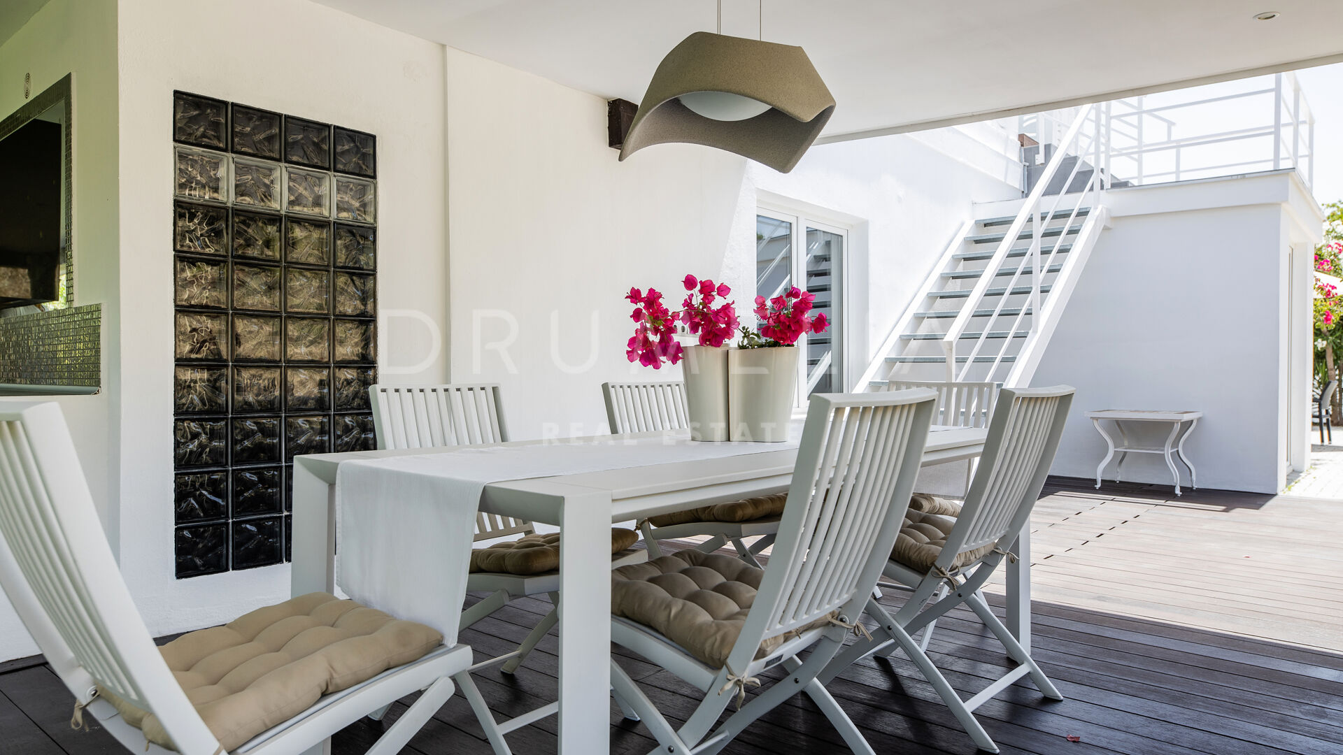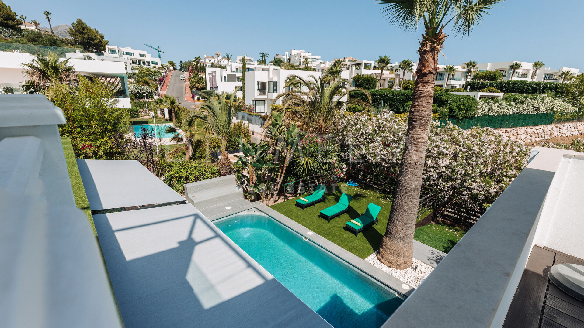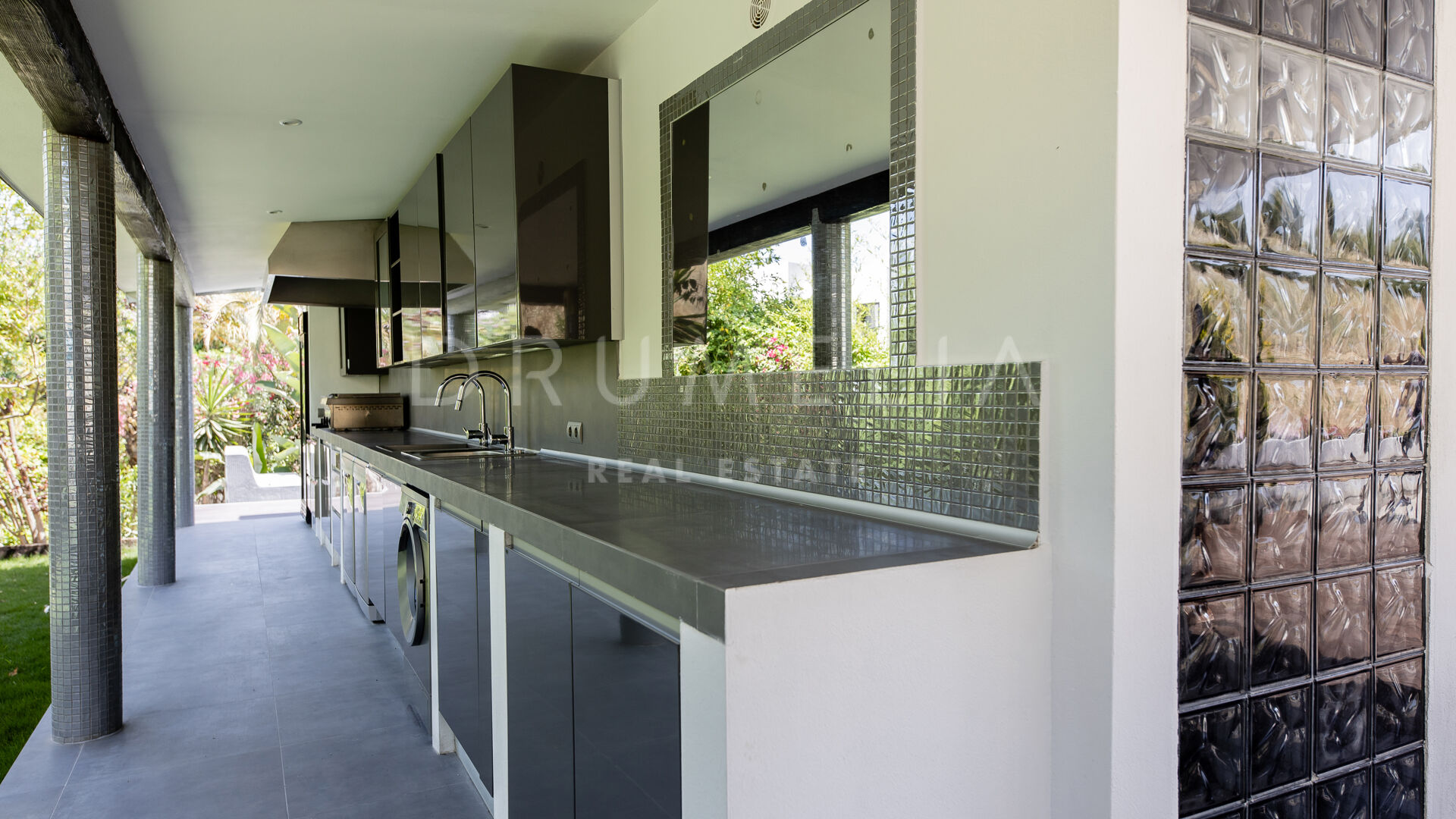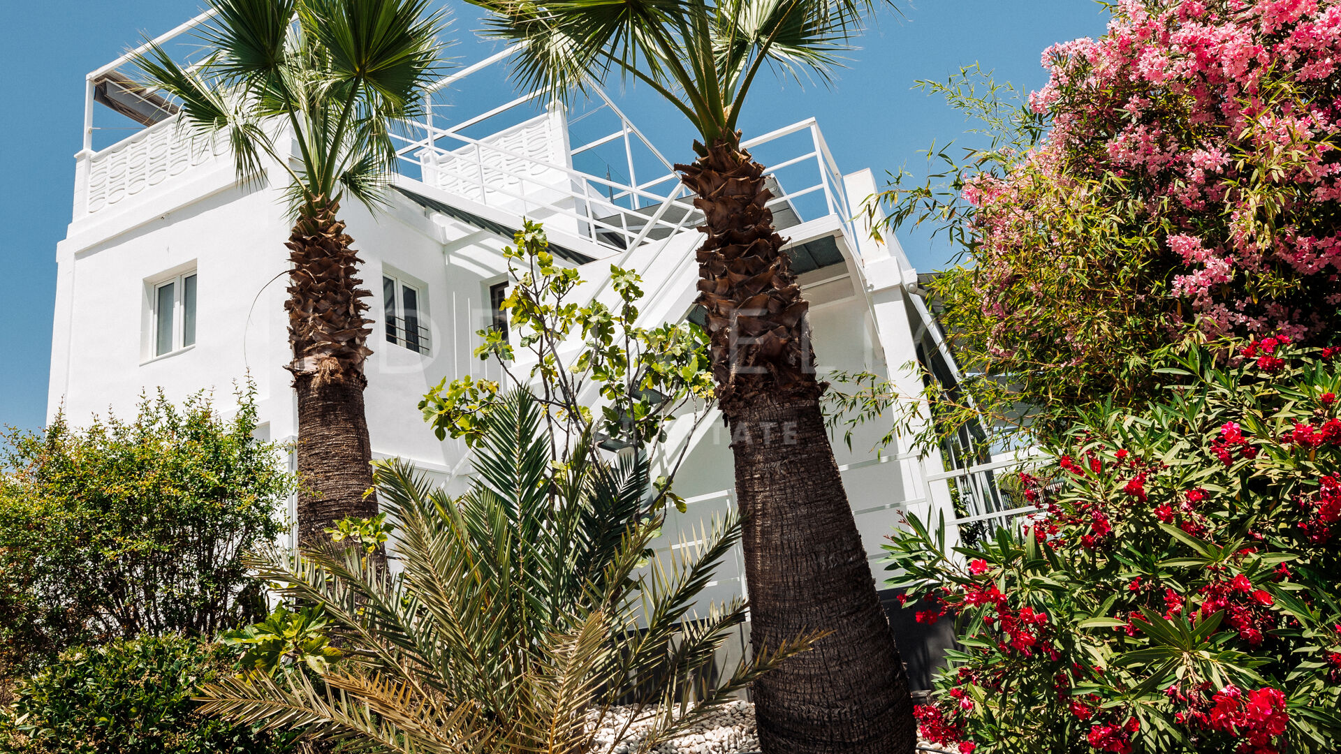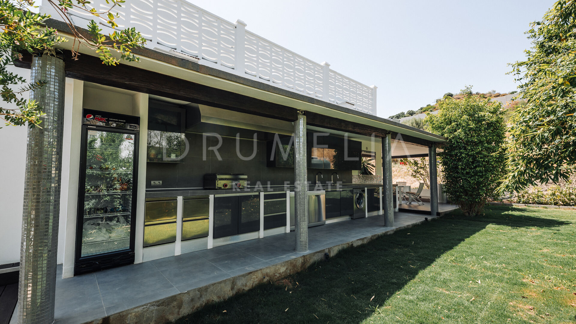 Het fabelachtige huis opent naar een grote en uitnodigende open woon-, eet- en keukenruimte die naar patio’s aan weerszijden van het terrein leidt. Het buitenleven is erg belangrijk voor de Mediterrane levensstijl en deze villa werd ontworpen met dat in gedachten. Je kunt er genieten van de stralende zonnige dagen aan de Costa del Sol bij het zwembad of ontspannen in de schaduw van de bomen, schommelend in een hangmat. De tuinen zijn schitterend en je wordt er omringd door bloeiende bloemen en volwassen bomen. Op de benedenverdieping heb je een complete professionele buitenkeuken die geschikt is voor grote evenementen. Op de bovenverdieping kun je op een enorm terras genieten van het serene uitzicht, de volle dagzon en het beste klimaat van het Europese vasteland. Het dakterras nodigt uit tot ontspannen met een cocktail in een jacuzzi terwijl je het indrukwekkende uitzicht op La Concha en de Middellandse Zee bewondert.