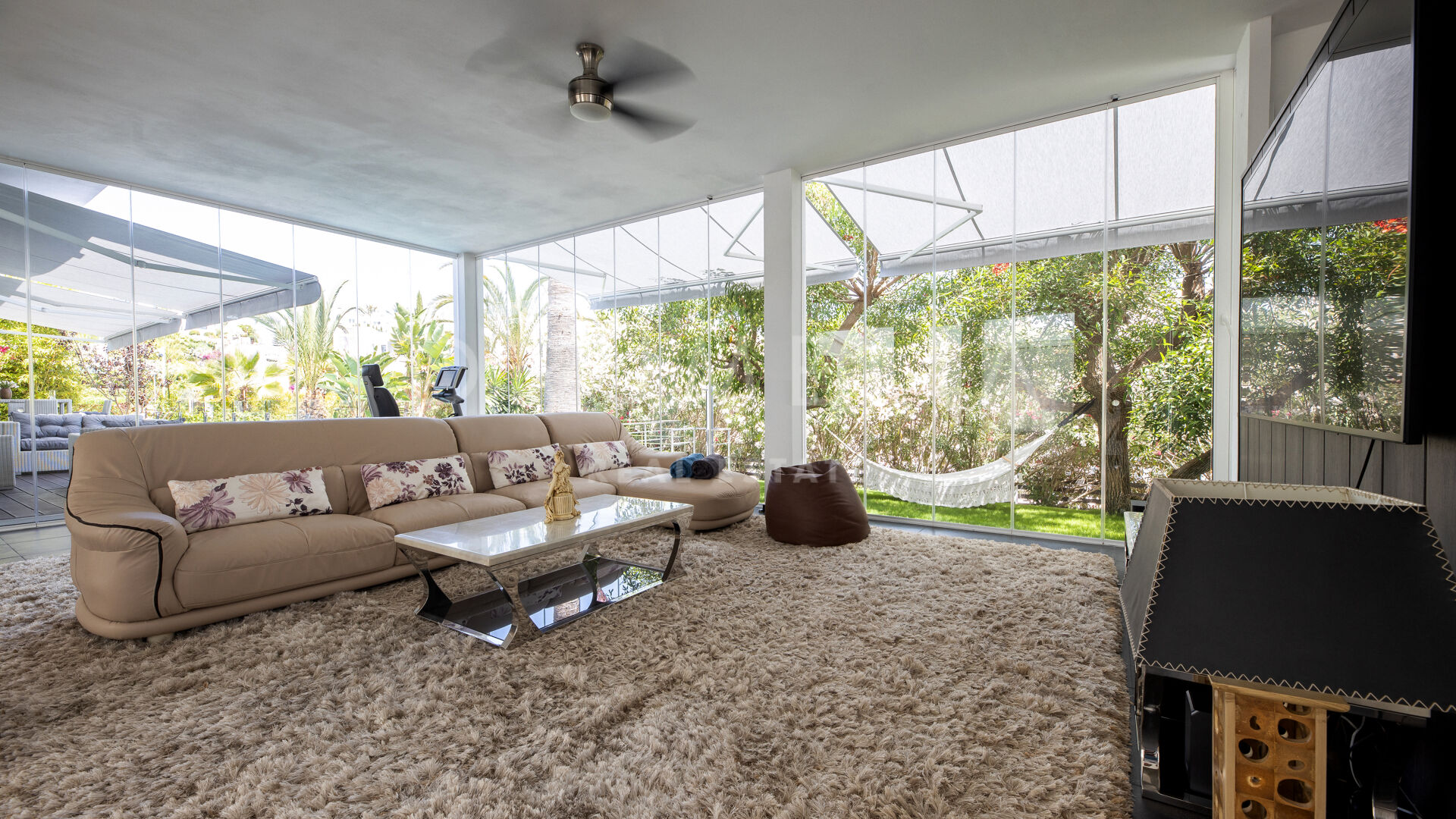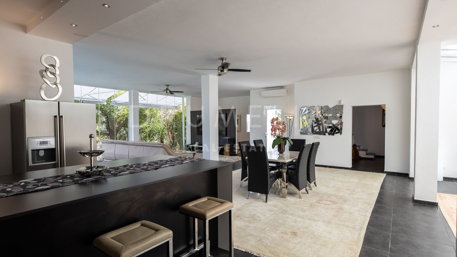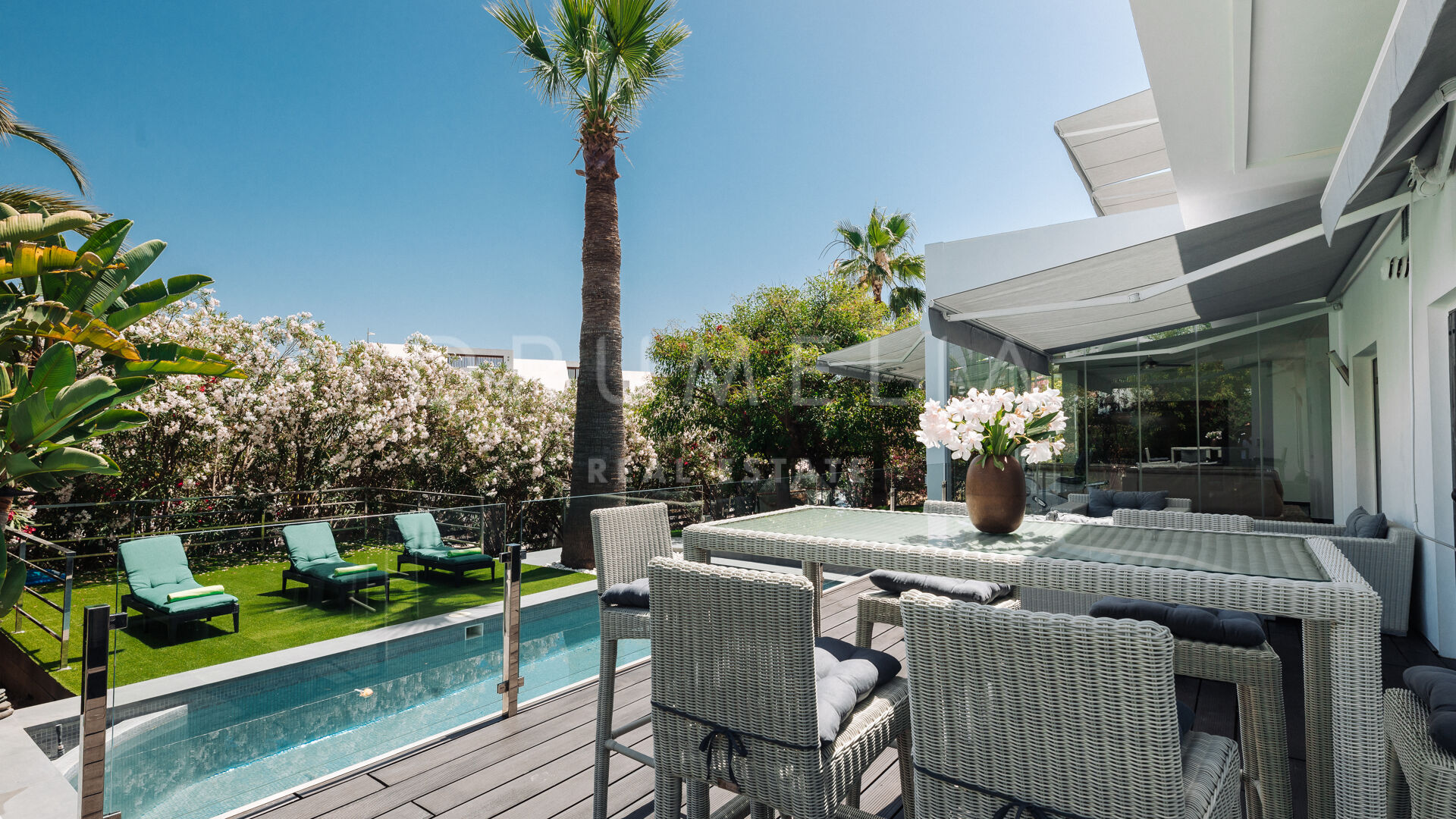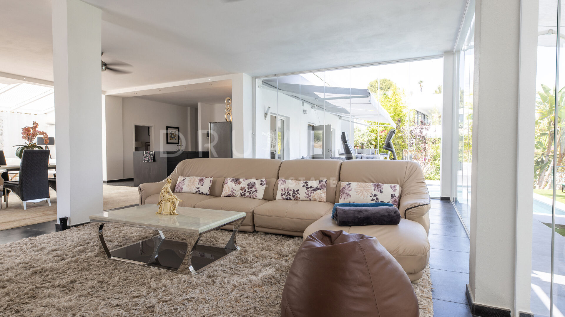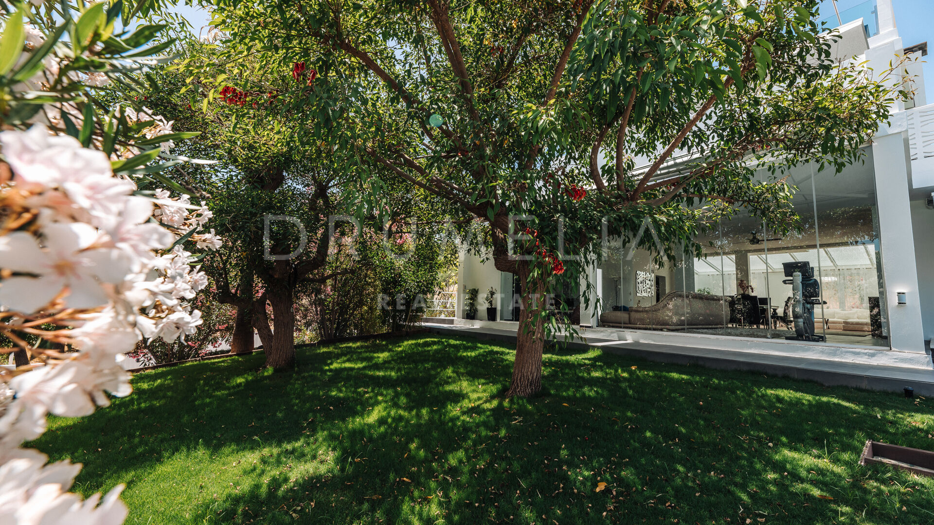 Het fabelachtige huis opent naar een grote en uitnodigende open woon-, eet- en keukenruimte die naar patio’s aan weerszijden van het terrein leidt. Het buitenleven is erg belangrijk voor de Mediterrane levensstijl en deze villa werd ontworpen met dat in gedachten. Je kunt er genieten van de stralende zonnige dagen aan de Costa del Sol bij het zwembad of ontspannen in de schaduw van de bomen, schommelend in een hangmat. De tuinen zijn schitterend en je wordt er omringd door bloeiende bloemen en volwassen bomen. Op de benedenverdieping heb je een complete professionele buitenkeuken die geschikt is voor grote evenementen. Op de bovenverdieping kun je op een enorm terras genieten van het serene uitzicht, de volle dagzon en het beste klimaat van het Europese vasteland. Het dakterras nodigt uit tot ontspannen met een cocktail in een jacuzzi terwijl je het indrukwekkende uitzicht op La Concha en de Middellandse Zee bewondert.