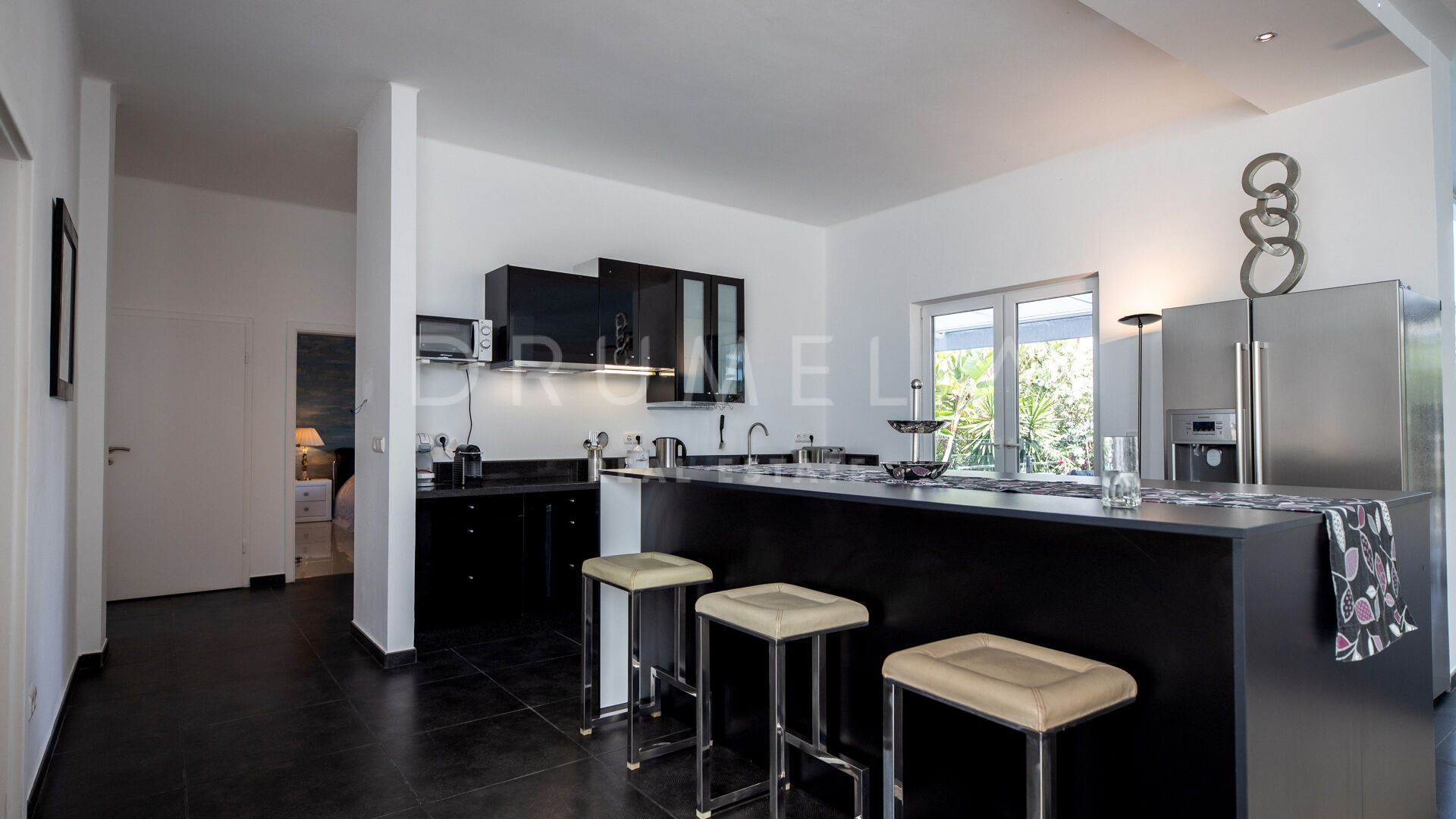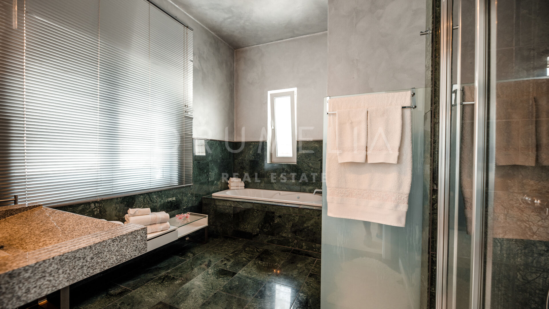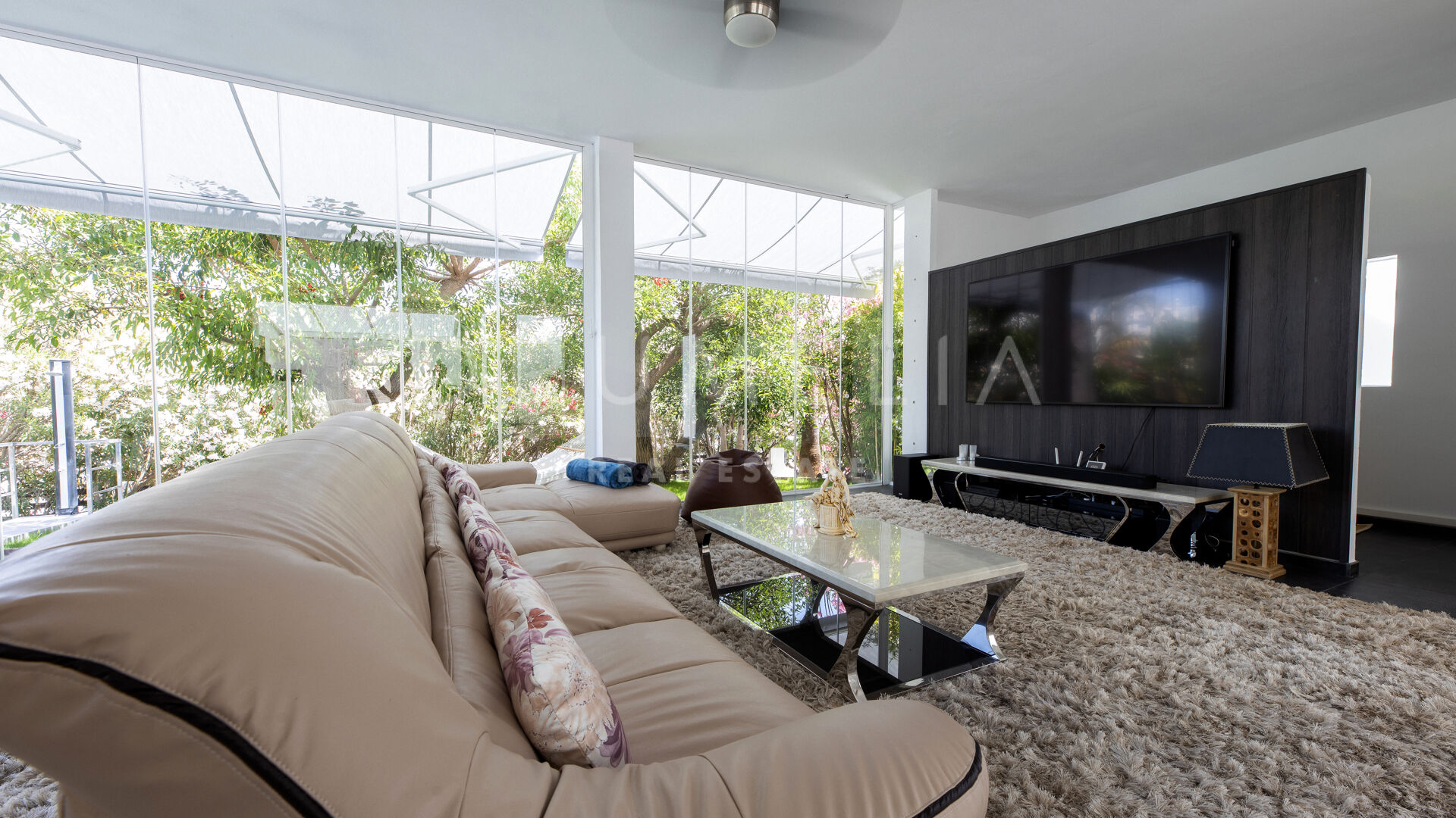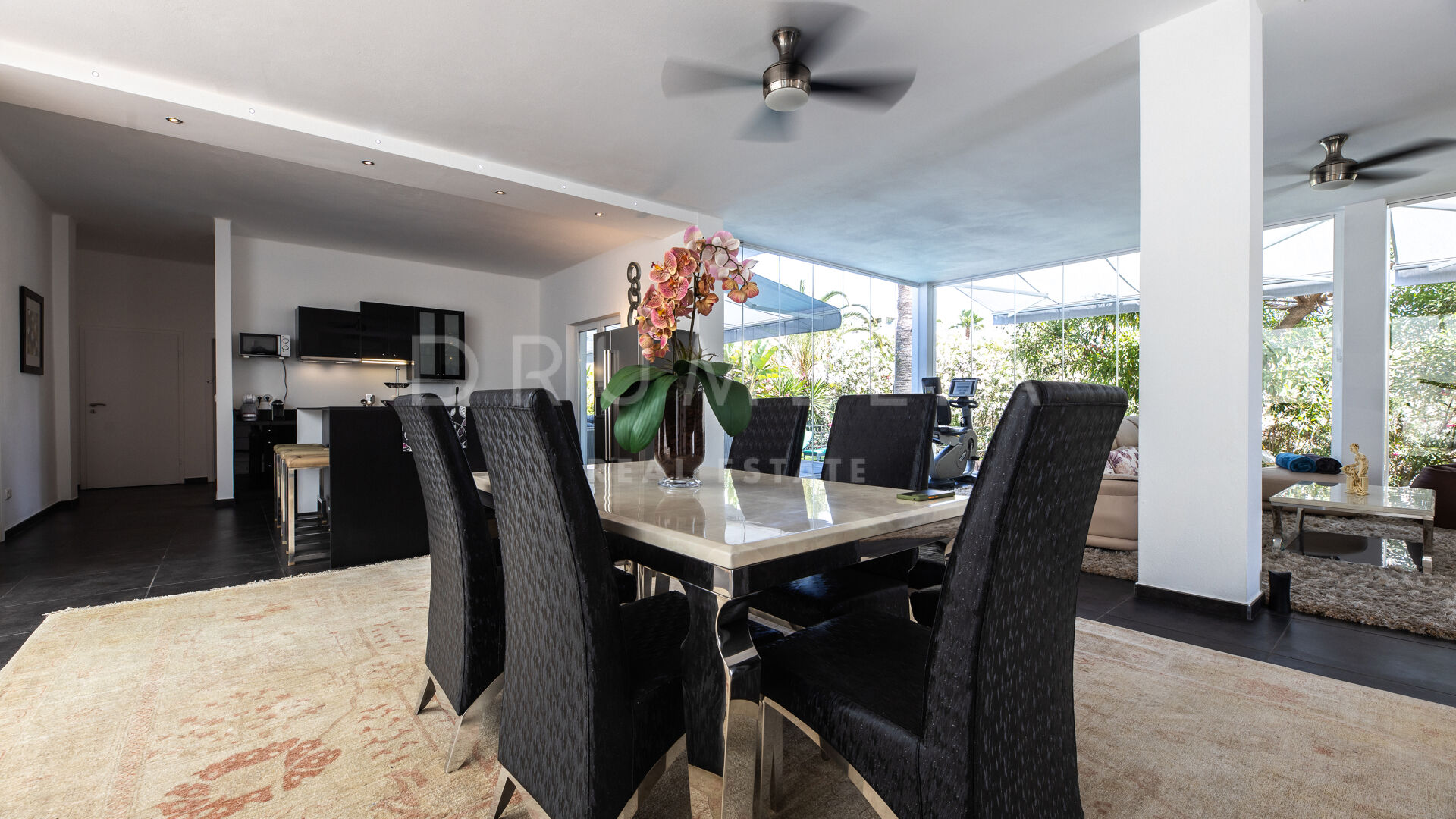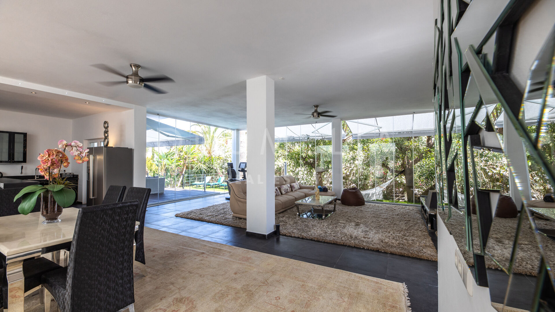 Het fabelachtige huis opent naar een grote en uitnodigende open woon-, eet- en keukenruimte die naar patio’s aan weerszijden van het terrein leidt. Het buitenleven is erg belangrijk voor de Mediterrane levensstijl en deze villa werd ontworpen met dat in gedachten. Je kunt er genieten van de stralende zonnige dagen aan de Costa del Sol bij het zwembad of ontspannen in de schaduw van de bomen, schommelend in een hangmat. De tuinen zijn schitterend en je wordt er omringd door bloeiende bloemen en volwassen bomen. Op de benedenverdieping heb je een complete professionele buitenkeuken die geschikt is voor grote evenementen. Op de bovenverdieping kun je op een enorm terras genieten van het serene uitzicht, de volle dagzon en het beste klimaat van het Europese vasteland. Het dakterras nodigt uit tot ontspannen met een cocktail in een jacuzzi terwijl je het indrukwekkende uitzicht op La Concha en de Middellandse Zee bewondert.