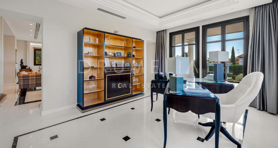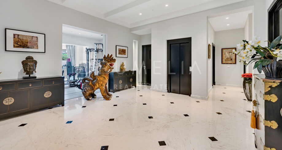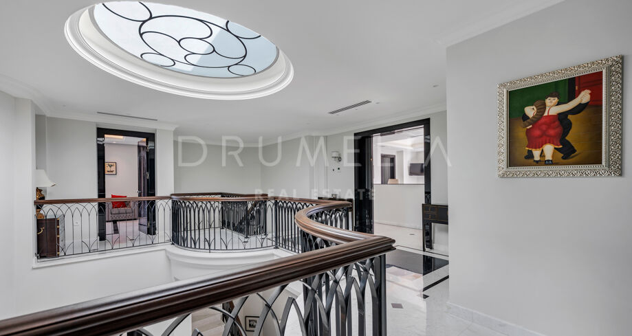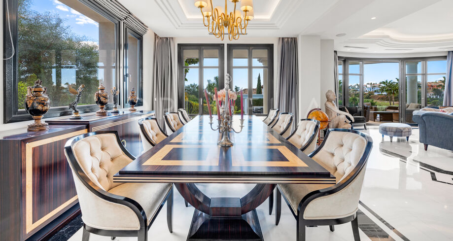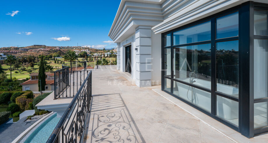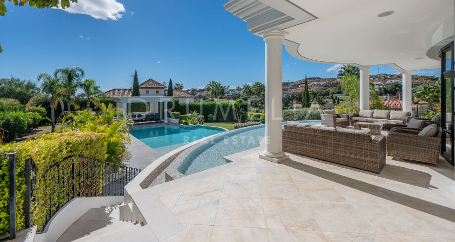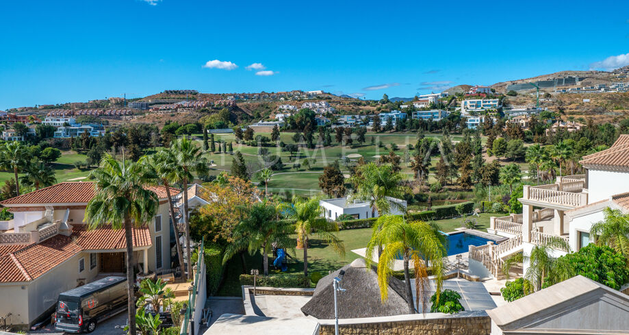 Deze villa met drie verdiepingen combineert klassieke architectuur met elegante, eigentijdse interieurs en een verhoogde ligging met uitzicht op golfbanen, de vallei, de bergen en de Middellandse Zee. De woning is gelegen in een gevestigde woonwijk en biedt open uitzichten over de omgeving.