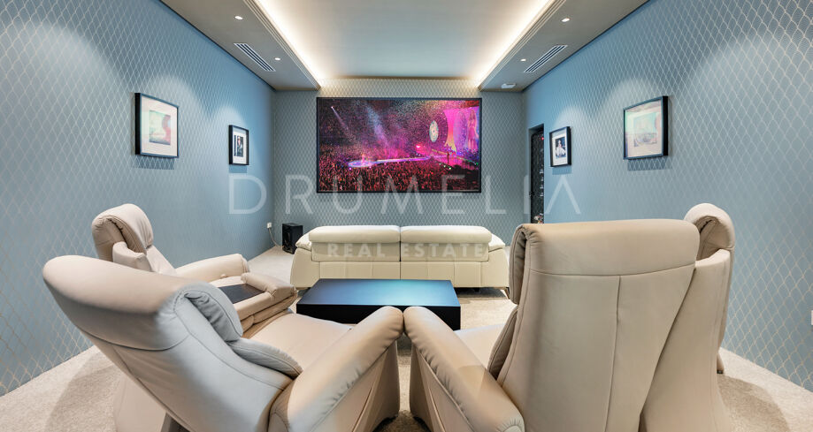 Het buitenleven concentreert zich rond het hoofdterras, waar een infinity-stijl zwembad op het bovenste niveau overloopt in een groter lager gelegen zwembad, waardoor een visuele verbinding ontstaat met de aangelegde tuinen. De bovenverdieping is ingericht met de hoofdslaapkamer met privéterras, inloopkast en open zeezicht, evenals twee extra slaapkamers met en-suite badkamers. De benedenverdieping omvat een privébioscoop, fitnessruimte, spa met sauna en Turks bad, wijnkelder, entertainmentruimte, serviceappartement en opslagruimtes.