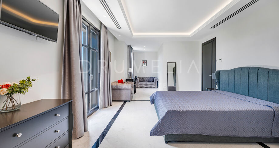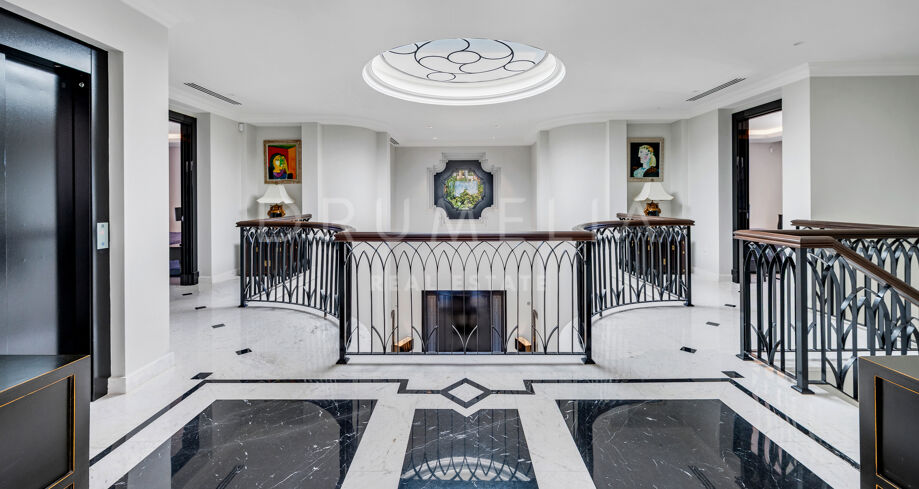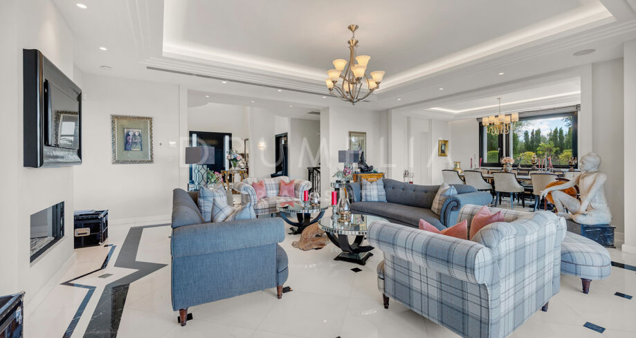 Een statige entree leidt naar een dubbelhoge hal met marmeren vloeren, decoratieve inleg en een gebogen trap met een daklicht. De belangrijkste woon- en eetruimtes volgen een halfronde indeling en staan via grote glazen deuren in directe verbinding met het terras. De formele eetkamer biedt een verfijnde setting, terwijl de keuken een meer informele gezinsruimte vormt met een centraal eiland, ontbijthoek en aangrenzende tv-lounge, allen met toegang tot de buitenruimtes.