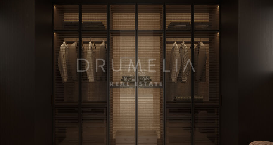 Het appartement is afgewerkt met hoogwaardige materialen en moderne lijnen, en beschikt over twee slaapkamers met en-suite badkamers, een open woonruimte en kwaliteitsafwerkingen. Bewoners genieten van prachtig aangelegde tuinen, een indrukwekkend gemeenschappelijk zwembad, 24-uurs beveiliging en een verhoogde ligging met panoramisch uitzicht op zee en bergen. De architectuur en indeling weerspiegelen de nieuwste trends in luxe wonen.