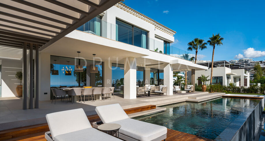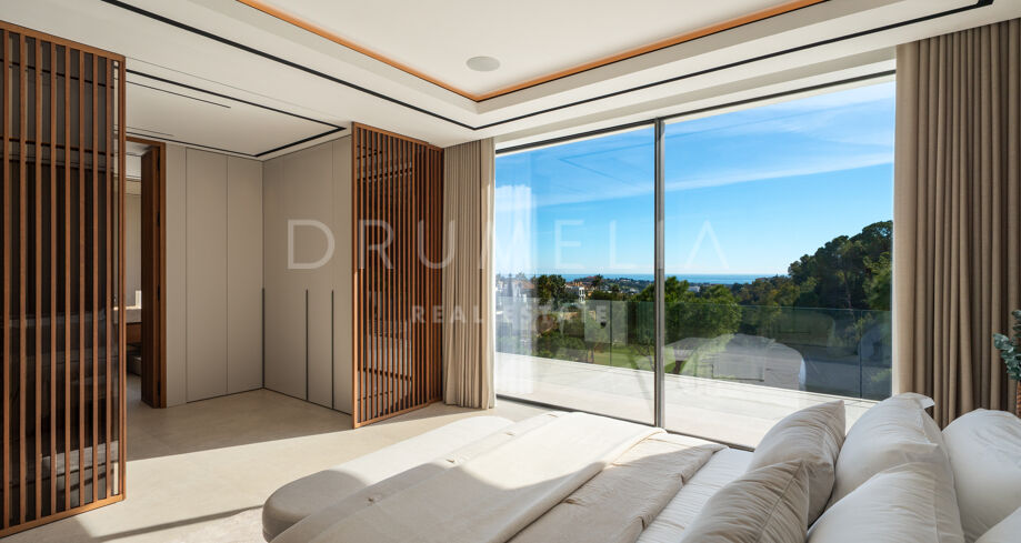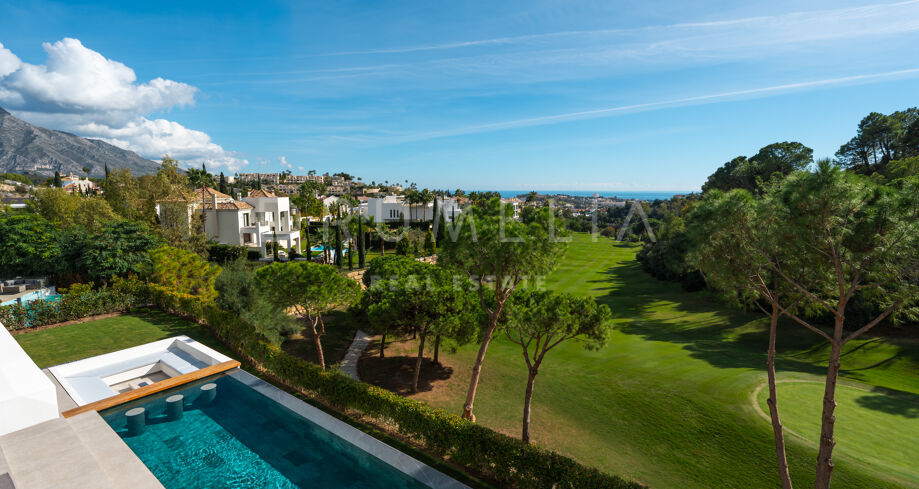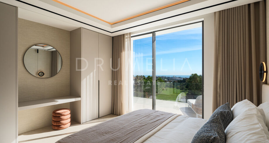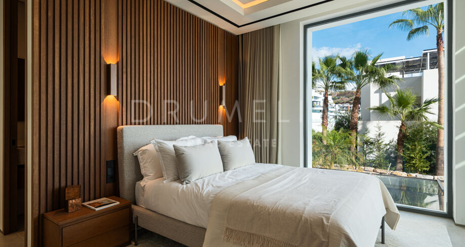 Deze hedendaagse villa op de frontlinie van de golfbaan bevindt zich in een verhoogde en private positie binnen La Quinta, Benahavís. Het architecturale ontwerp wordt gekenmerkt door strakke lijnen, symmetrie en een natuurlijke integratie tussen binnen- en buitenruimtes. De ruime terrassen, het infinity-zwembad en meerdere eet- en loungegedeelten maken het mogelijk optimaal van de omgeving te genieten, terwijl de bovenste terrassen extra privéruimtes bieden die verbonden zijn met de slaapkamers.