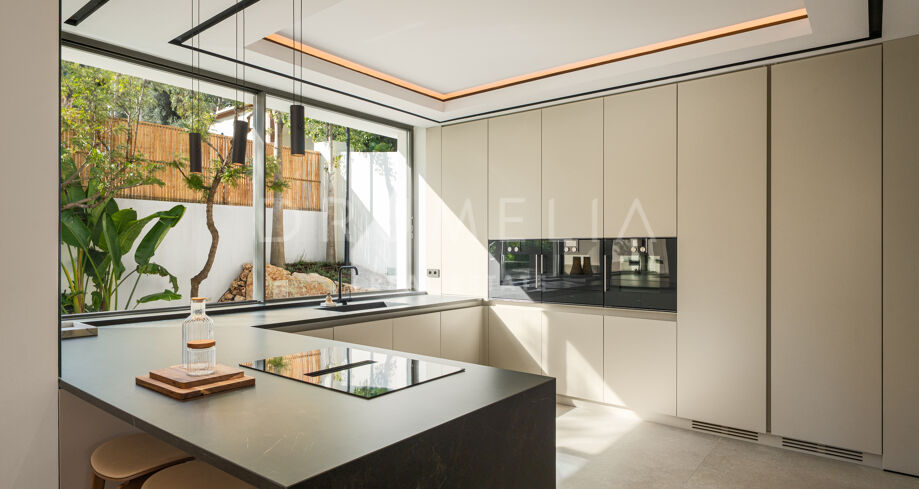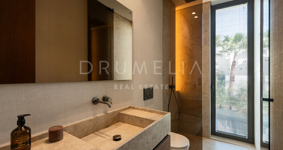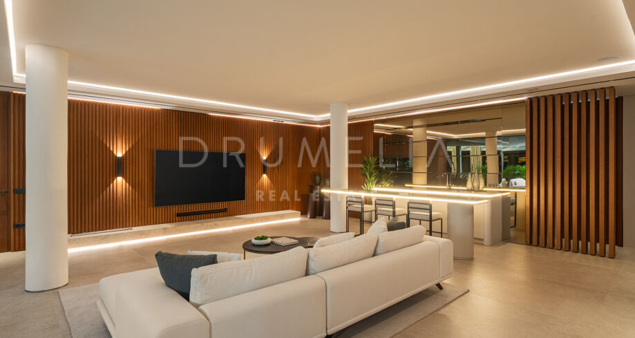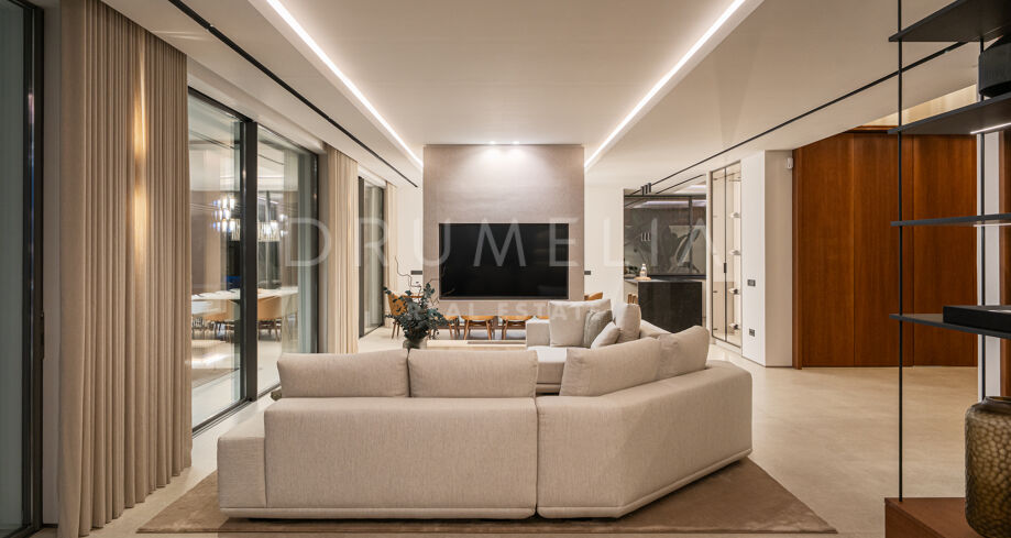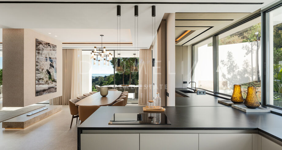 Het interieur behoudt een uniforme esthetiek, gecreëerd door Aalto Exclusive Design, met natuurlijke tinten, hoogwaardige materialen en maatwerkmeubilair. De hoofdwoonkamer is licht en opent volledig naar het terras via schuifpanelen, wat het gevoel van ruimte versterkt. De keuken en eetkamer delen een elegant en functioneel ontwerp, met een open indeling die de interactie met de sociale zones bevordert en het uitzicht maximaliseert.