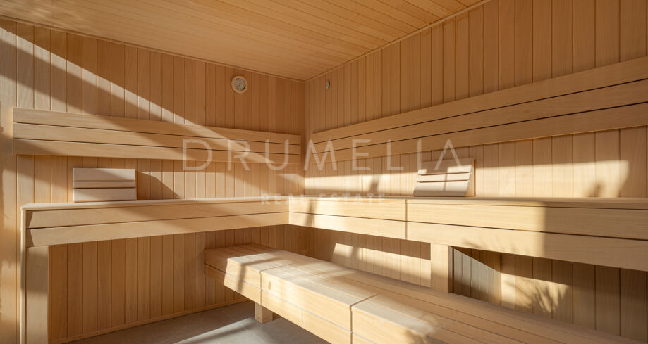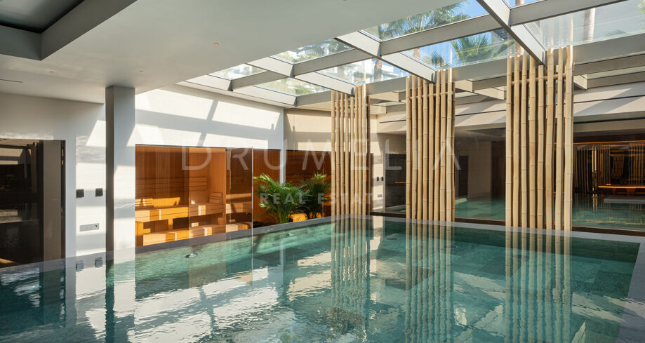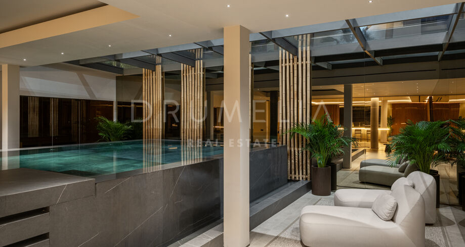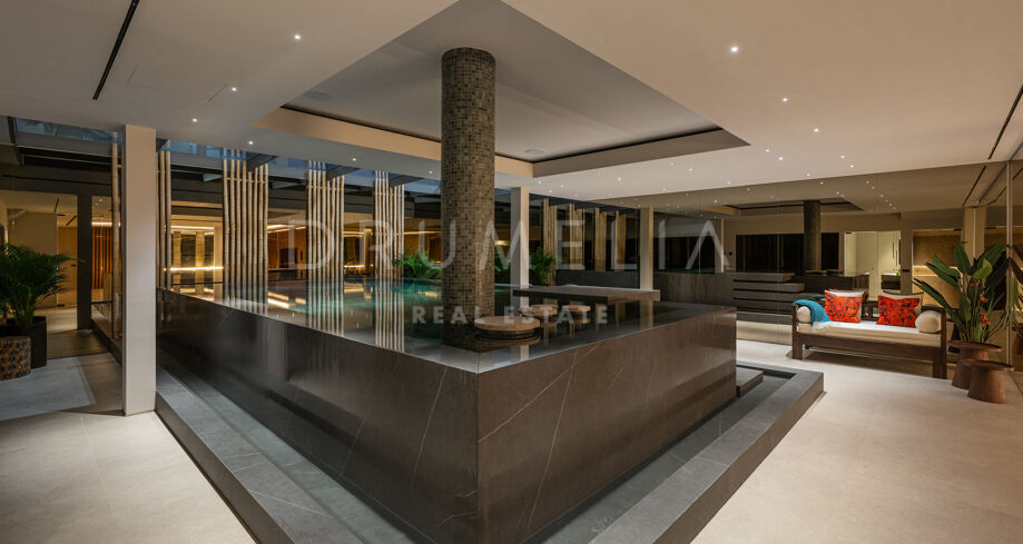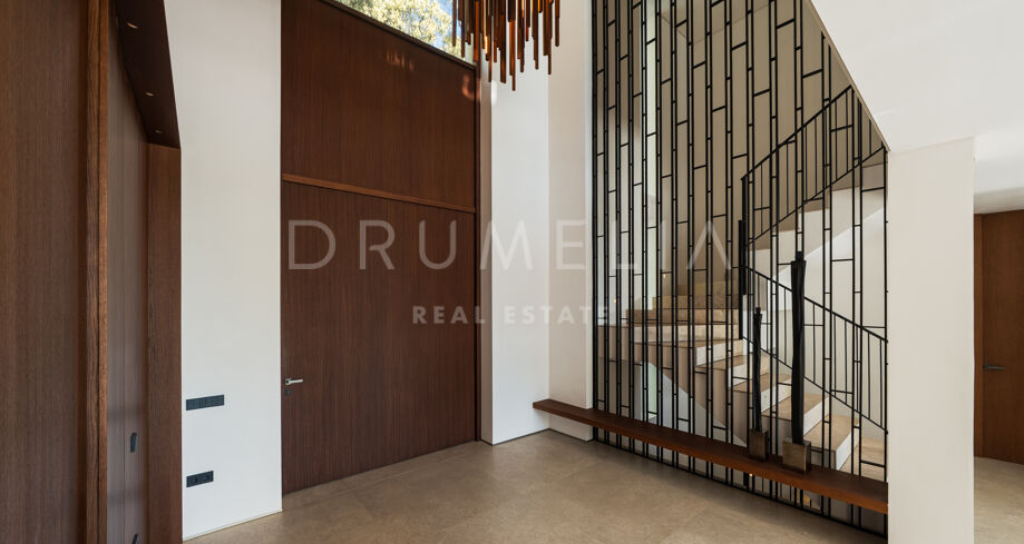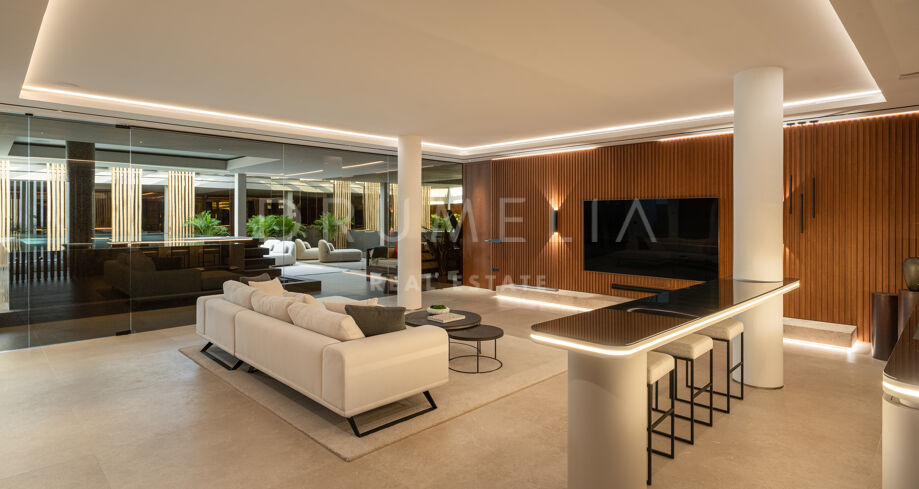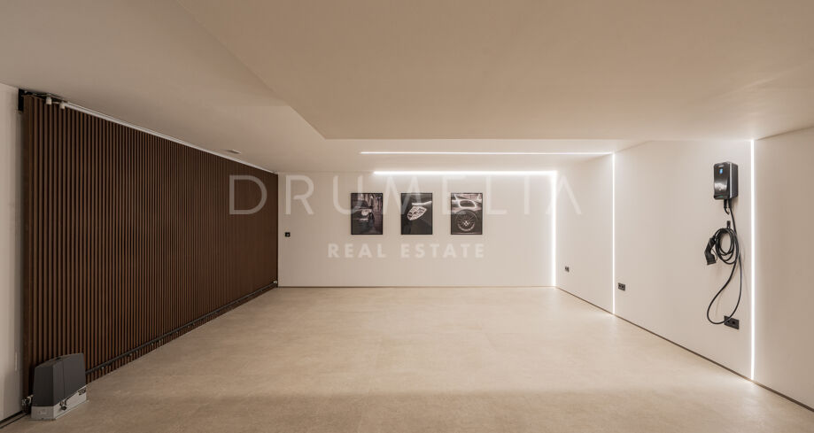 Het lagere niveau is gewijd aan welzijn en ontspanning, met een op maat gemaakte entertainmentruimte met een volledige bar, een spa met binnenzwembad en sauna, en een privéfitnessruimte. Een beveiligde garage met laadpunt voor elektrische voertuigen maakt de voorzieningen compleet. De combinatie van architectonische precisie, hoogwaardige interieurs en een bevoorrechte ligging aan de golfbaan maakt deze woning tot een van de meest complete opties in de omgeving.