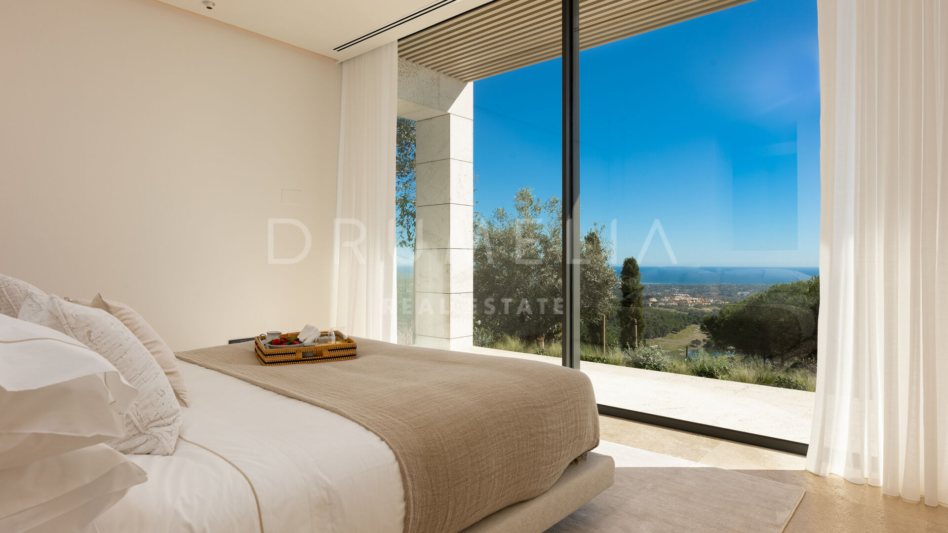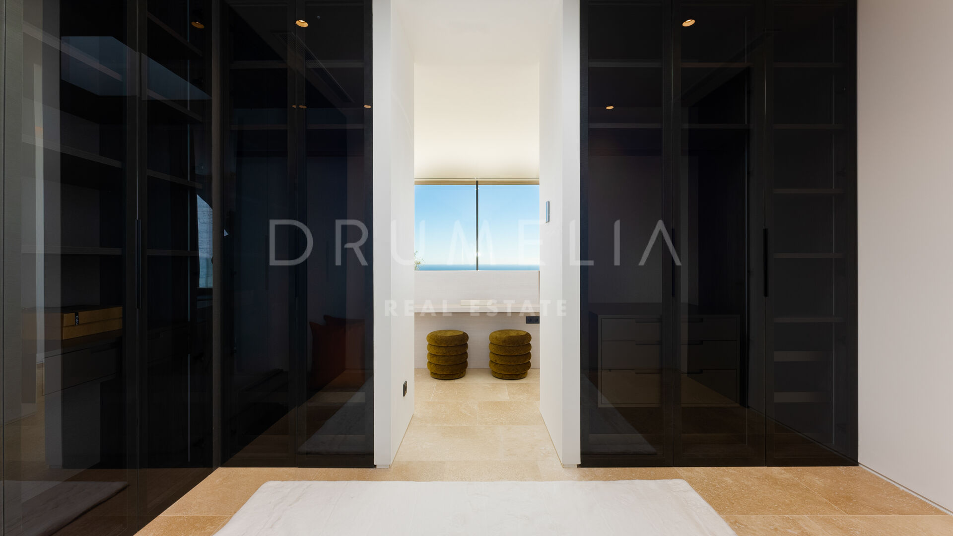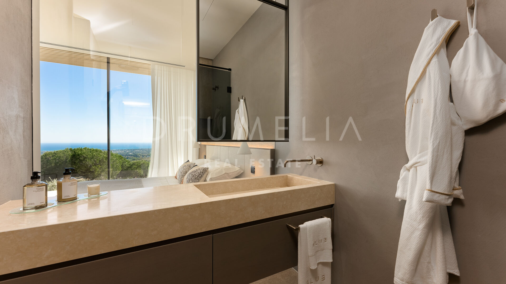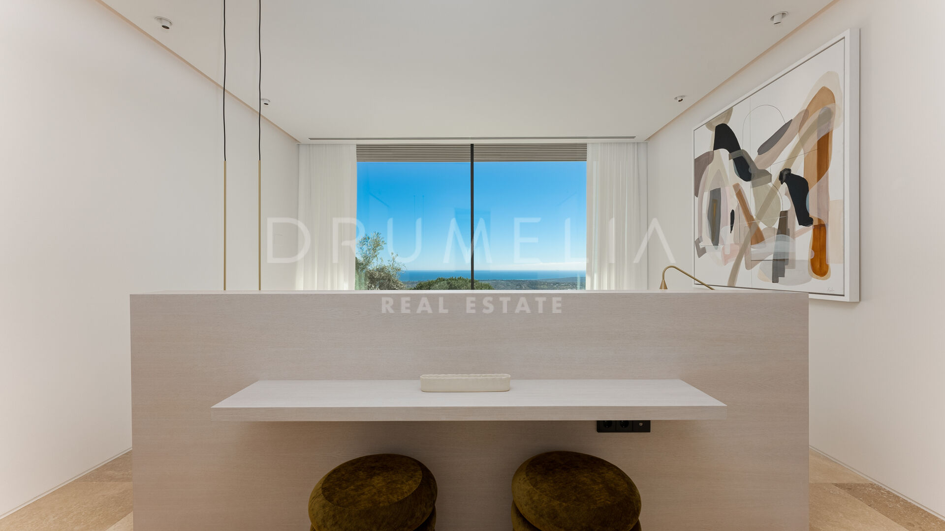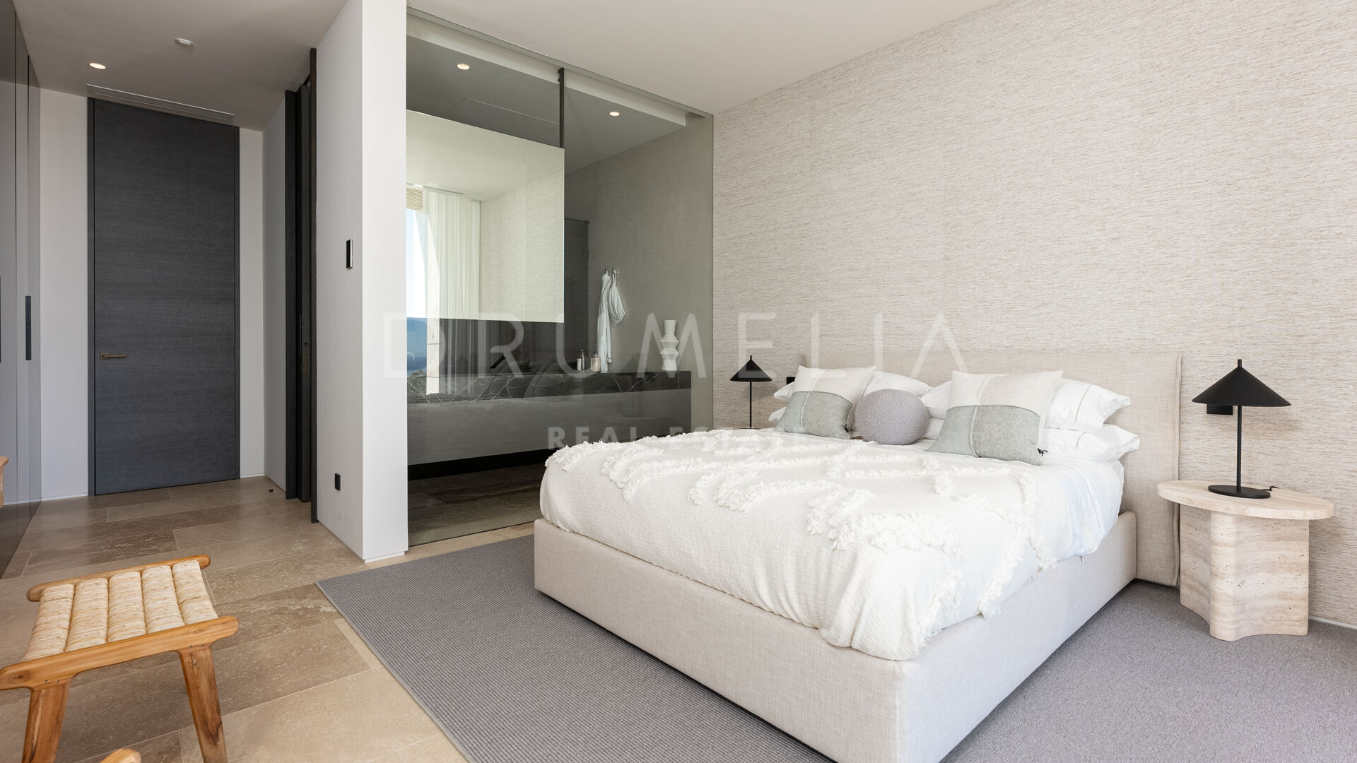 De villa heeft 5 slaapkamersuites, 7 badkamers en 2 toiletten, en 3 uitgestrekte terrassen van 495 m² met panoramisch uitzicht. Op de hoofdverdieping geeft de ruime en lichte woonkamer naadloos toegang tot het terras door de van vloer tot plafond geautomatiseerde panoramische ramen, en verder tot het 44 m² grote zwembad. De open keuken is volledig uitgerust met Gaggenau apparatuur en afgewerkt met een luxueus natuurstenen eiland. Op dit niveau logeren 3 Gastensuites, alle met directe toegang tot privé terrassen, en de indrukwekkende Hoofdsuite met een kleedkamer en een grijs geschuurde travertijnen badkamer met uitzicht op de privé patiotuin.