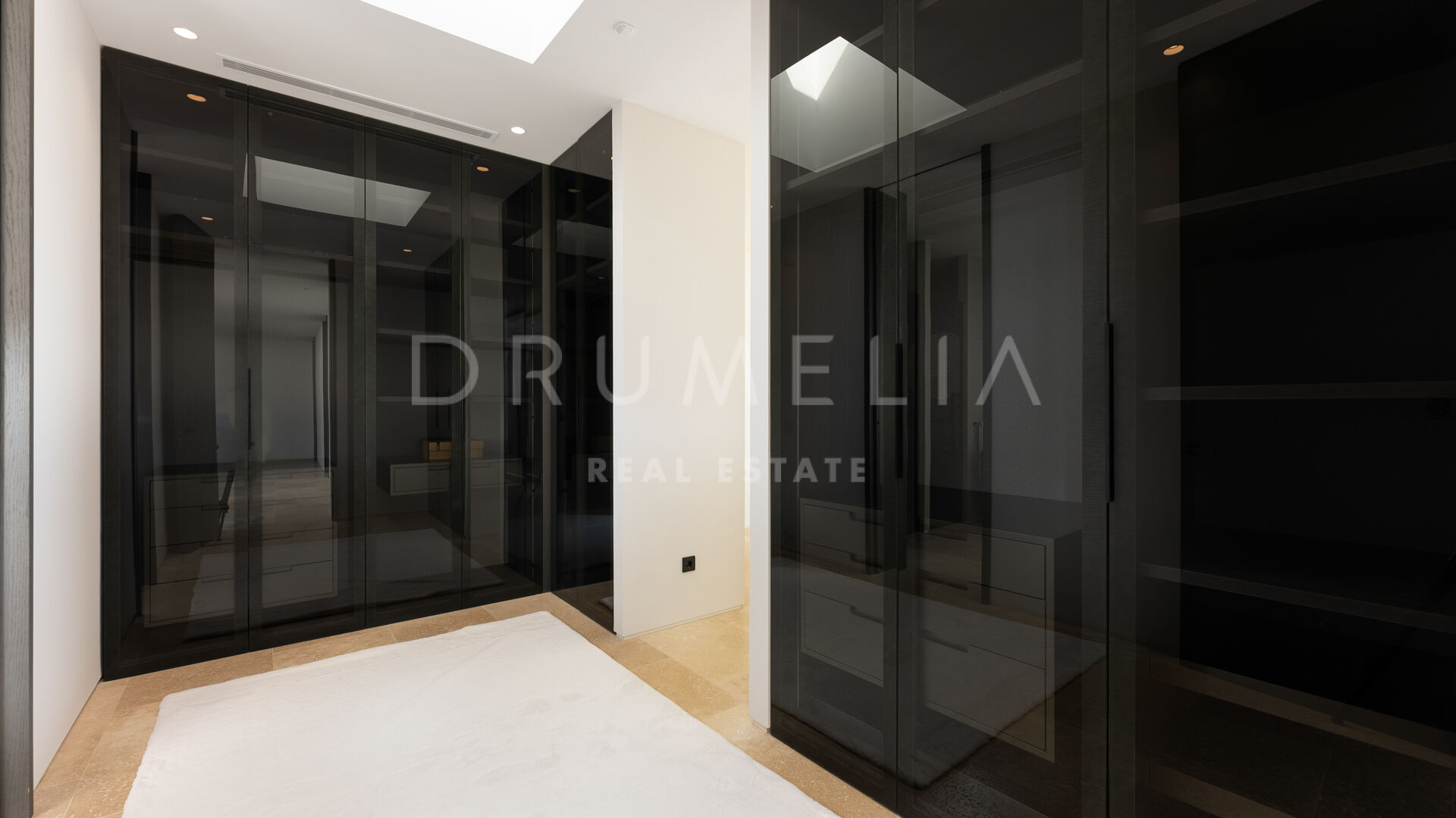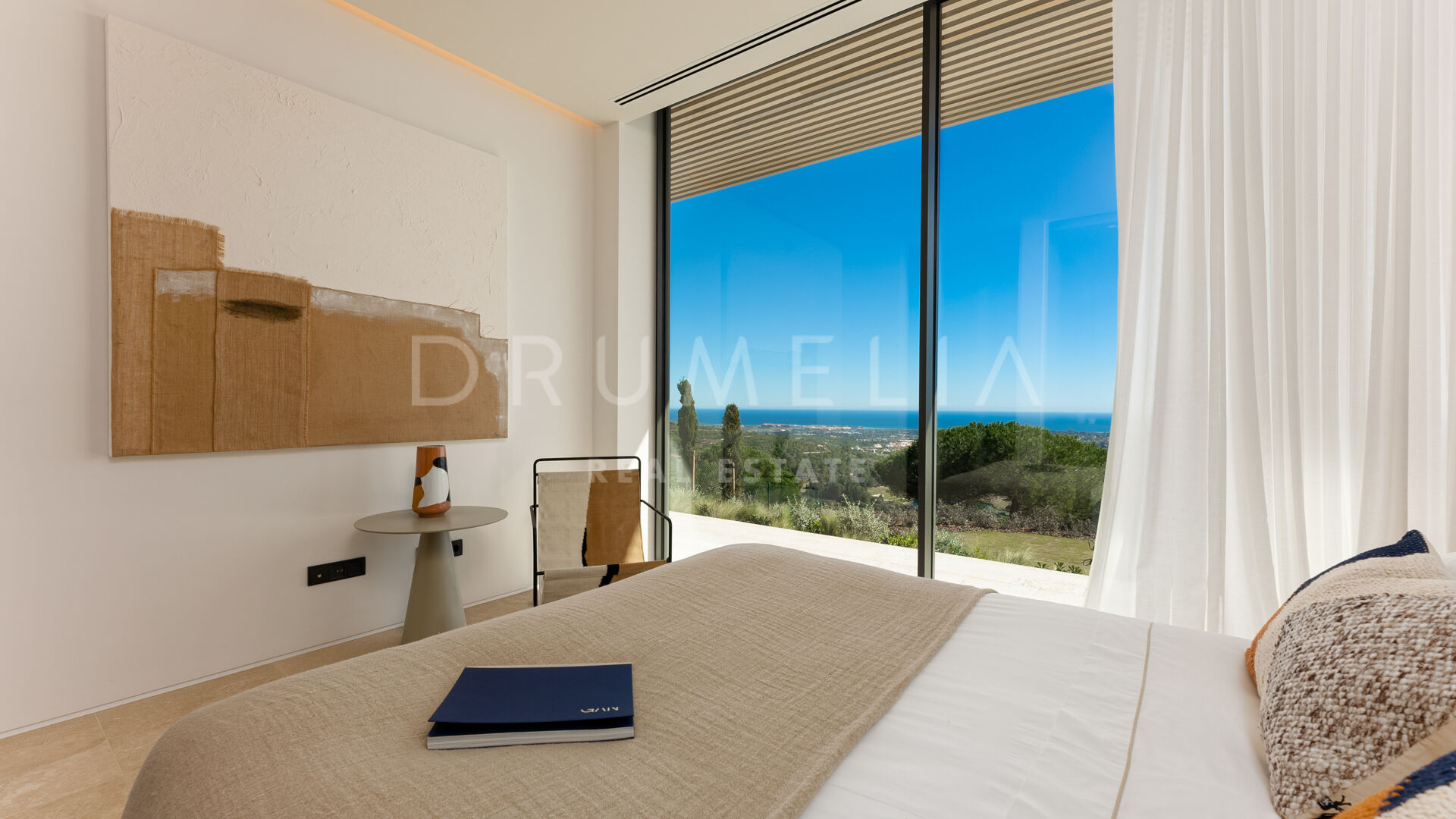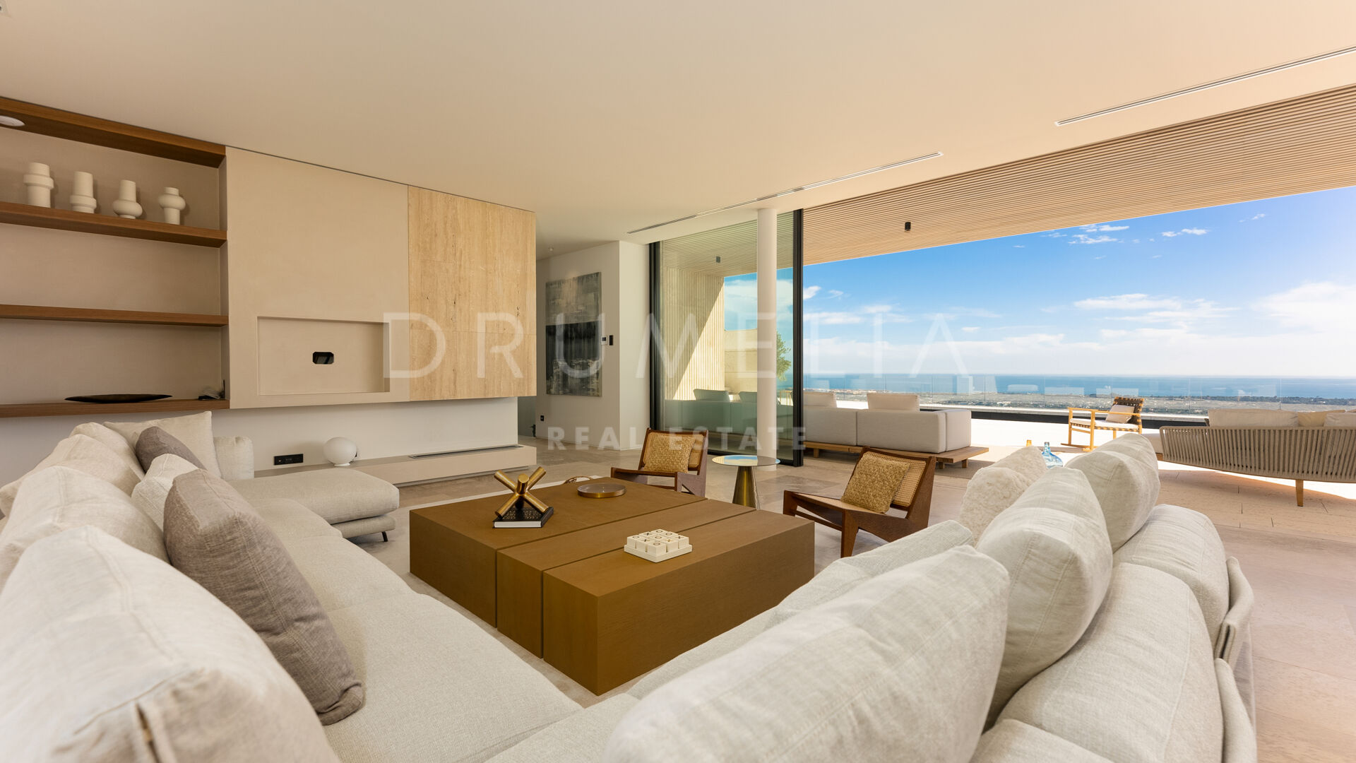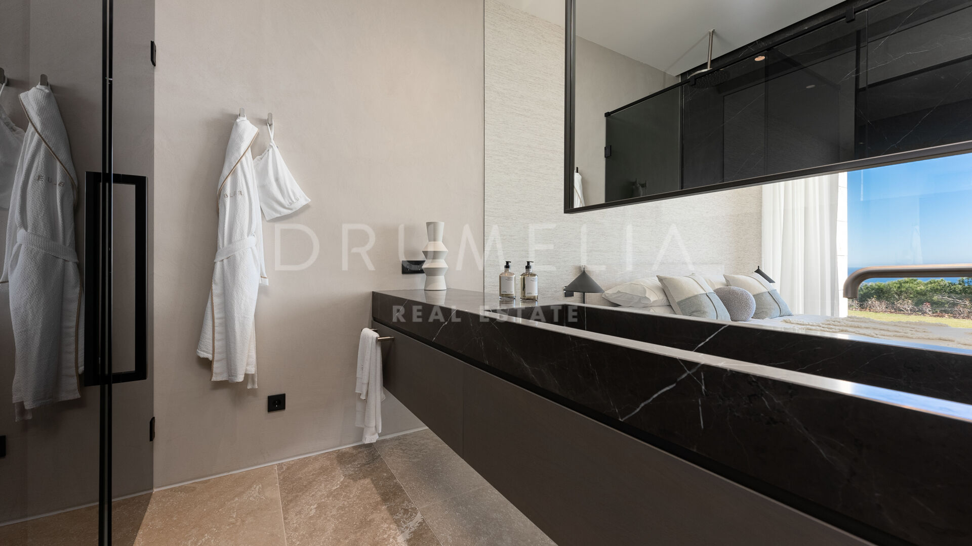 De villa heeft 5 slaapkamersuites, 7 badkamers en 2 toiletten, en 3 uitgestrekte terrassen van 495 m² met panoramisch uitzicht. Op de hoofdverdieping geeft de ruime en lichte woonkamer naadloos toegang tot het terras door de van vloer tot plafond geautomatiseerde panoramische ramen, en verder tot het 44 m² grote zwembad. De open keuken is volledig uitgerust met Gaggenau apparatuur en afgewerkt met een luxueus natuurstenen eiland. Op dit niveau logeren 3 Gastensuites, alle met directe toegang tot privé terrassen, en de indrukwekkende Hoofdsuite met een kleedkamer en een grijs geschuurde travertijnen badkamer met uitzicht op de privé patiotuin.