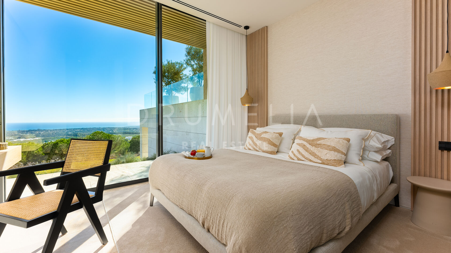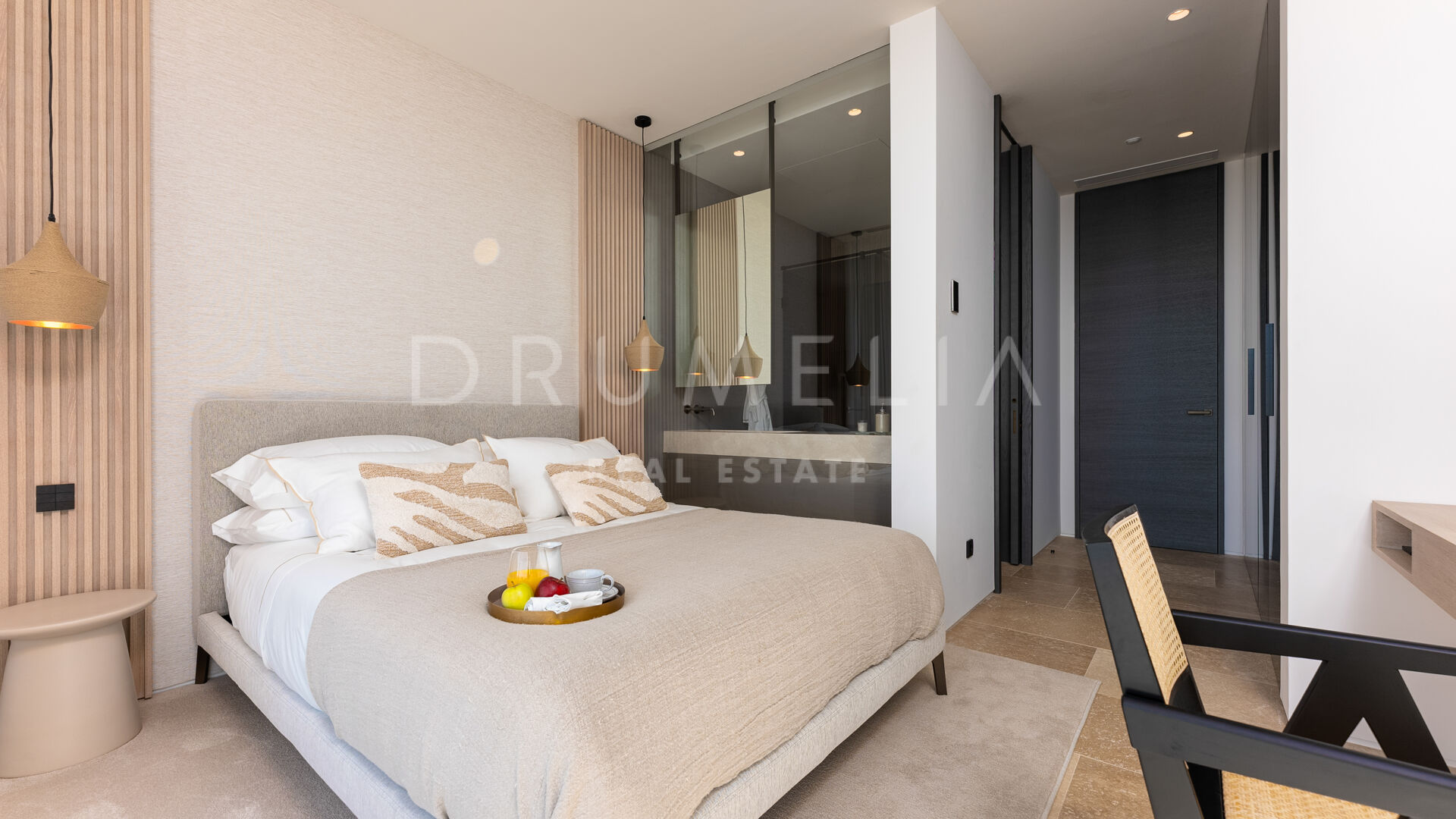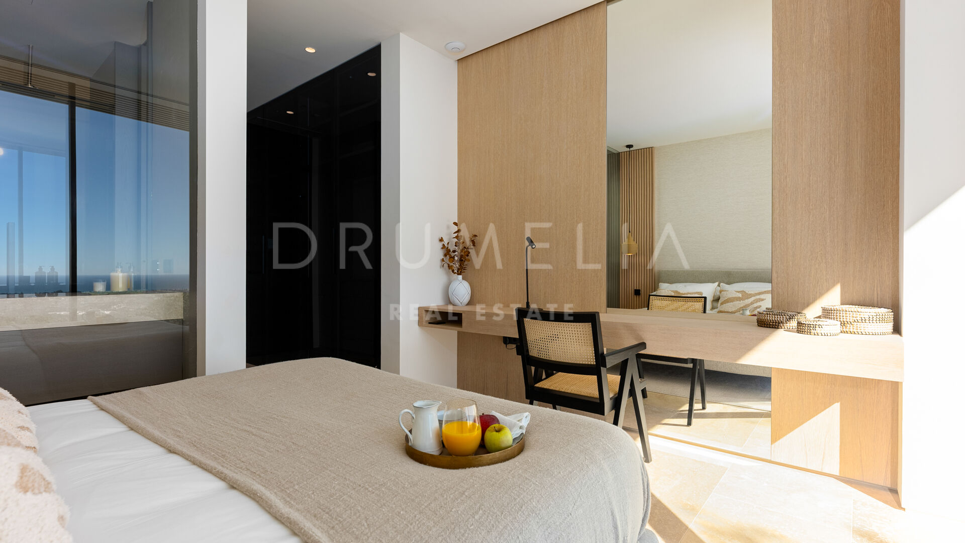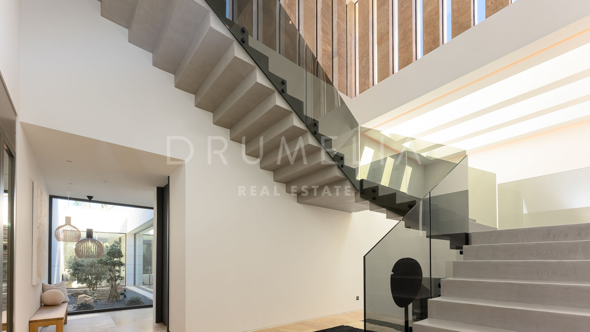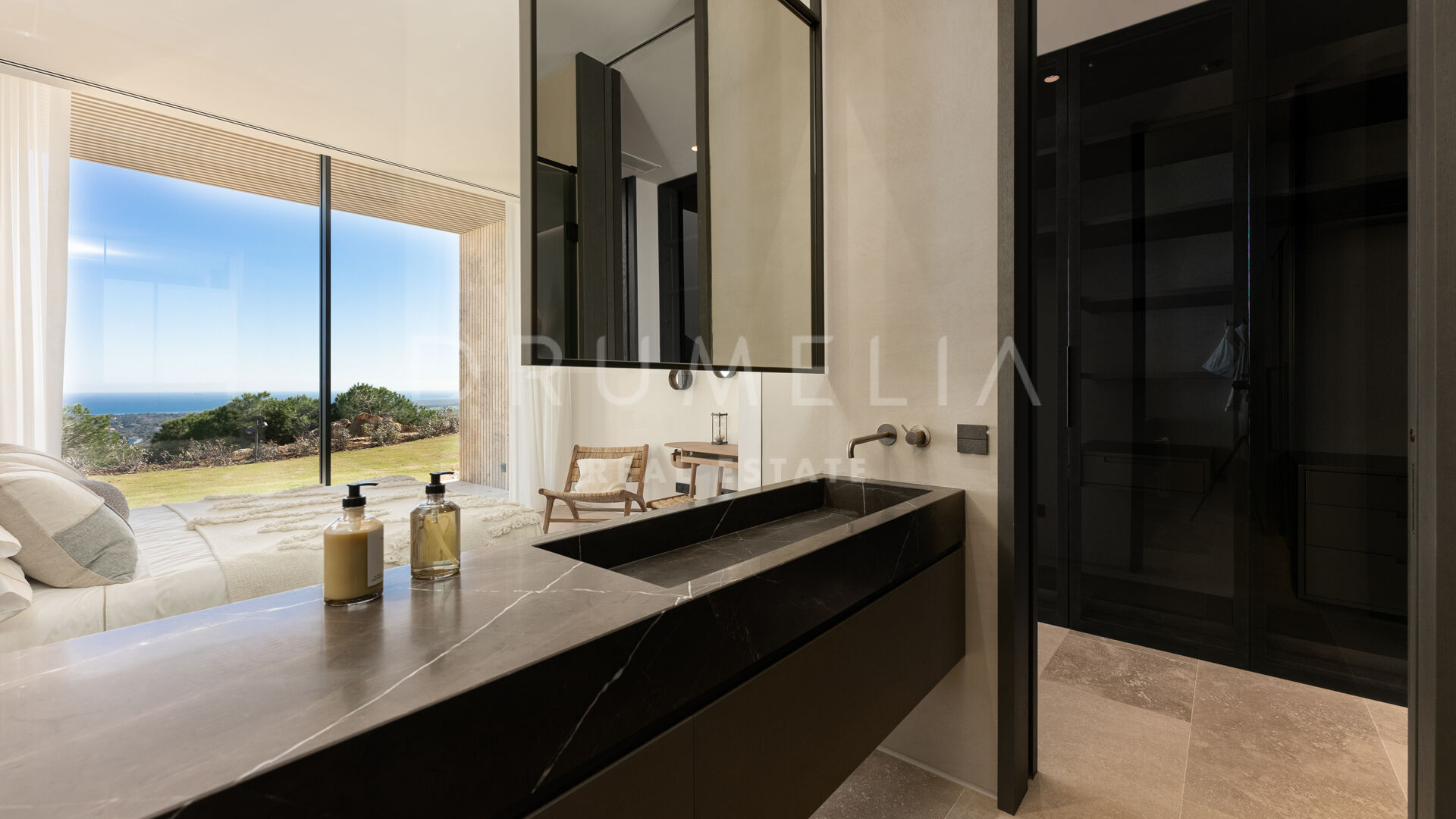 De villa heeft 5 slaapkamersuites, 7 badkamers en 2 toiletten, en 3 uitgestrekte terrassen van 495 m² met panoramisch uitzicht. Op de hoofdverdieping geeft de ruime en lichte woonkamer naadloos toegang tot het terras door de van vloer tot plafond geautomatiseerde panoramische ramen, en verder tot het 44 m² grote zwembad. De open keuken is volledig uitgerust met Gaggenau apparatuur en afgewerkt met een luxueus natuurstenen eiland. Op dit niveau logeren 3 Gastensuites, alle met directe toegang tot privé terrassen, en de indrukwekkende Hoofdsuite met een kleedkamer en een grijs geschuurde travertijnen badkamer met uitzicht op de privé patiotuin.