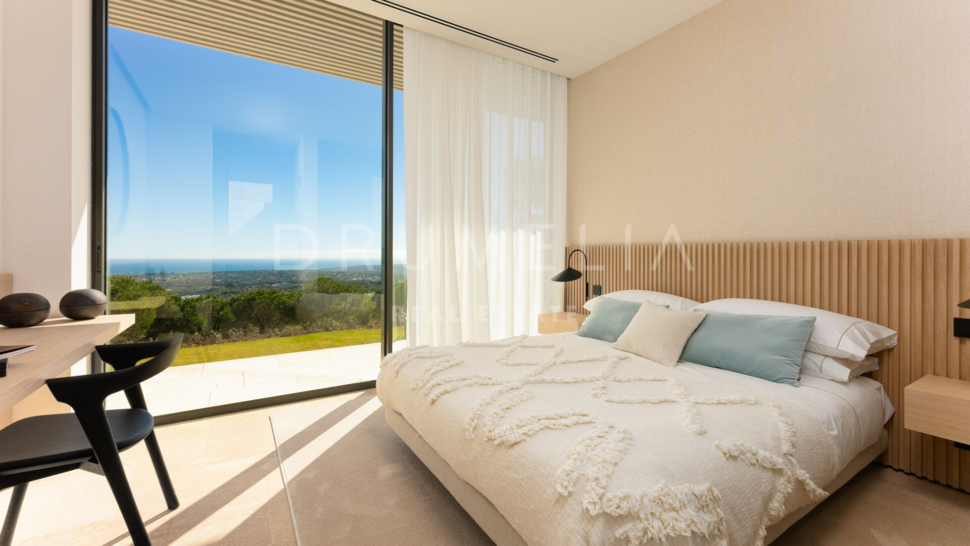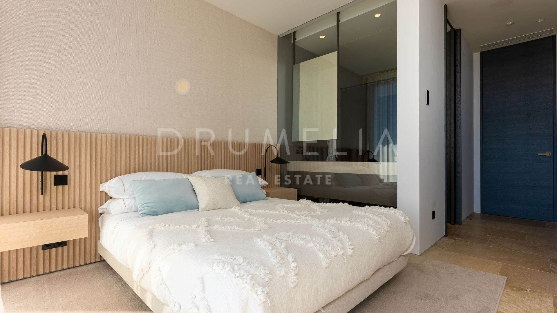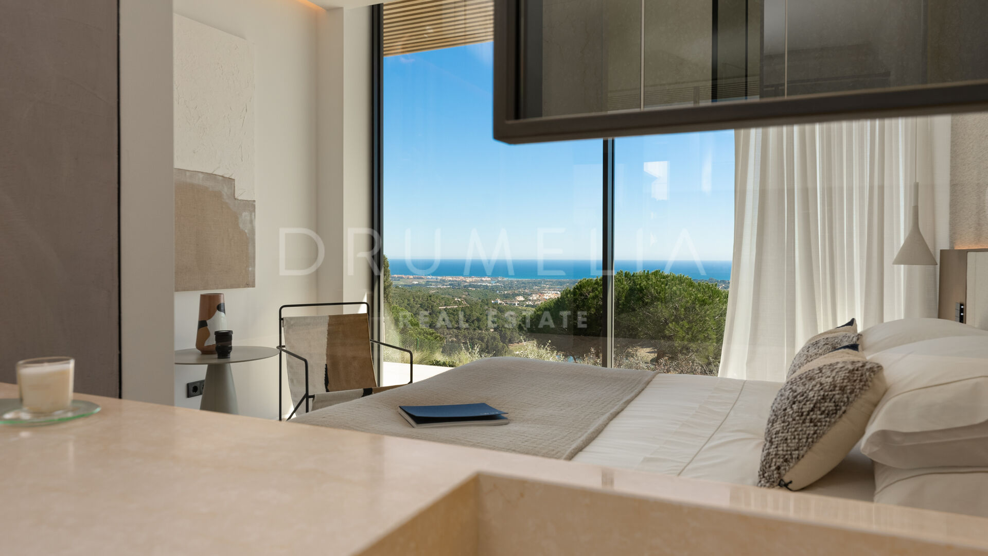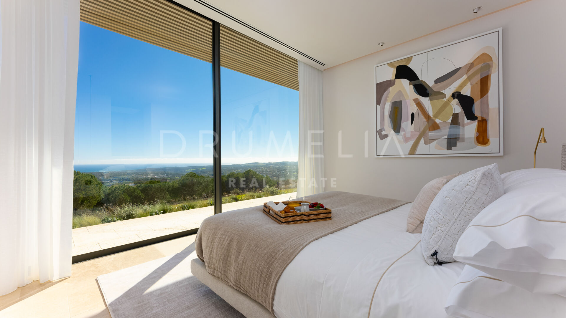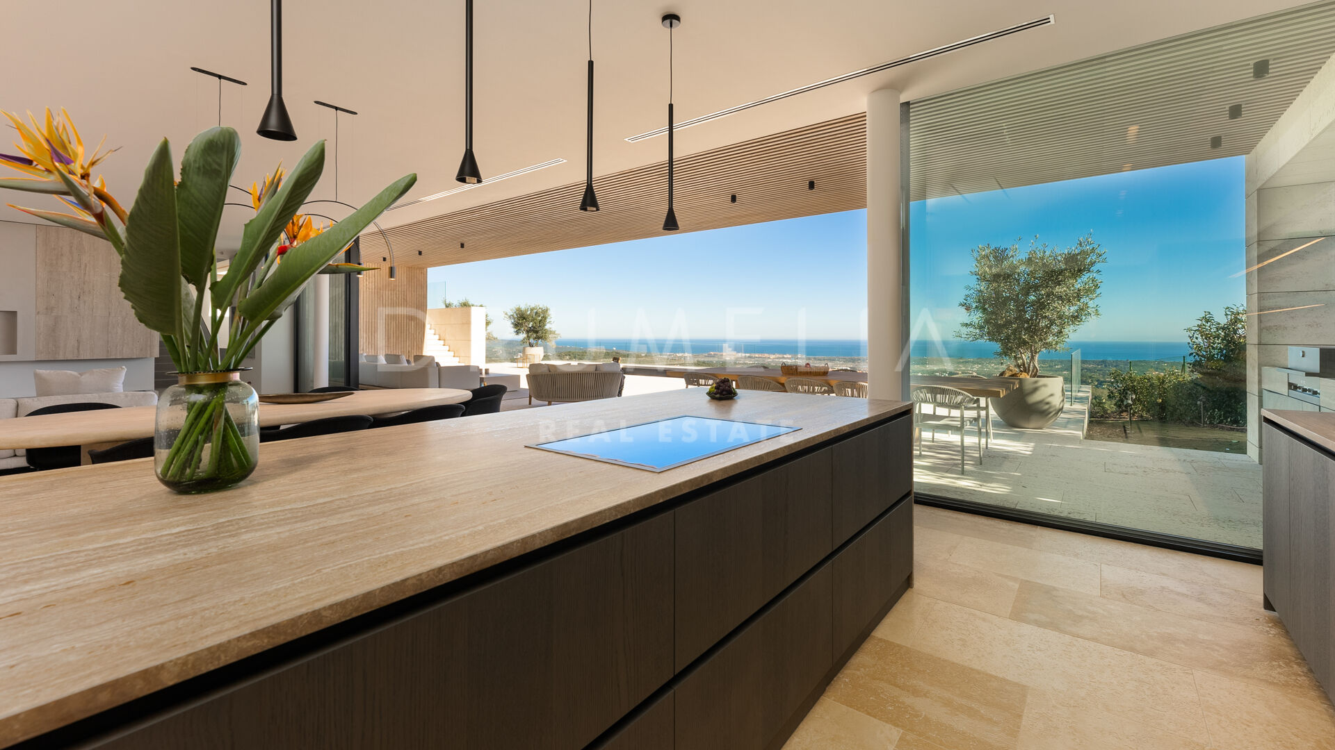 De villa heeft 5 slaapkamersuites, 7 badkamers en 2 toiletten, en 3 uitgestrekte terrassen van 495 m² met panoramisch uitzicht. Op de hoofdverdieping geeft de ruime en lichte woonkamer naadloos toegang tot het terras door de van vloer tot plafond geautomatiseerde panoramische ramen, en verder tot het 44 m² grote zwembad. De open keuken is volledig uitgerust met Gaggenau apparatuur en afgewerkt met een luxueus natuurstenen eiland. Op dit niveau logeren 3 Gastensuites, alle met directe toegang tot privé terrassen, en de indrukwekkende Hoofdsuite met een kleedkamer en een grijs geschuurde travertijnen badkamer met uitzicht op de privé patiotuin.