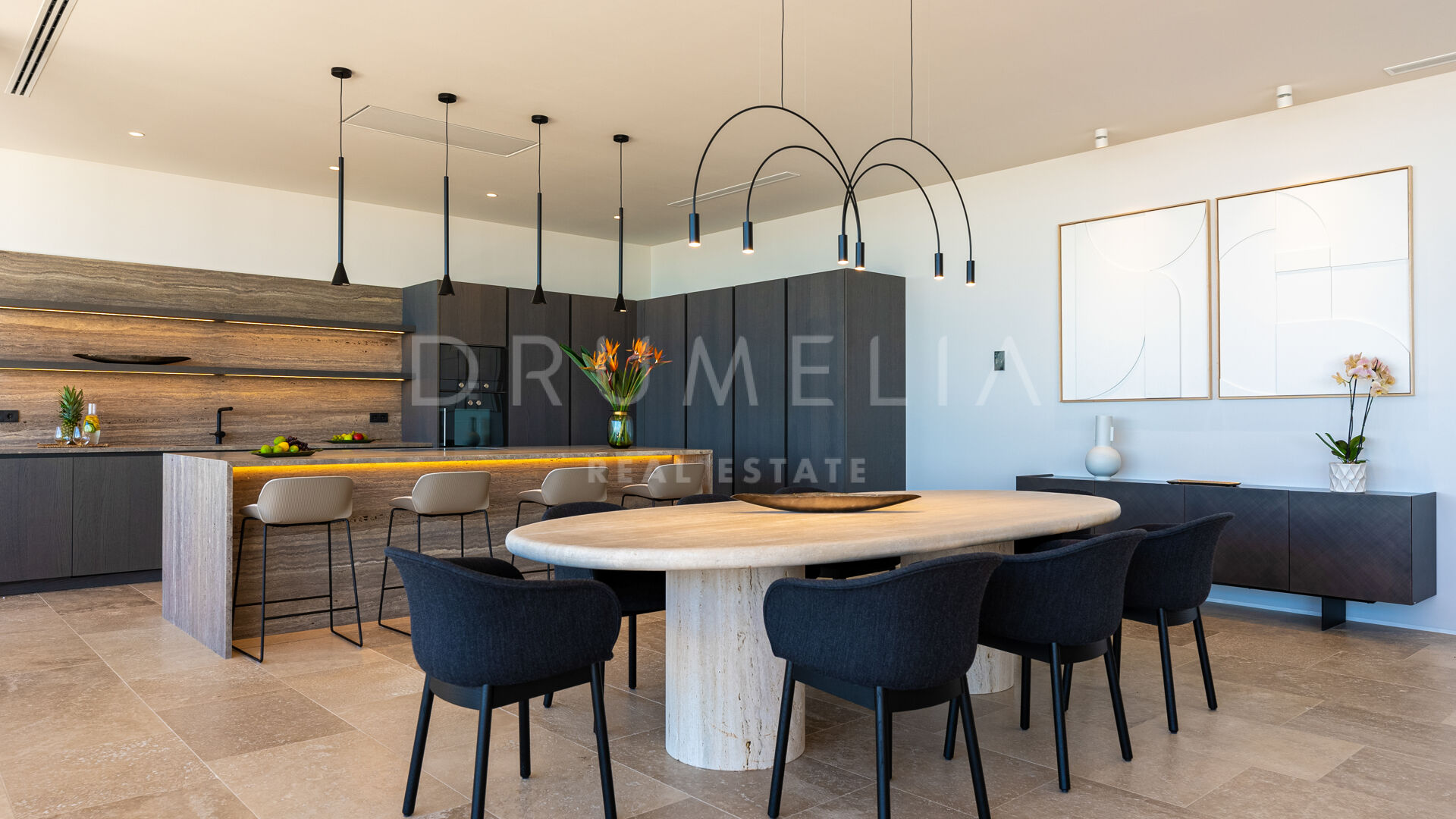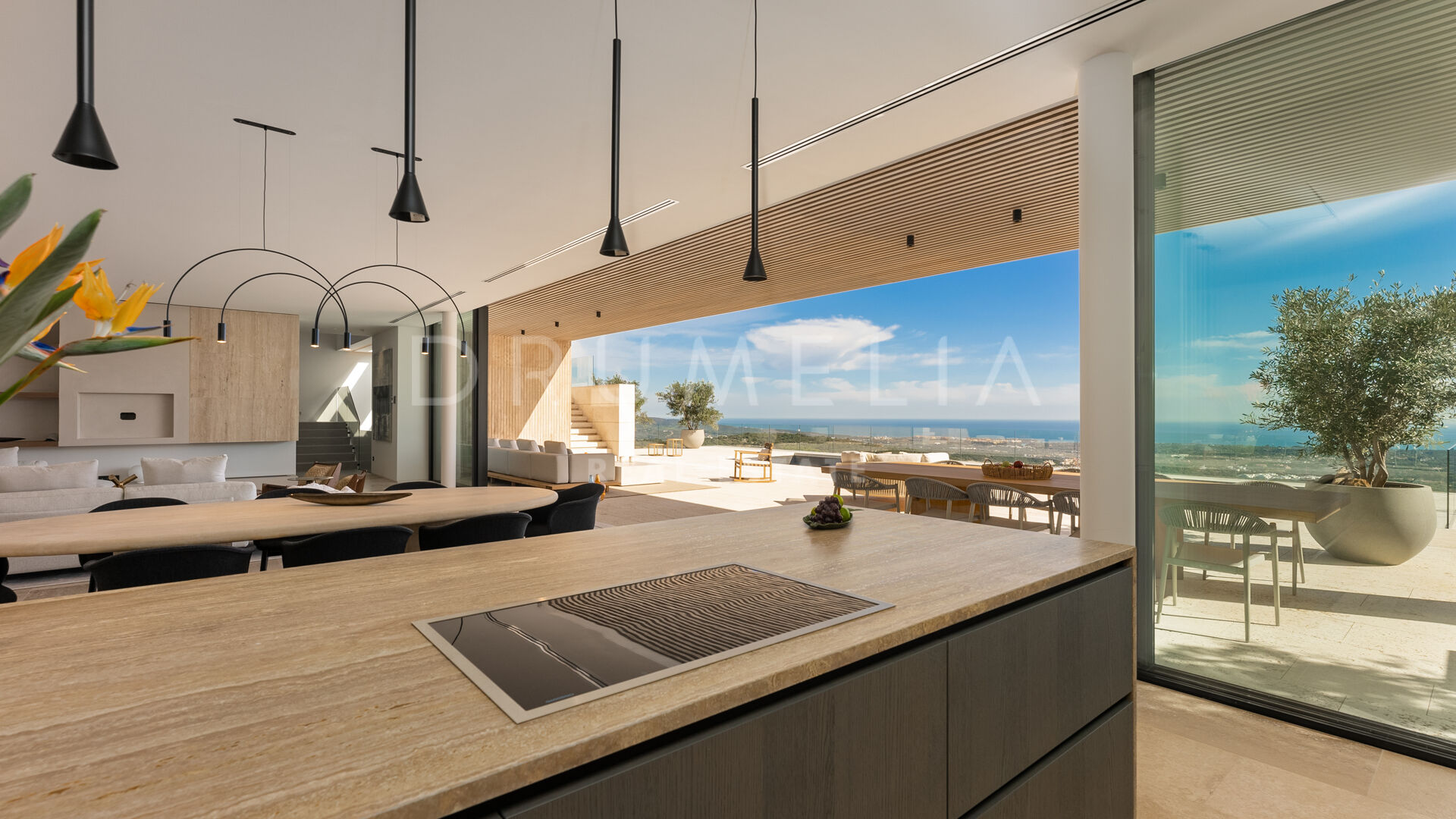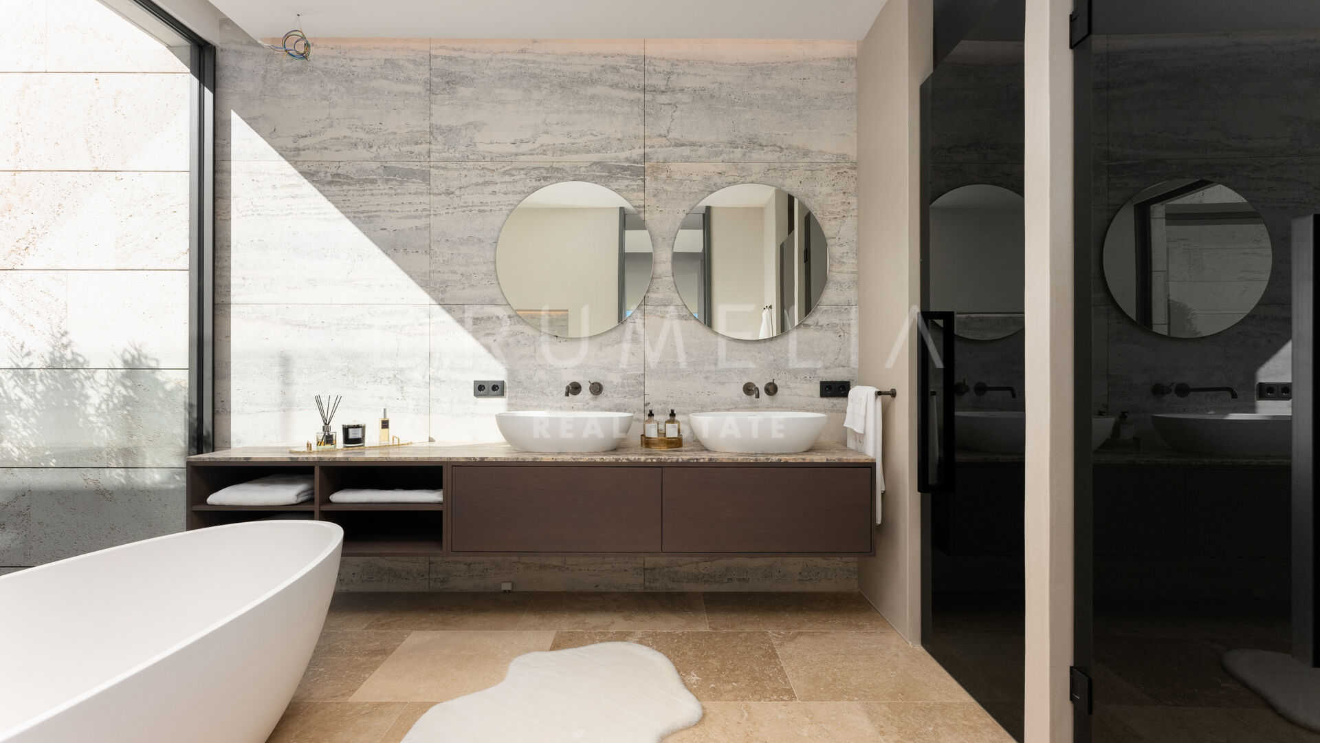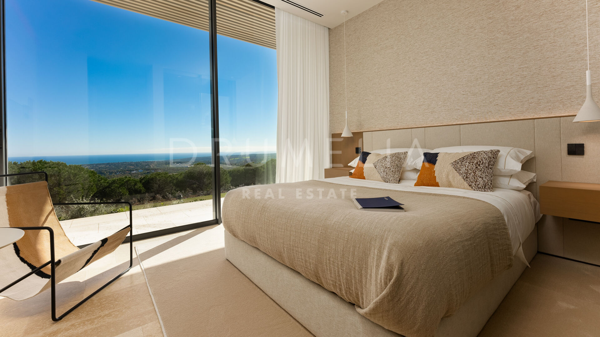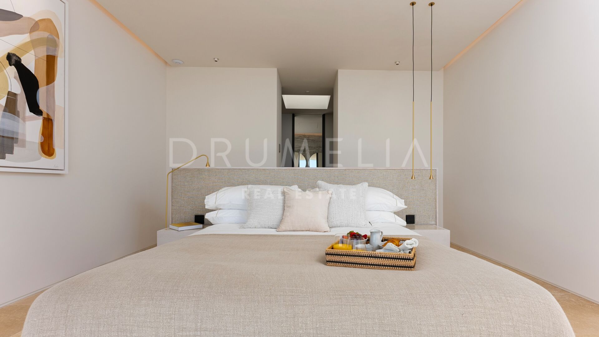 De villa heeft 5 slaapkamersuites, 7 badkamers en 2 toiletten, en 3 uitgestrekte terrassen van 495 m² met panoramisch uitzicht. Op de hoofdverdieping geeft de ruime en lichte woonkamer naadloos toegang tot het terras door de van vloer tot plafond geautomatiseerde panoramische ramen, en verder tot het 44 m² grote zwembad. De open keuken is volledig uitgerust met Gaggenau apparatuur en afgewerkt met een luxueus natuurstenen eiland. Op dit niveau logeren 3 Gastensuites, alle met directe toegang tot privé terrassen, en de indrukwekkende Hoofdsuite met een kleedkamer en een grijs geschuurde travertijnen badkamer met uitzicht op de privé patiotuin.
