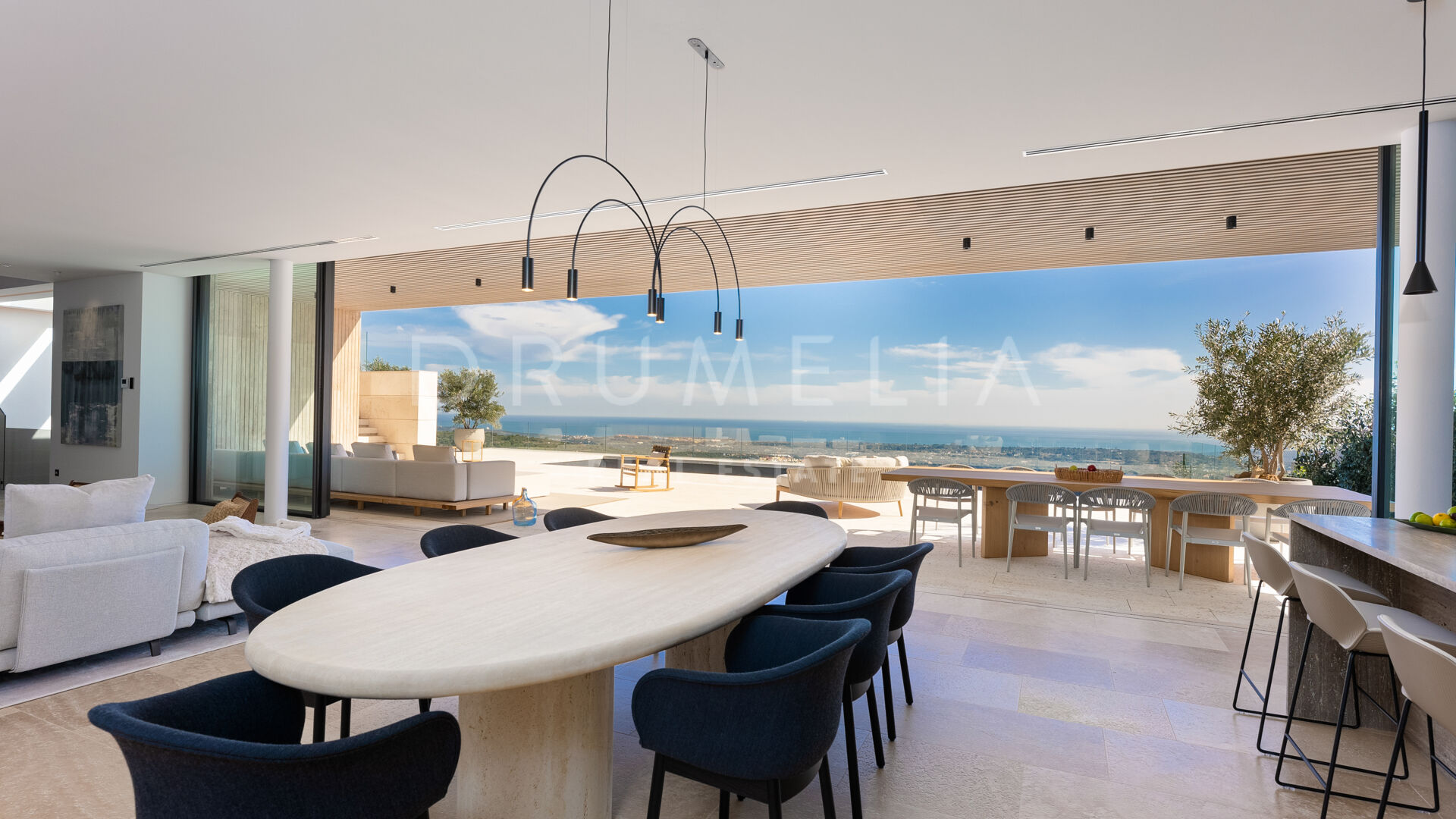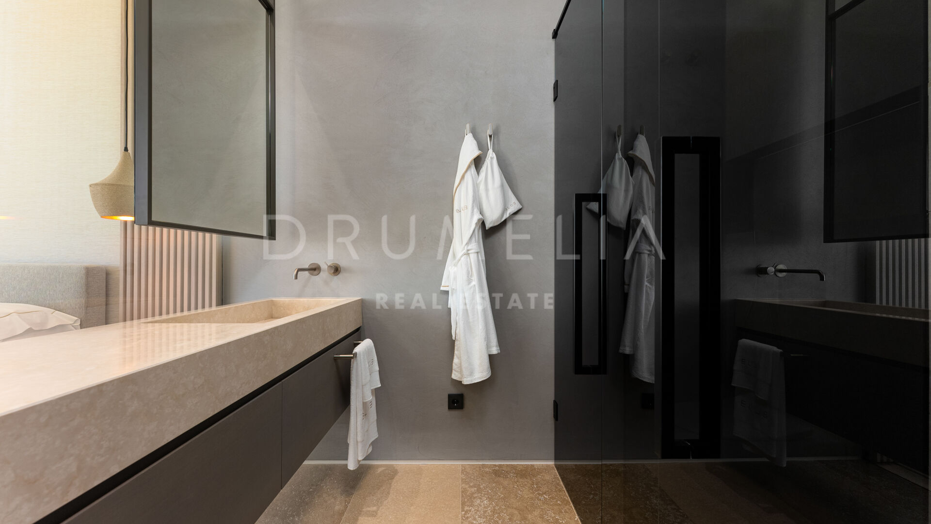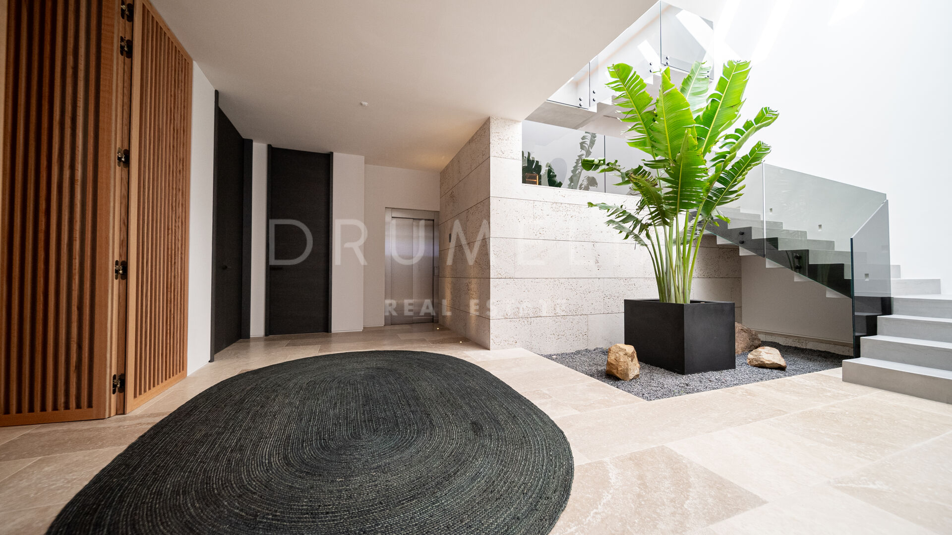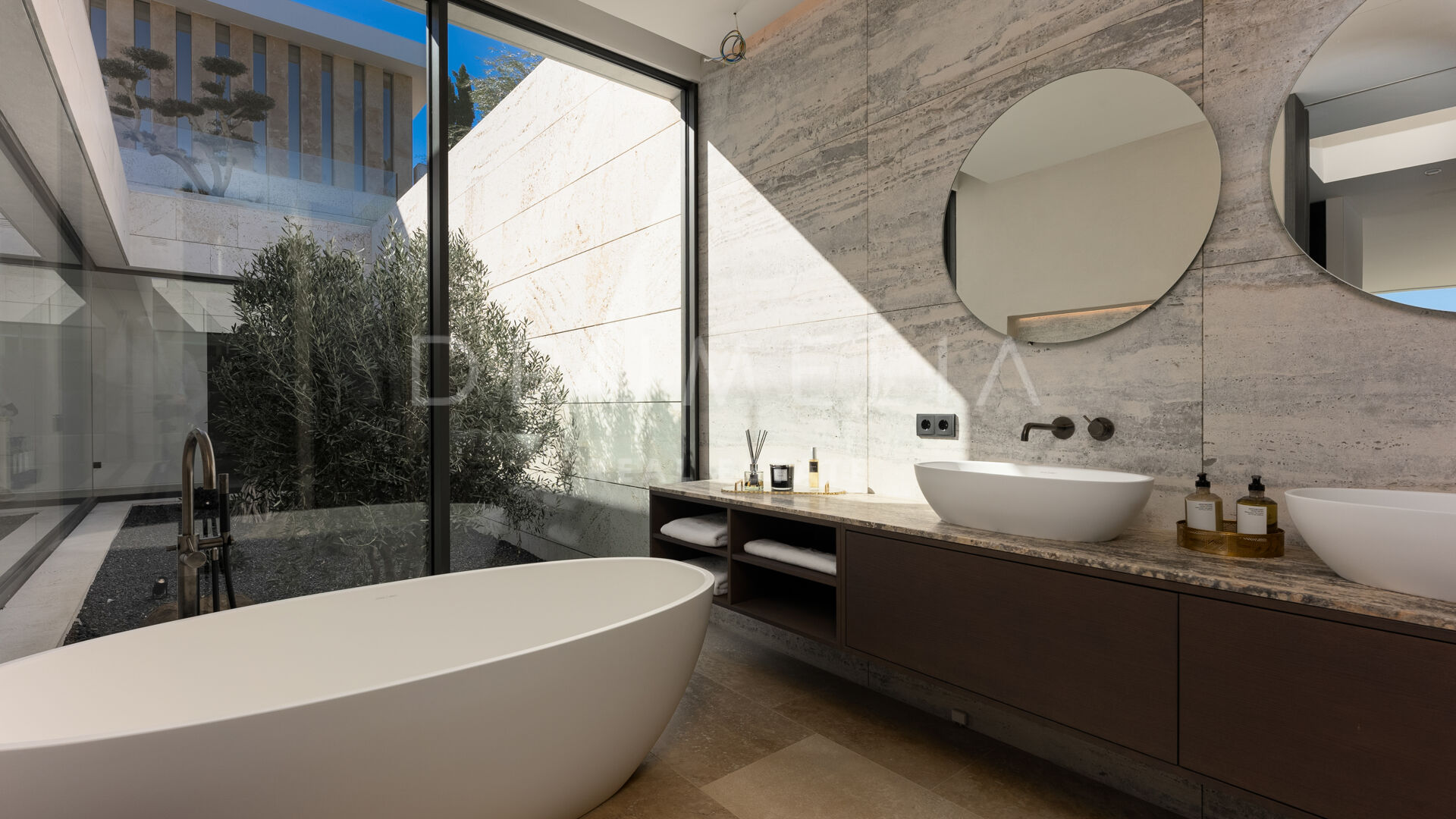 De villa heeft 5 slaapkamersuites, 7 badkamers en 2 toiletten, en 3 uitgestrekte terrassen van 495 m² met panoramisch uitzicht. Op de hoofdverdieping geeft de ruime en lichte woonkamer naadloos toegang tot het terras door de van vloer tot plafond geautomatiseerde panoramische ramen, en verder tot het 44 m² grote zwembad. De open keuken is volledig uitgerust met Gaggenau apparatuur en afgewerkt met een luxueus natuurstenen eiland. Op dit niveau logeren 3 Gastensuites, alle met directe toegang tot privé terrassen, en de indrukwekkende Hoofdsuite met een kleedkamer en een grijs geschuurde travertijnen badkamer met uitzicht op de privé patiotuin.