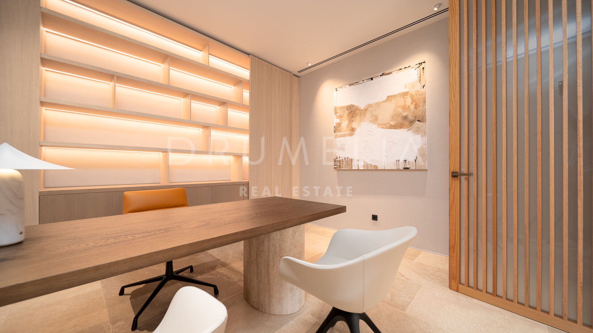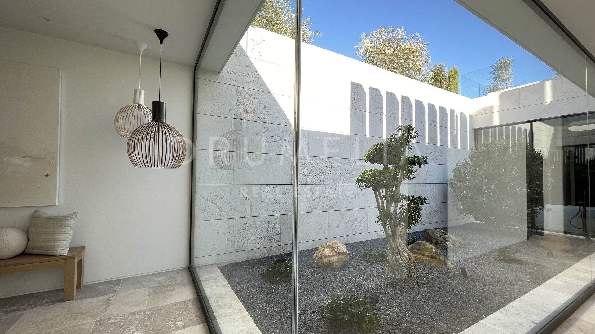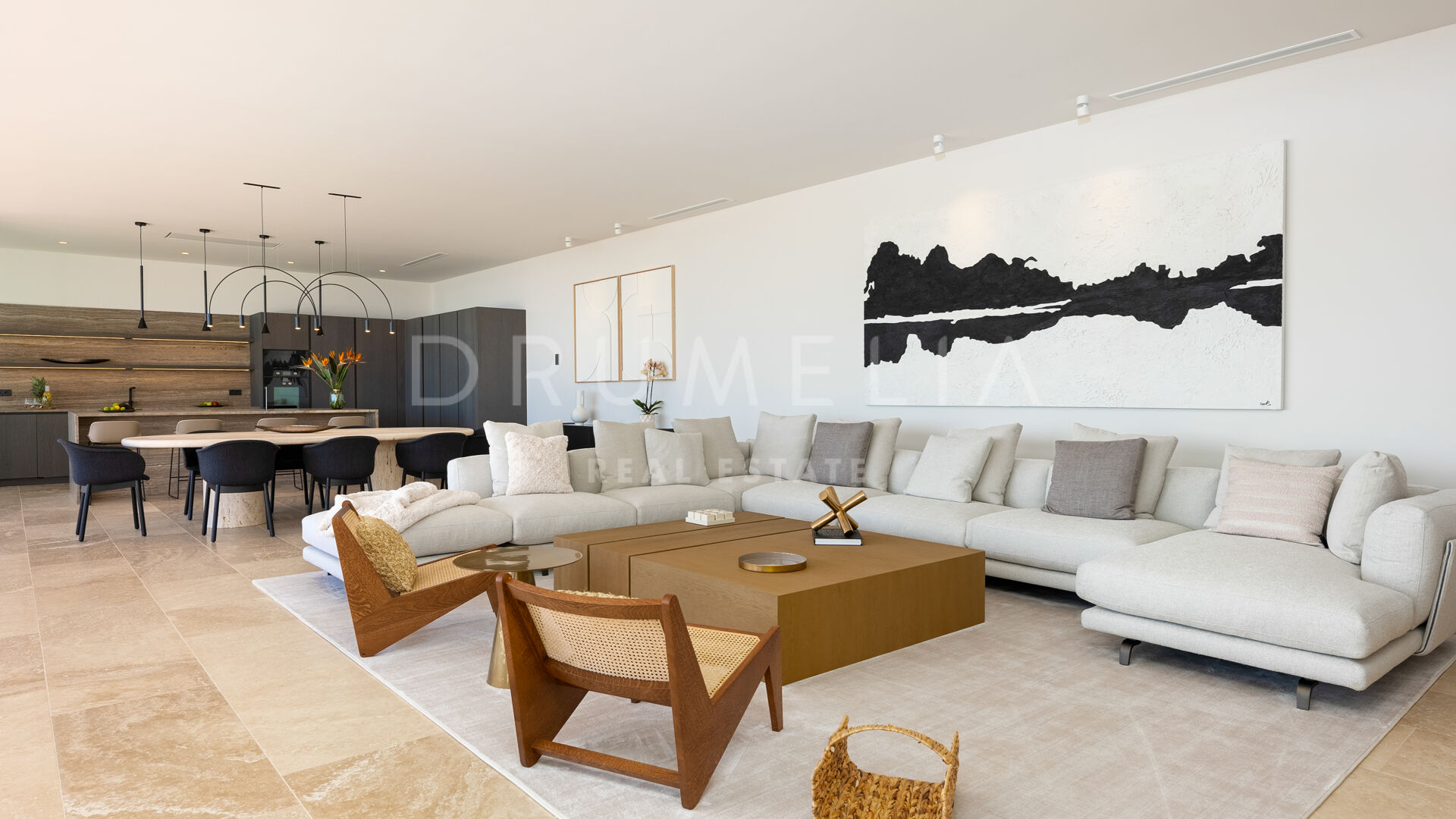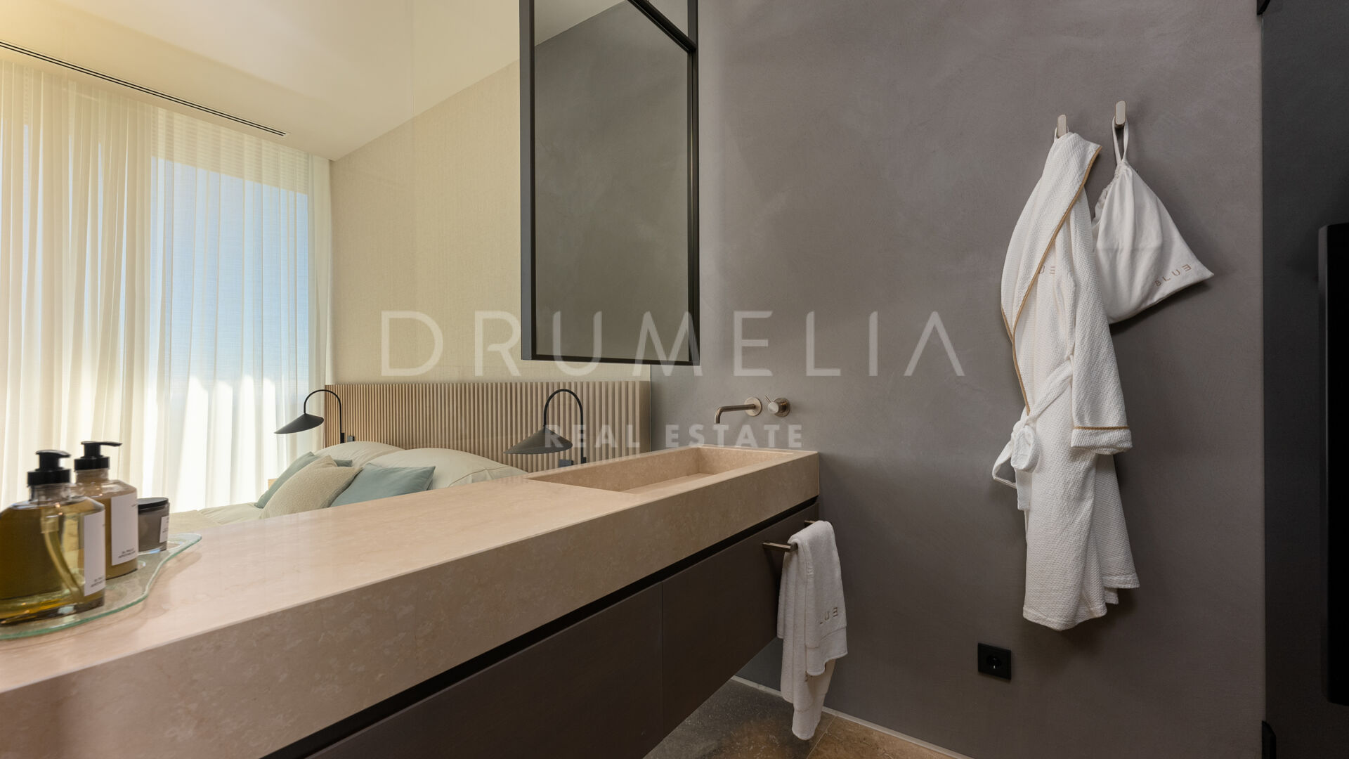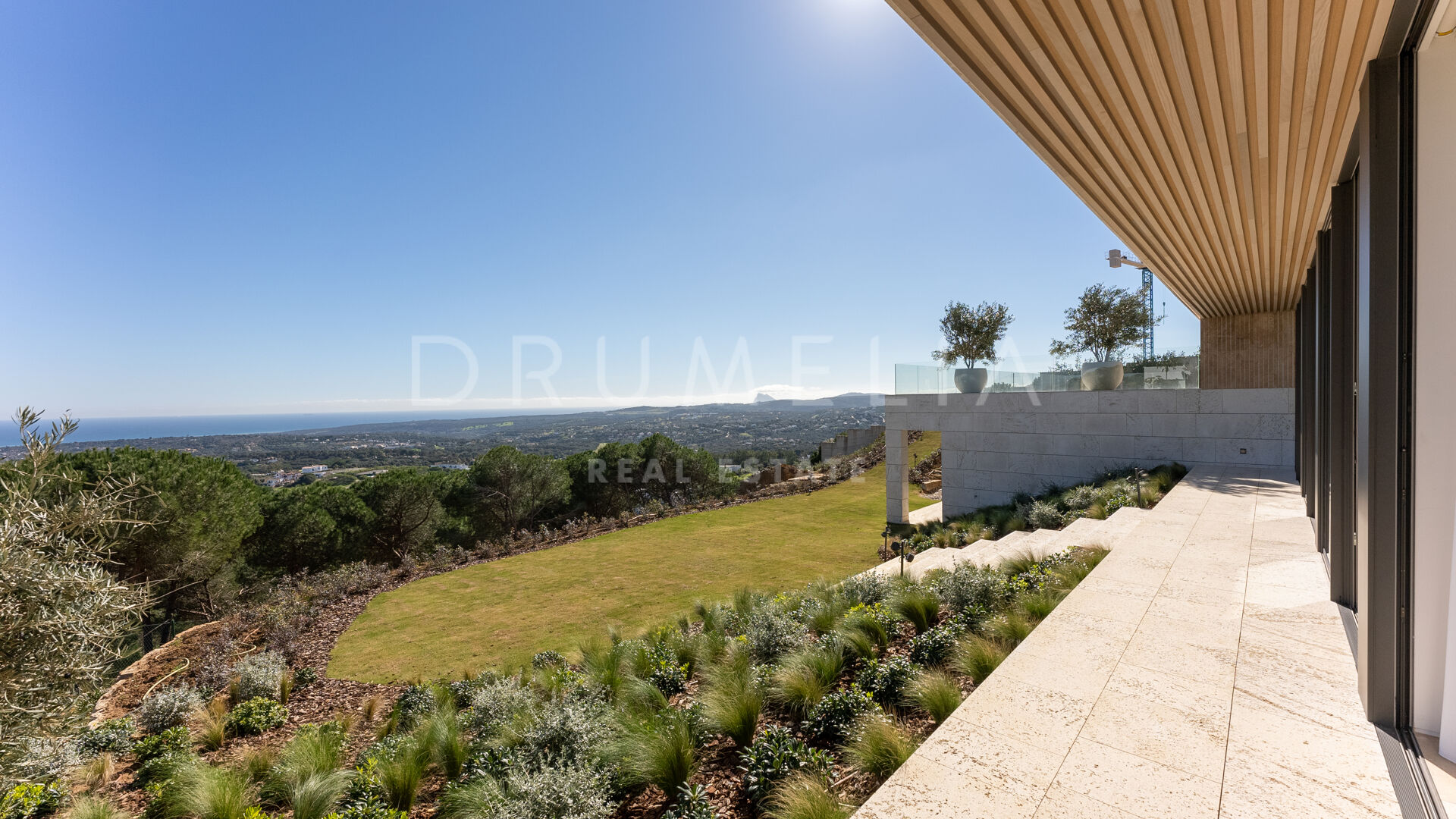 De villa heeft 5 slaapkamersuites, 7 badkamers en 2 toiletten, en 3 uitgestrekte terrassen van 495 m² met panoramisch uitzicht. Op de hoofdverdieping geeft de ruime en lichte woonkamer naadloos toegang tot het terras door de van vloer tot plafond geautomatiseerde panoramische ramen, en verder tot het 44 m² grote zwembad. De open keuken is volledig uitgerust met Gaggenau apparatuur en afgewerkt met een luxueus natuurstenen eiland. Op dit niveau logeren 3 Gastensuites, alle met directe toegang tot privé terrassen, en de indrukwekkende Hoofdsuite met een kleedkamer en een grijs geschuurde travertijnen badkamer met uitzicht op de privé patiotuin.